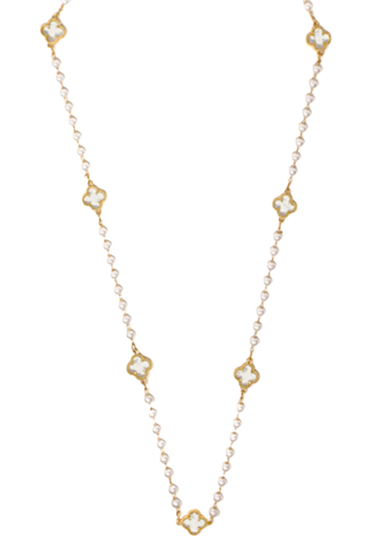 Elegant long necklace featuring lustrous pearls accented with delicate gold details. The Clover Station design combines timeless sophistication with modern versatility, perfect for layering or wearing solo. Each pearl is thoughtfully spaced along the chain, creating a refined look that transitions effortlessly from day to evening wear. The warm gold accents add a touch of luxury while complementing any skin tone. A timeless piece that elevates any wardrobe.