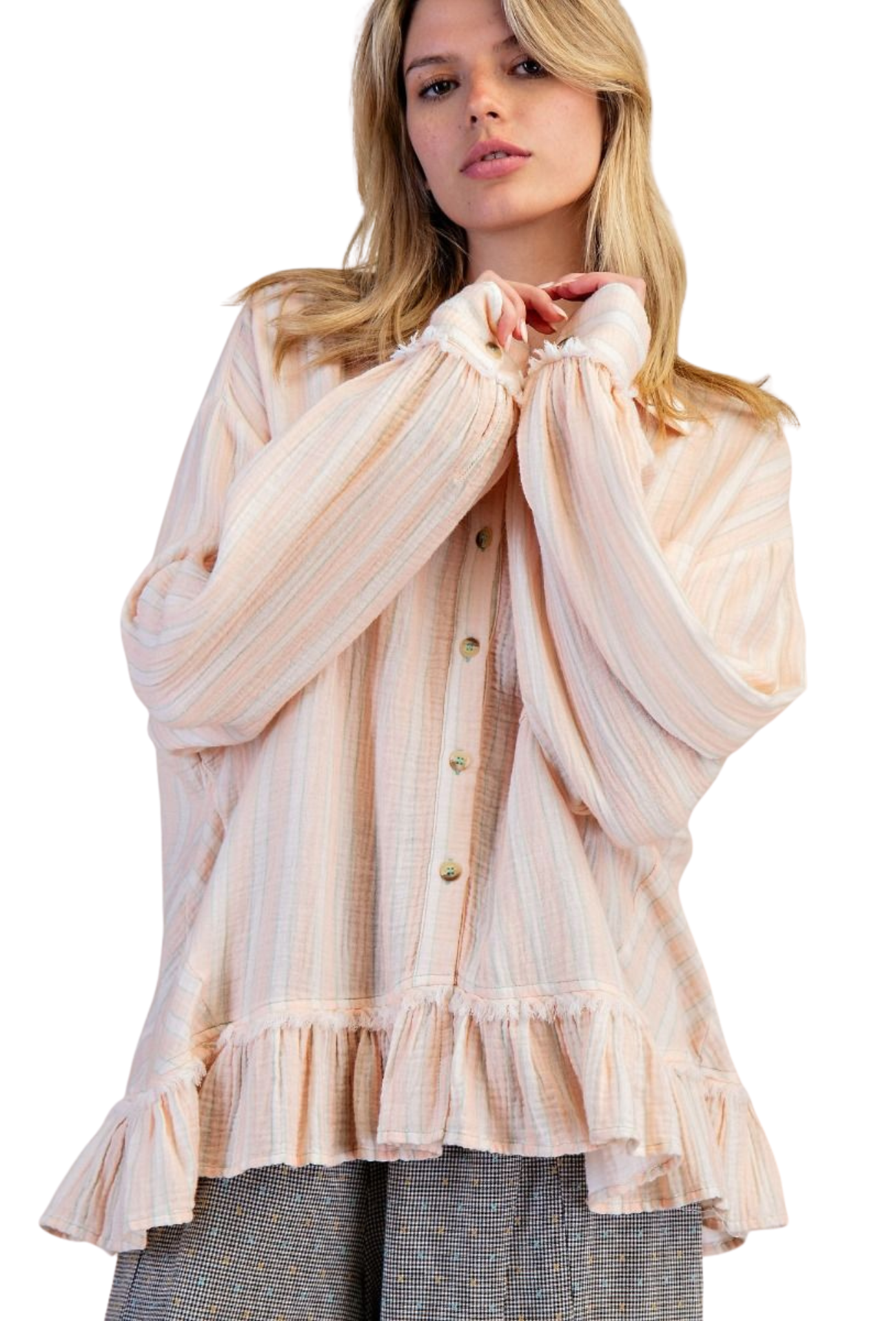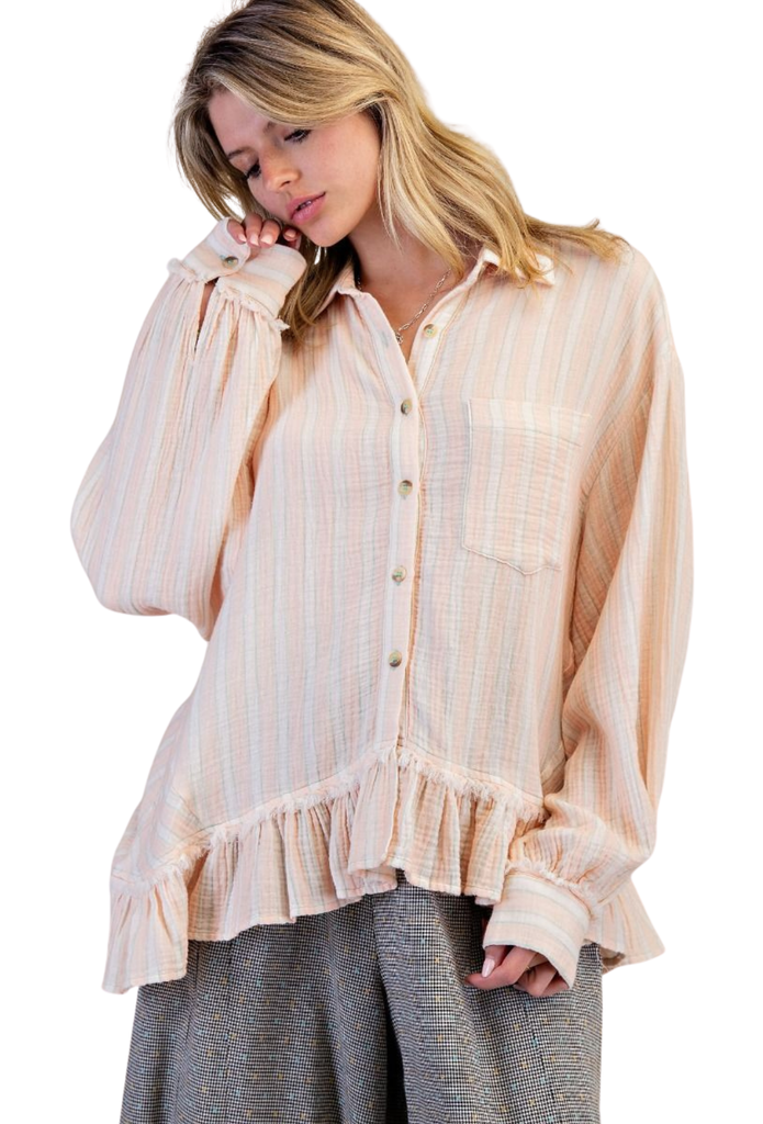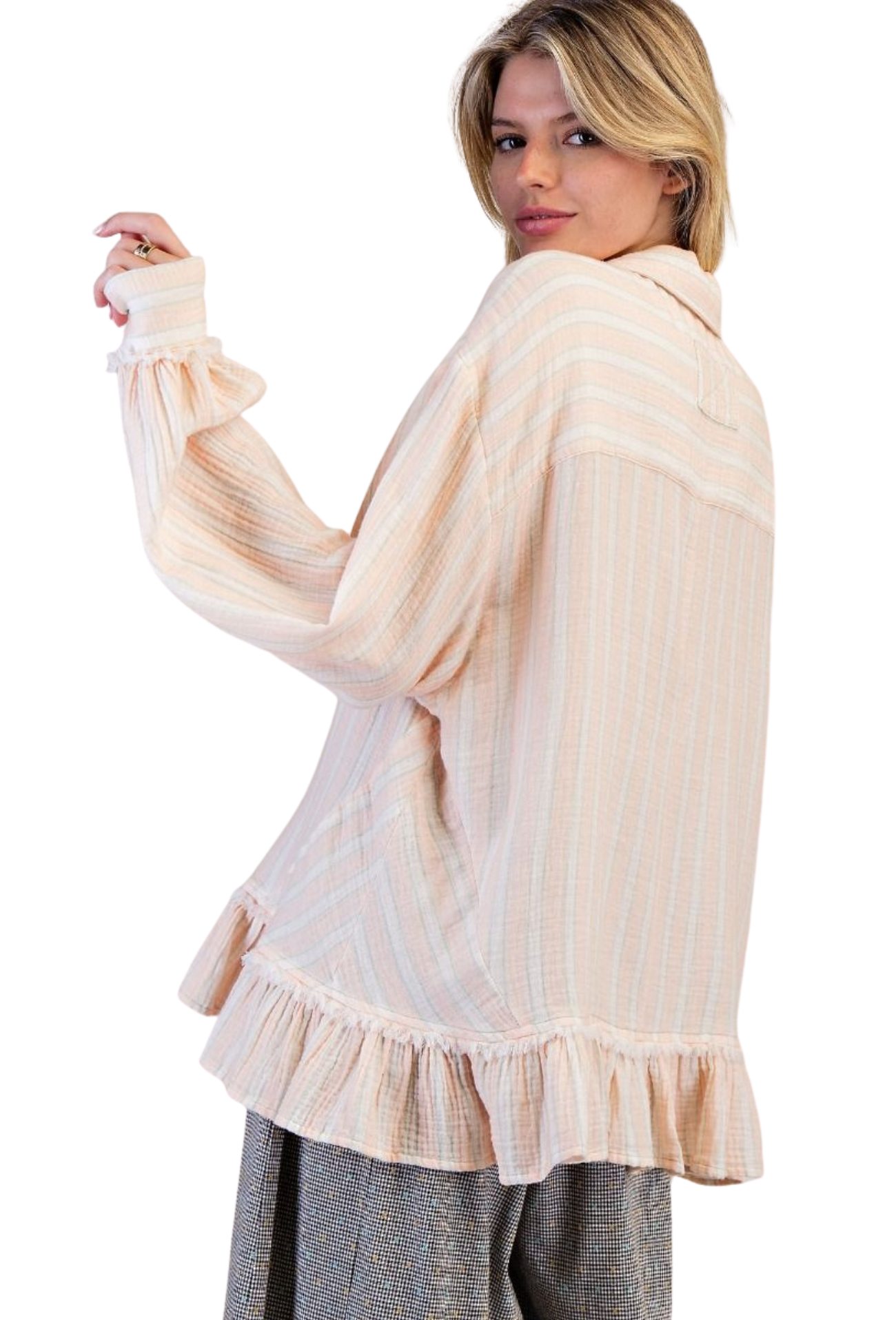 Elevate your everyday wardrobe with this charming button-down top featuring playful striped linen that breathes beautifully in any season. Delicate ruffles frame the neckline and cuffs, adding a touch of feminine elegance that transforms a simple silhouette into something truly special. The lightweight linen fabric keeps you cool and comfortable while the classic striped pattern pairs effortlessly with your favorite bottoms. Perfect for casual outings or dressed up for brunch, this versatile piece is the guest-list essential you didn't know you needed.