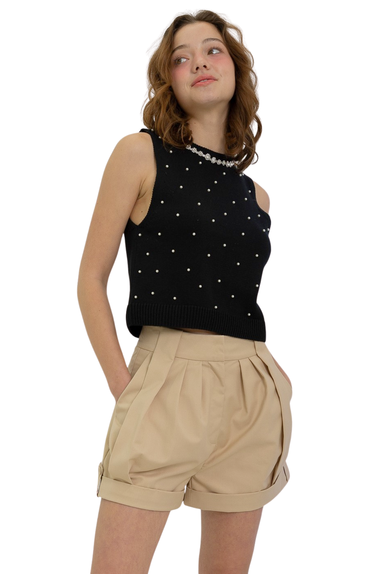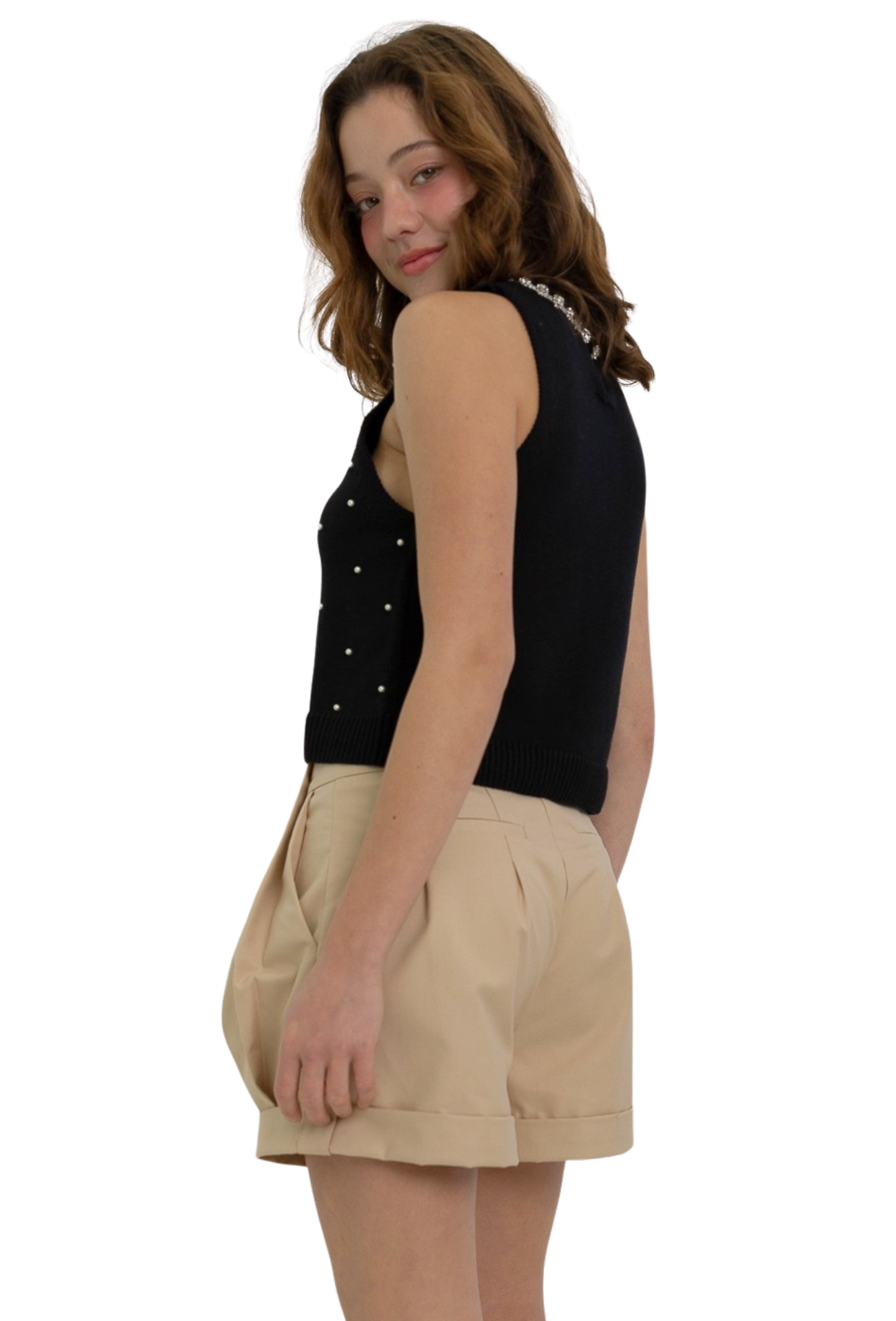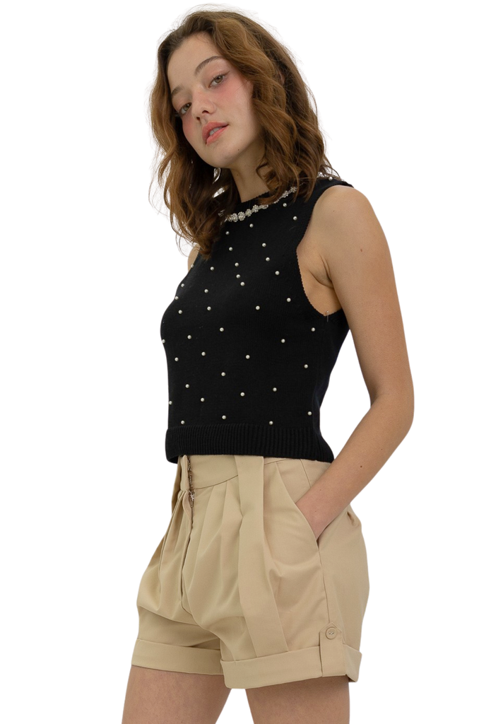 Elevate your casual wardrobe with this sophisticated knit tank top, featuring an elegant jeweled neckline adorned with lustrous pearls. Perfect for brunch outings or elevated everyday styling, this piece effortlessly transitions from day to night. The chic pearl embellishment adds a touch of refined glamour without sacrificing comfort, making it an essential layering piece for any fashion-forward wardrobe. Versatile, timeless, and undeniably elegant.