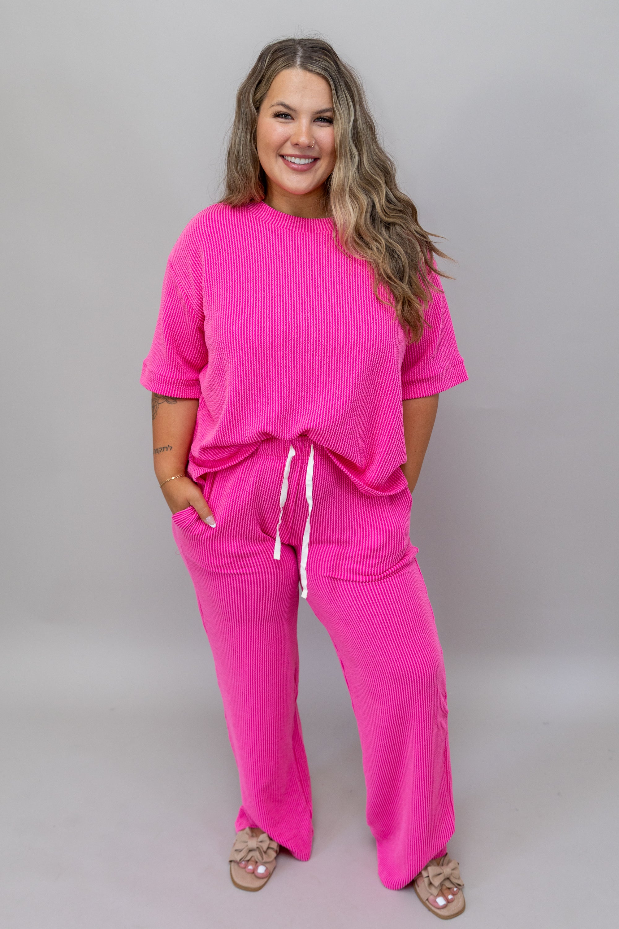 - Mia is wearing a size Large (Hot Pink & Navy)