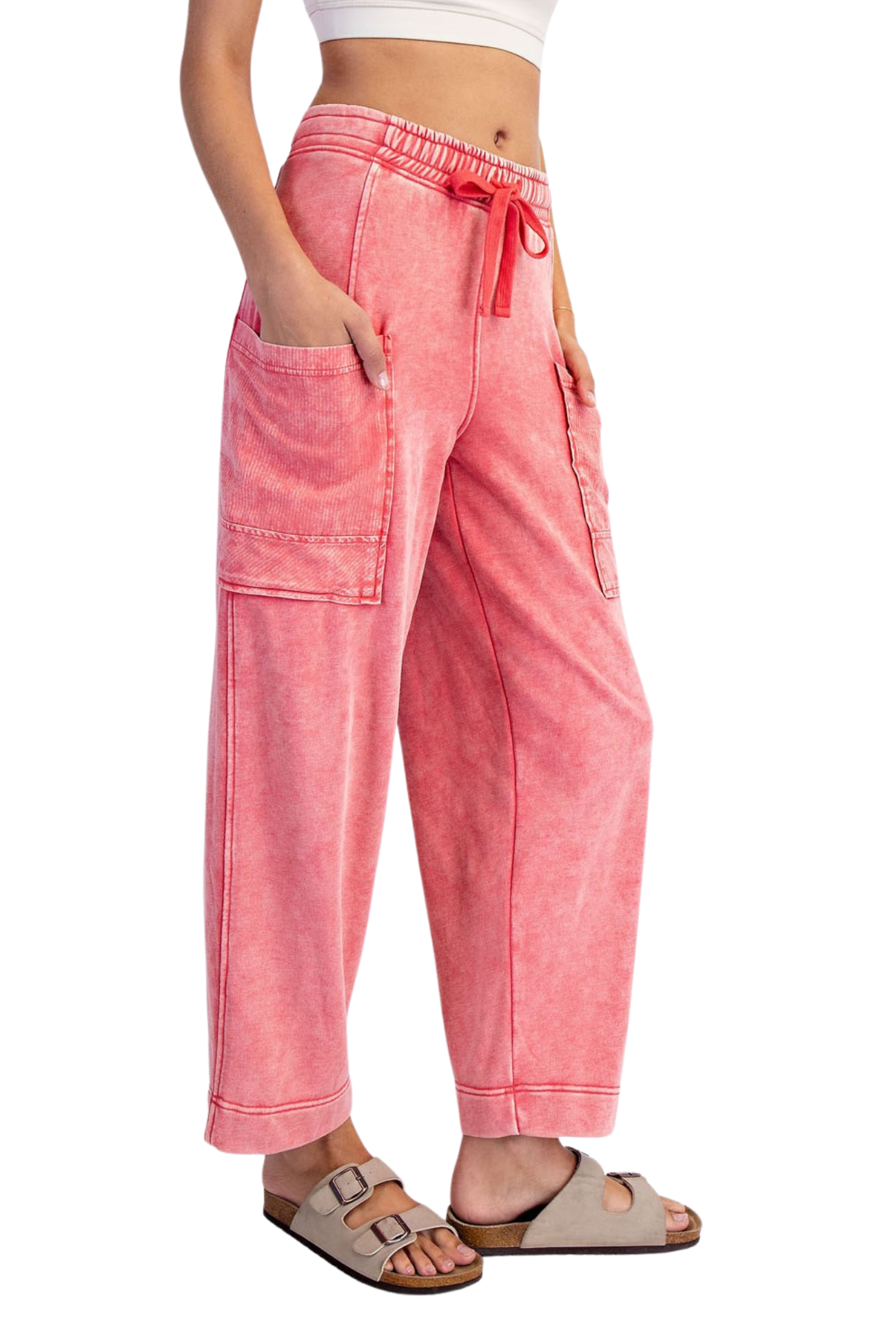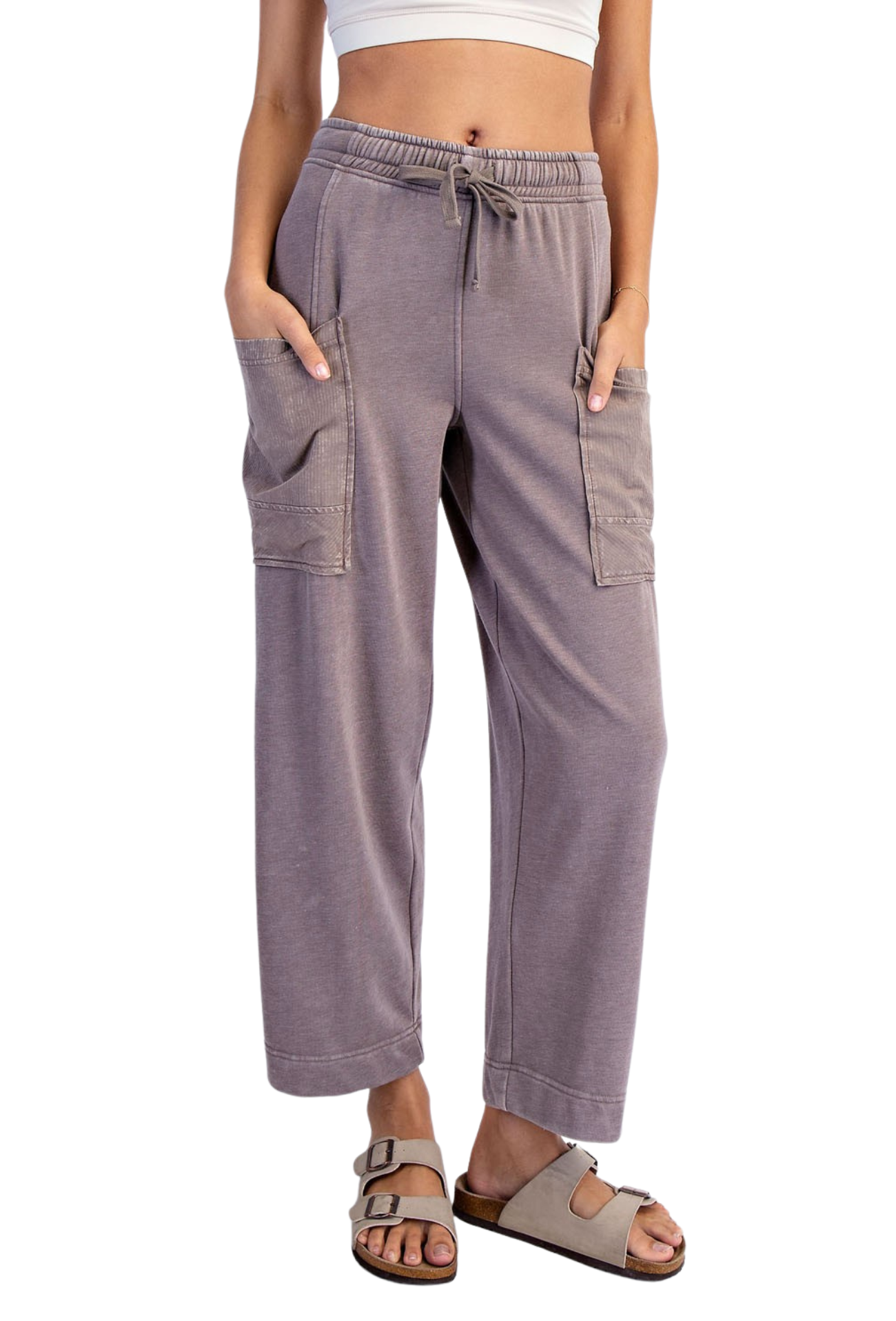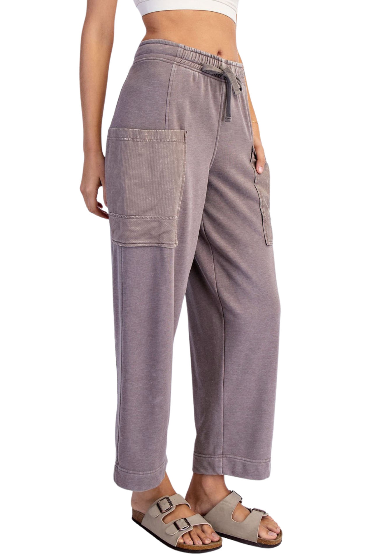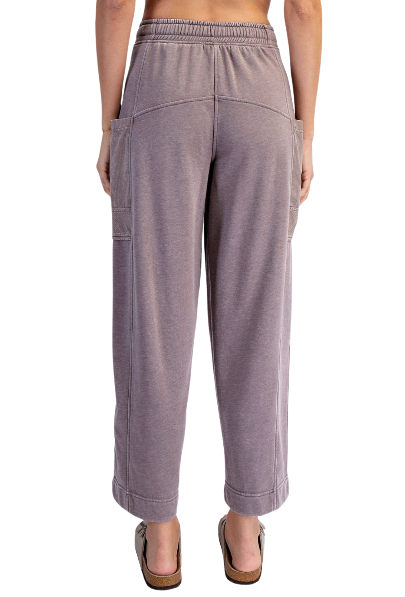 Slip into comfort with our You Belong Here Pants, crafted from soft mineral washed French terry that moves with you. The breathable, lightweight fabric keeps you cool throughout the day, while the relaxed fit and mid-rise waistband offer effortless style. Features include an adjustable elastic waistband for a personalized fit, ribbed cotton patched pockets for added detail, and a perfect 28" ankle length. Whether you're running errands or lounging at home, these pants deliver the perfect balance of comfort and casual sophistication.