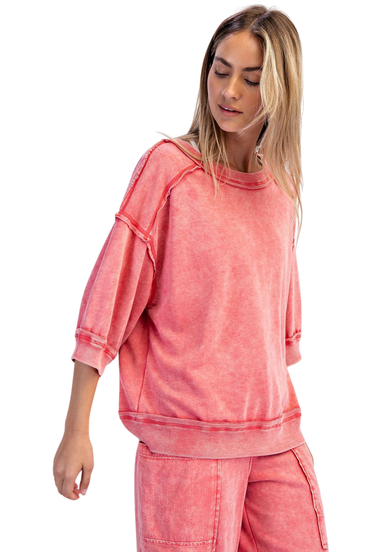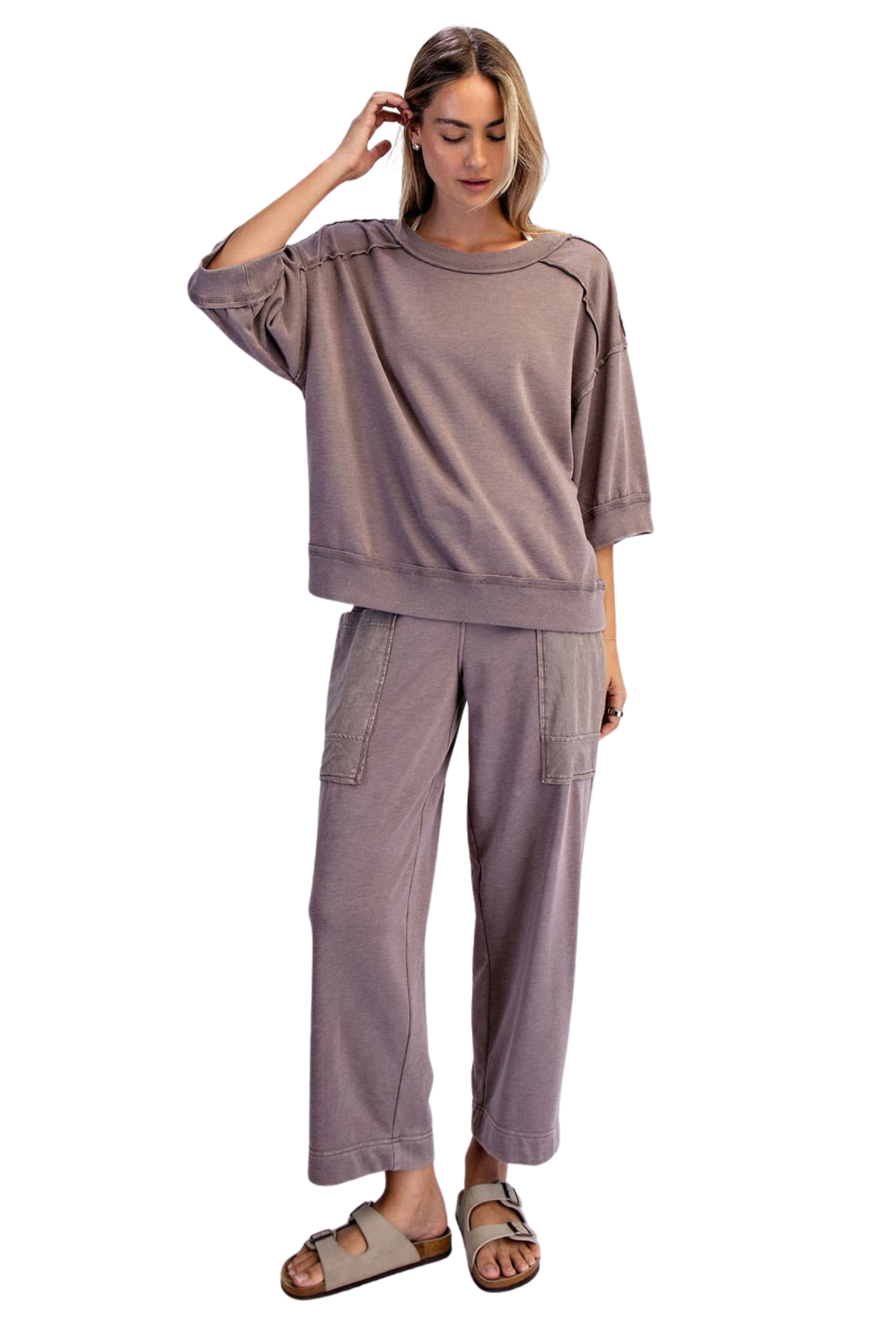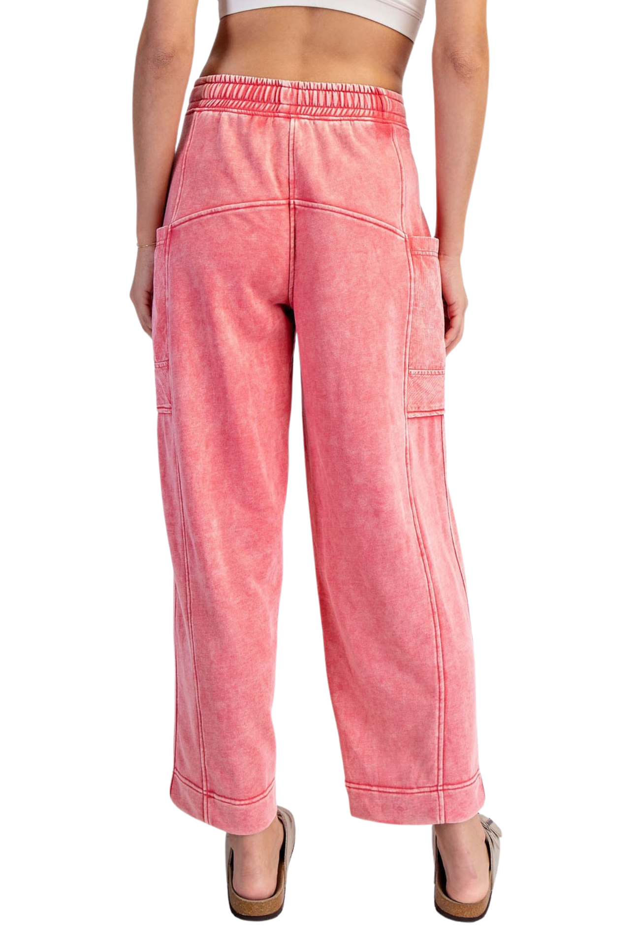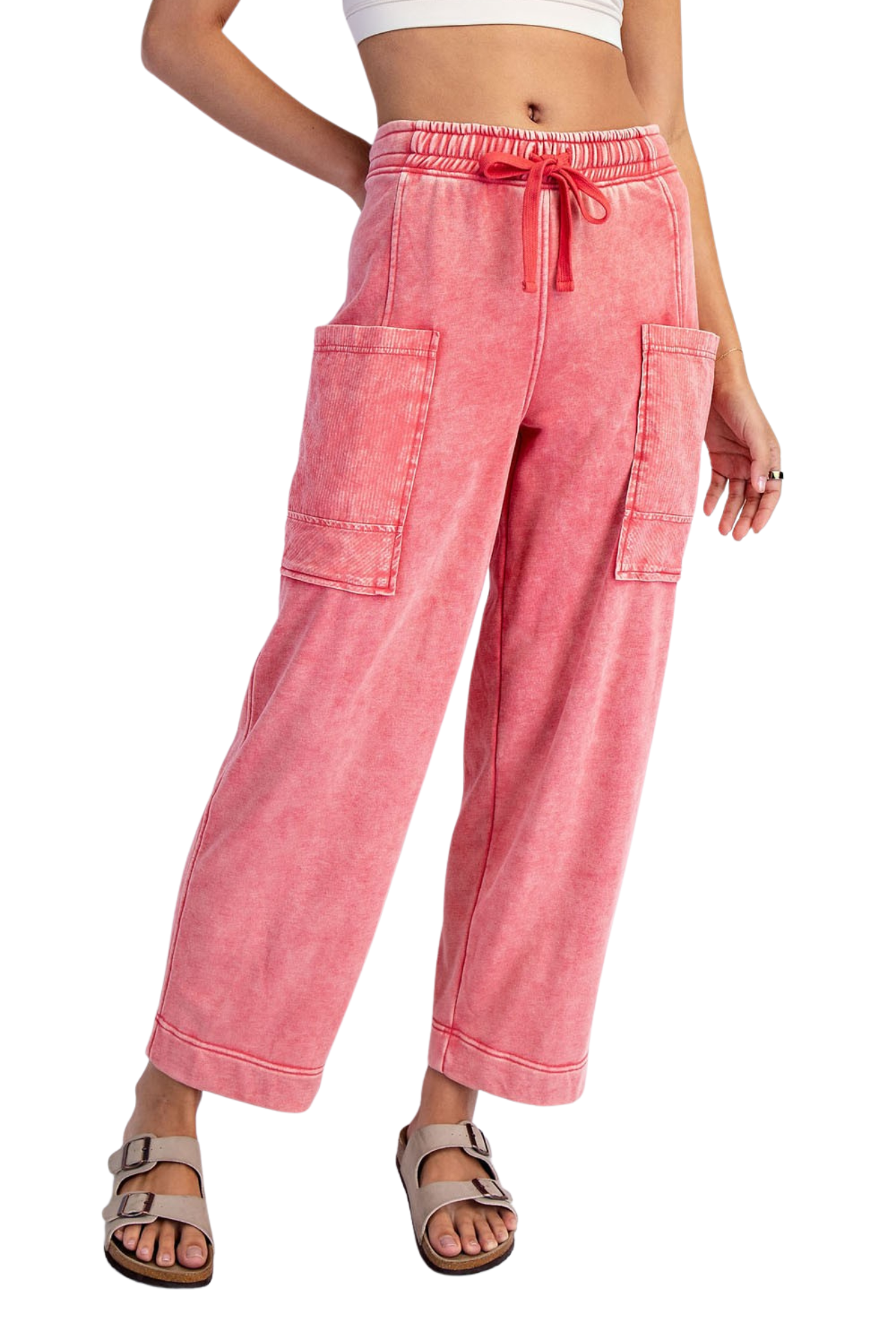 Slip into comfort with our You Belong Here Pants, crafted from soft mineral washed French terry that moves with you. The breathable, lightweight fabric keeps you cool throughout the day, while the relaxed fit and mid-rise waistband offer effortless style. Features include an adjustable elastic waistband for a personalized fit, ribbed cotton patched pockets for added detail, and a perfect 28" ankle length. Whether you're running errands or lounging at home, these pants deliver the perfect balance of comfort and casual sophistication.