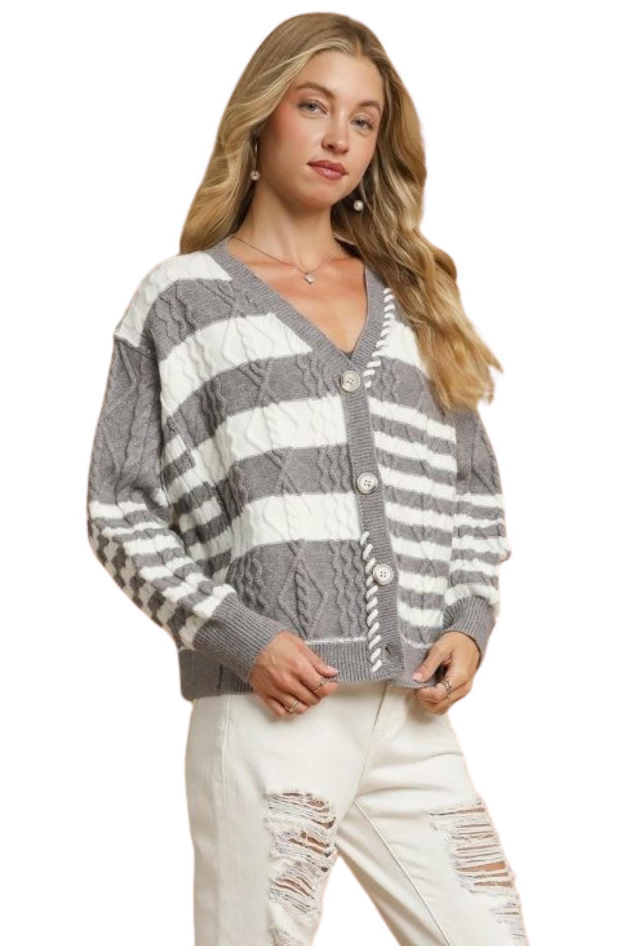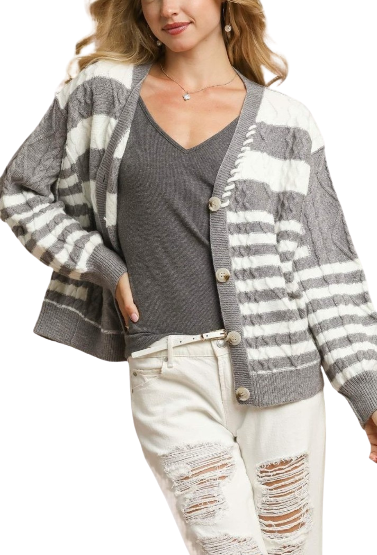 The Right At Home Cardigan brings effortless style to your everyday wardrobe. This striped knit piece features a classic button closure for easy layering over your favorite tees and dresses. Perfect for transitional seasons, it adds dimension and warmth without the bulk. Whether you're dressing up or keeping it casual, this versatile cardigan becomes an instant go-to for creating polished, put-together looks that feel authentically you.