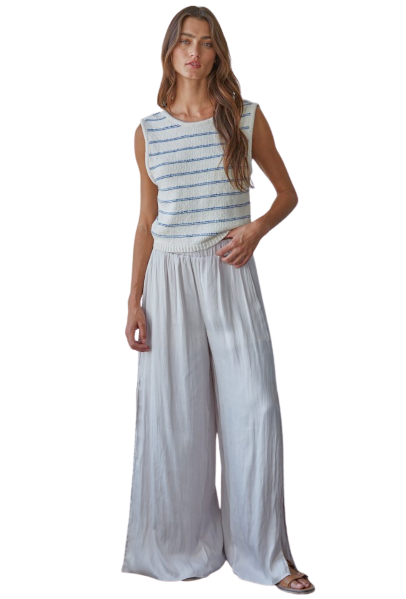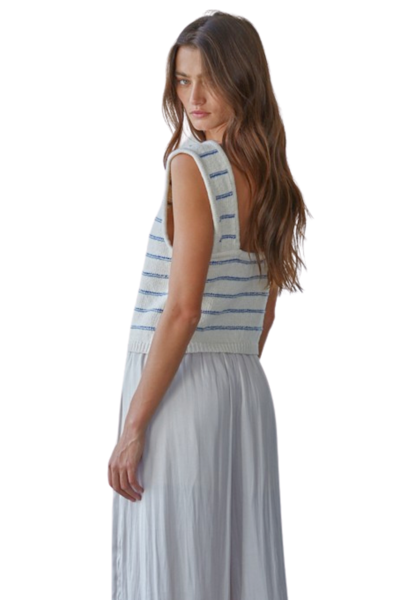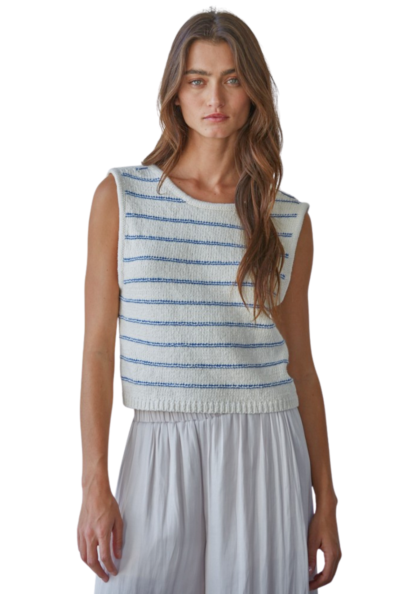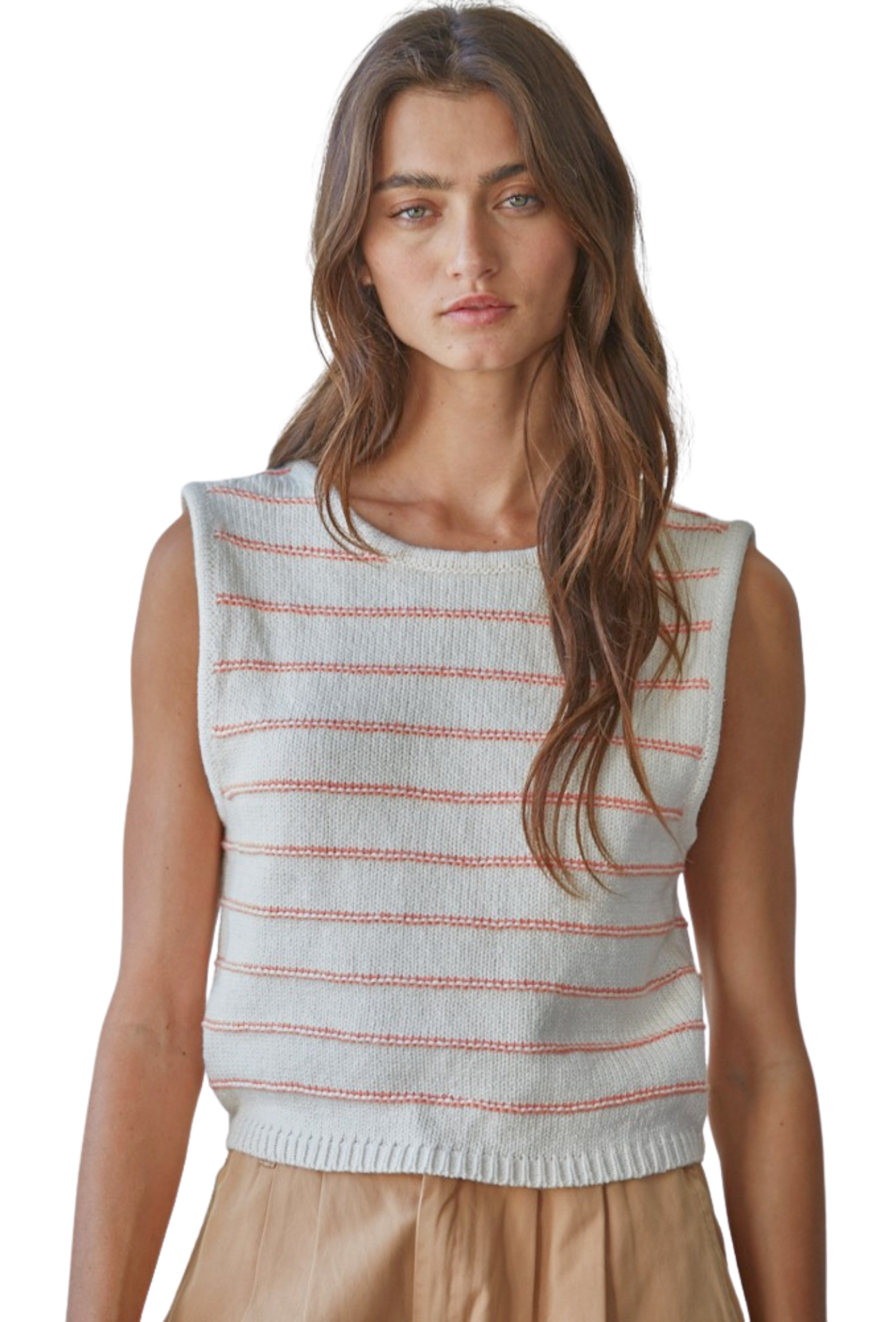 Embrace effortless style with this striped knit tank that combines contemporary design with everyday comfort. The semi-cropped silhouette flatters your frame while the low back adds an unexpected touch of allure—perfect for layering or wearing solo. Crafted from quality knit fabric, this versatile piece transitions seamlessly from casual outings to weekend adventures. Whether you're dressing up or keeping it relaxed, this tank delivers the perfect balance of sophistication and ease that modern wardrobes demand.