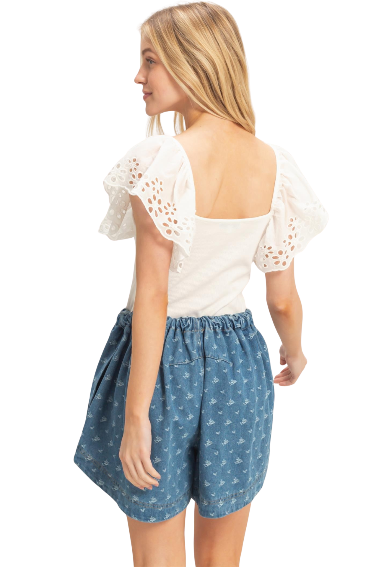 Step into the season with this breezy crop top that combines timeless details with modern appeal. The square neckline frames your shoulders beautifully while delicate eyelet puff sleeves add a playful, romantic flair. Crafted from ribbed fabric for a smooth, supportive fit, this piece transitions seamlessly from casual days to evening outings. Style it high-waisted or layered for endless versatility!