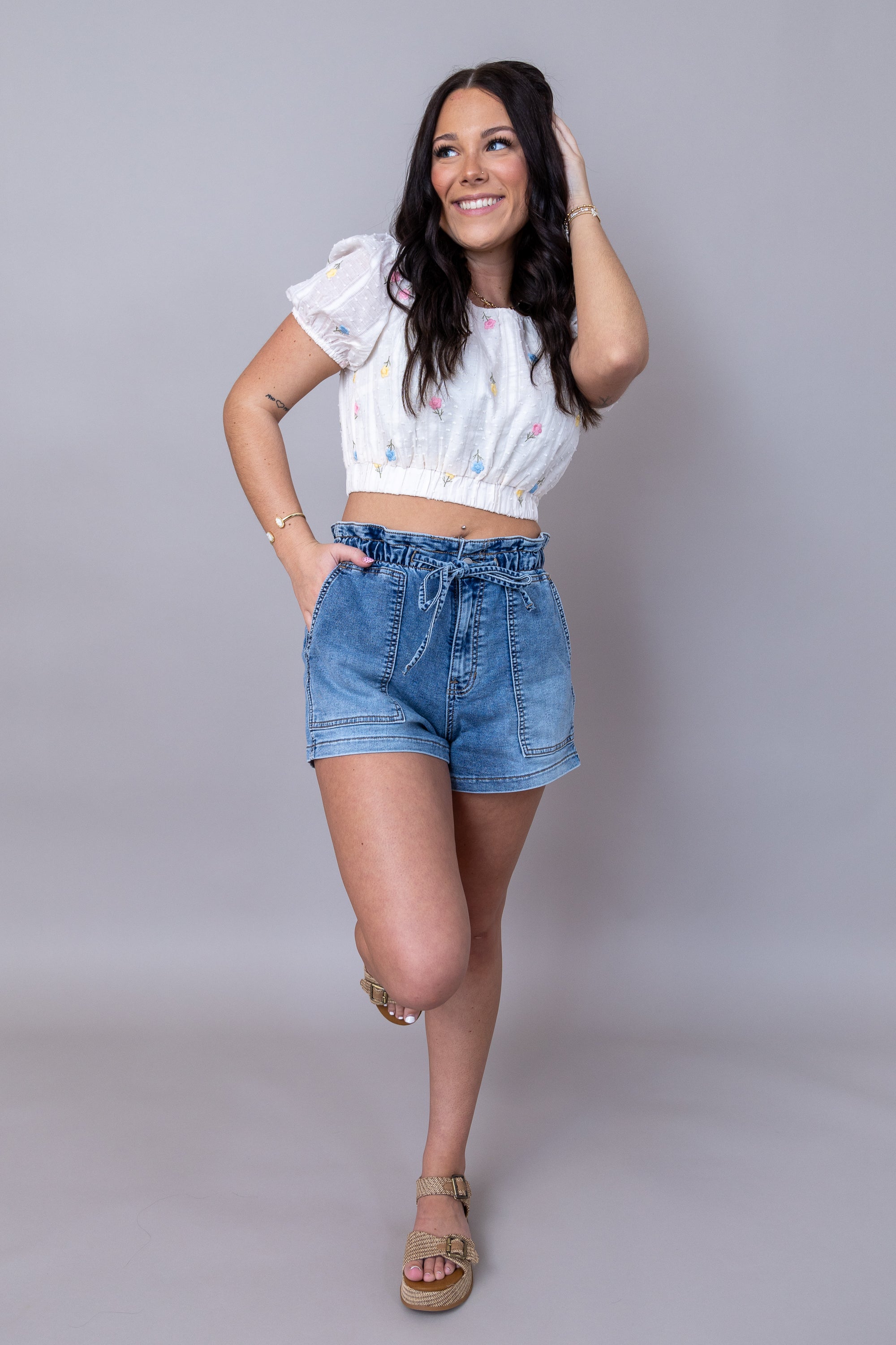 Transition into spring with shorts that deliver both style and practicality. These mid-rise denim shorts feature a drawstring elastic waist that adapts to your body for all-day comfort, while patch pockets provide convenient storage without bulk. Bring in the spring weather in style!