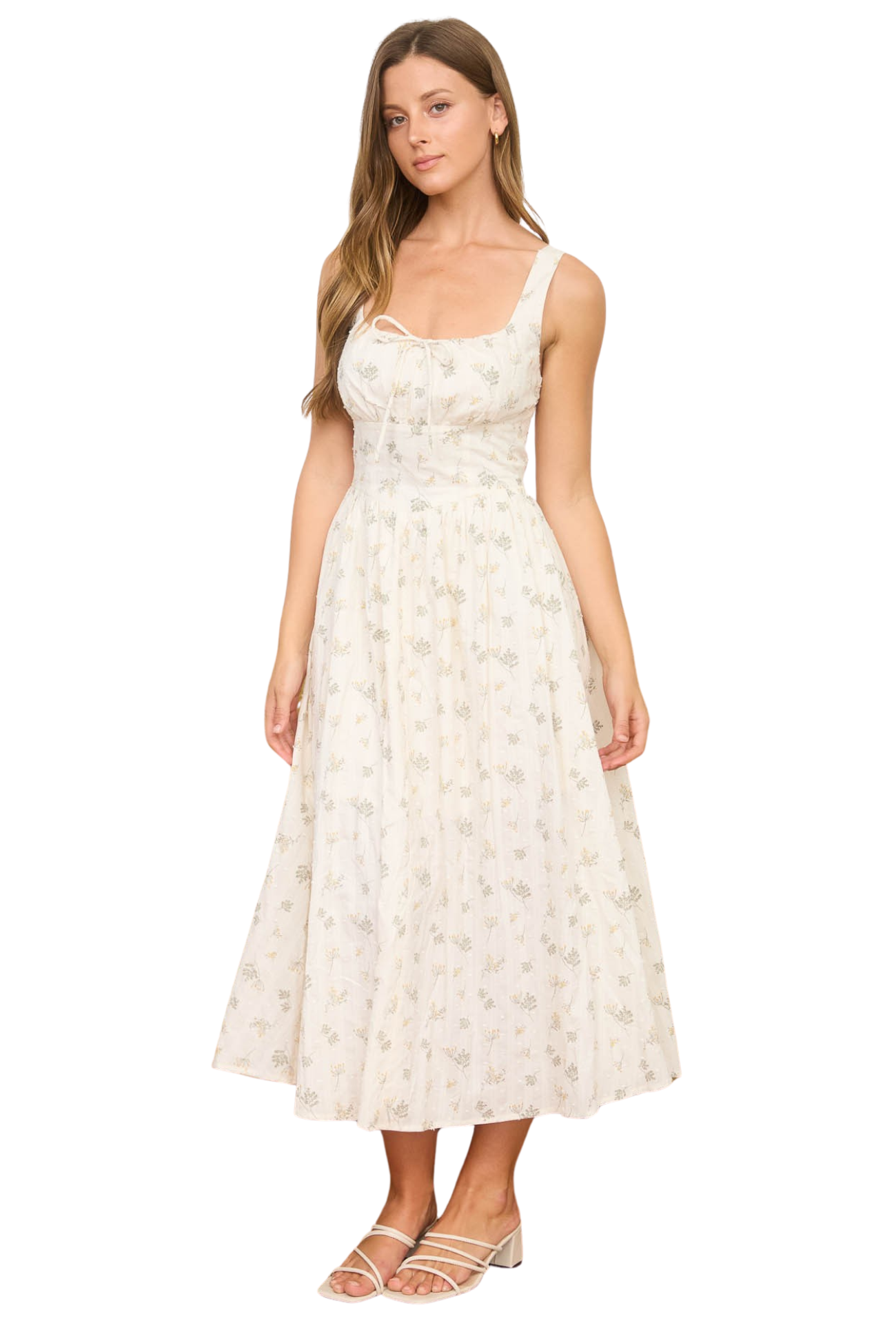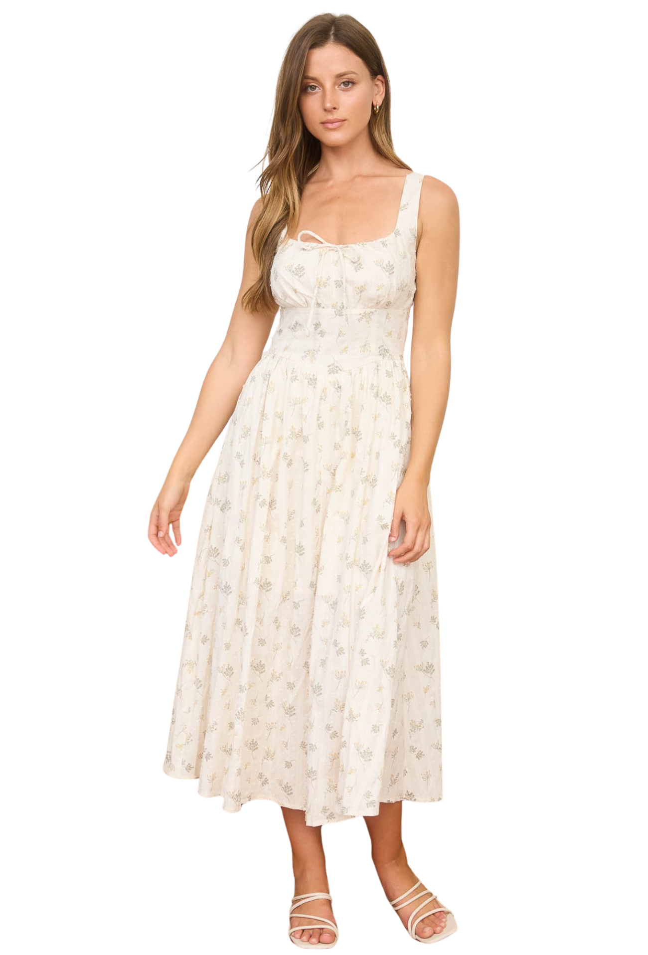 Embrace effortless elegance with this dainty floral midi dress, designed to capture the essence of spring. The adjustable straps ensure a personalized fit that flatters your frame, while the structured corset waist creates a refined silhouette that accentuates your curves beautifully. Perfect for garden parties, brunch dates, or any occasion calling for understated sophistication. This versatile piece transitions seamlessly from day to evening, making it a wardrobe essential you'll reach for again and again.