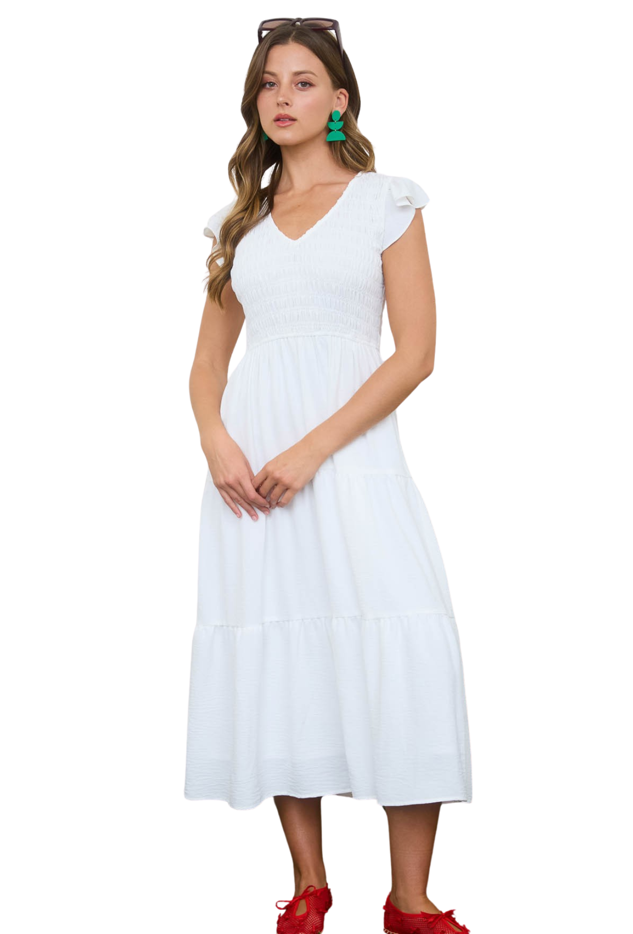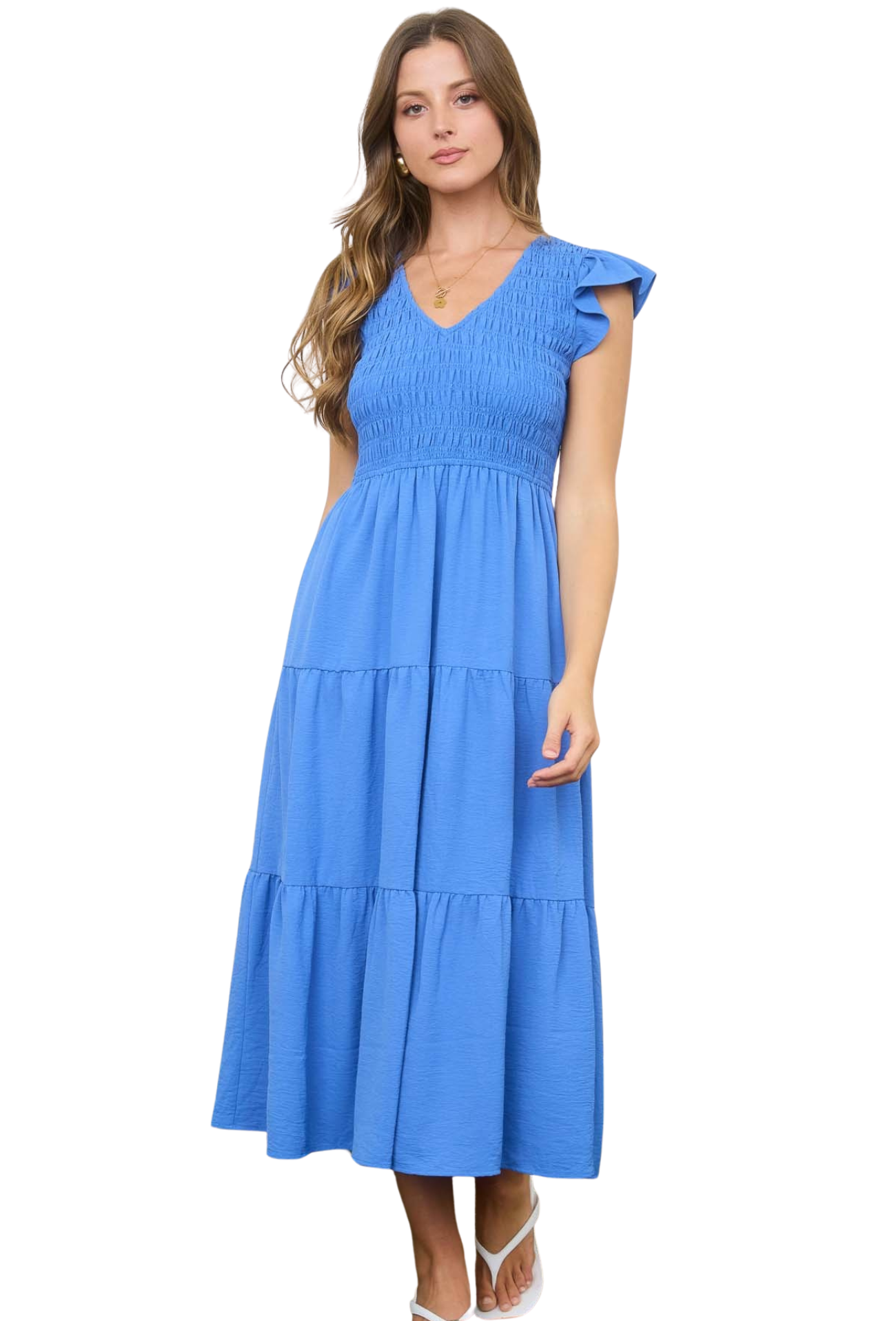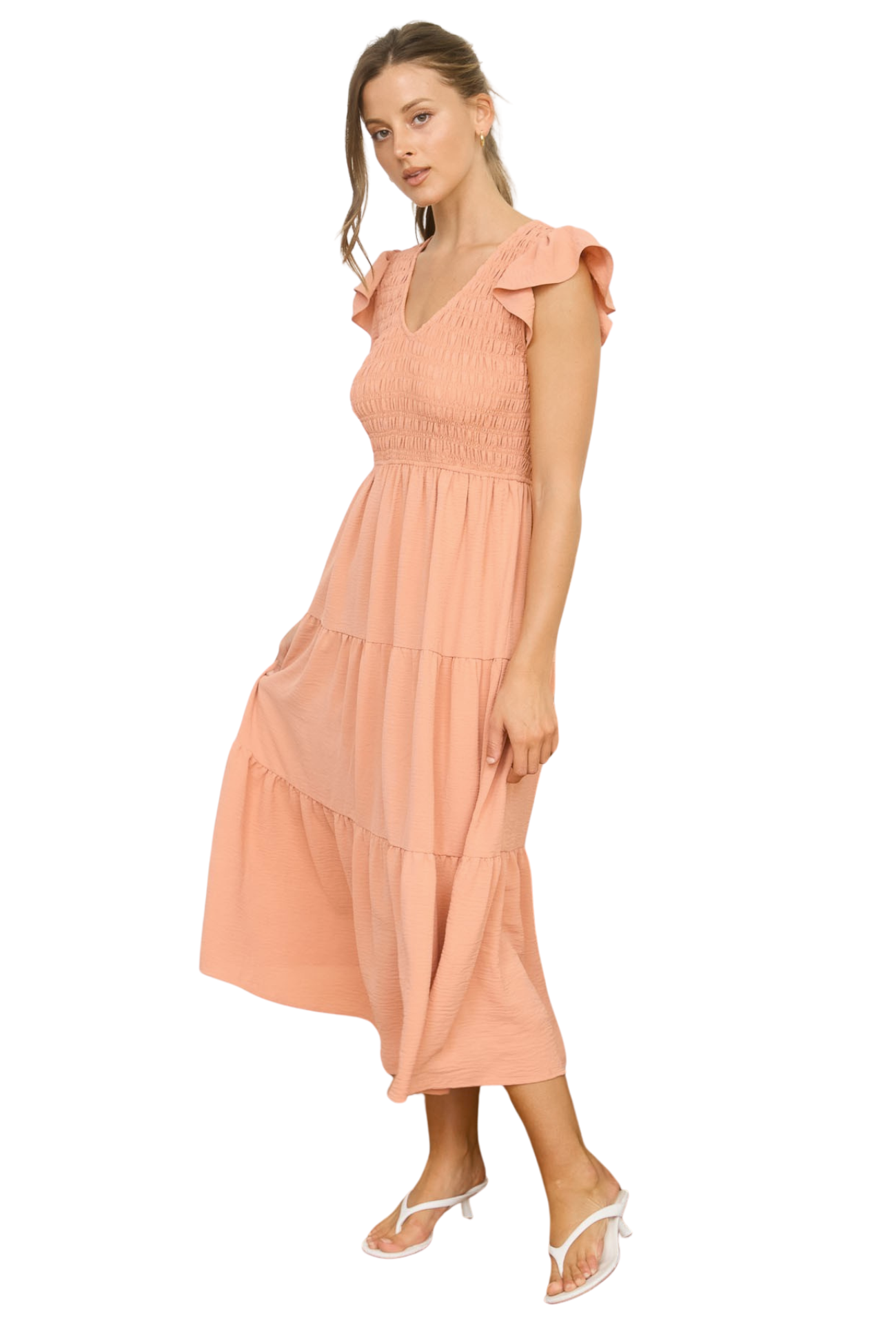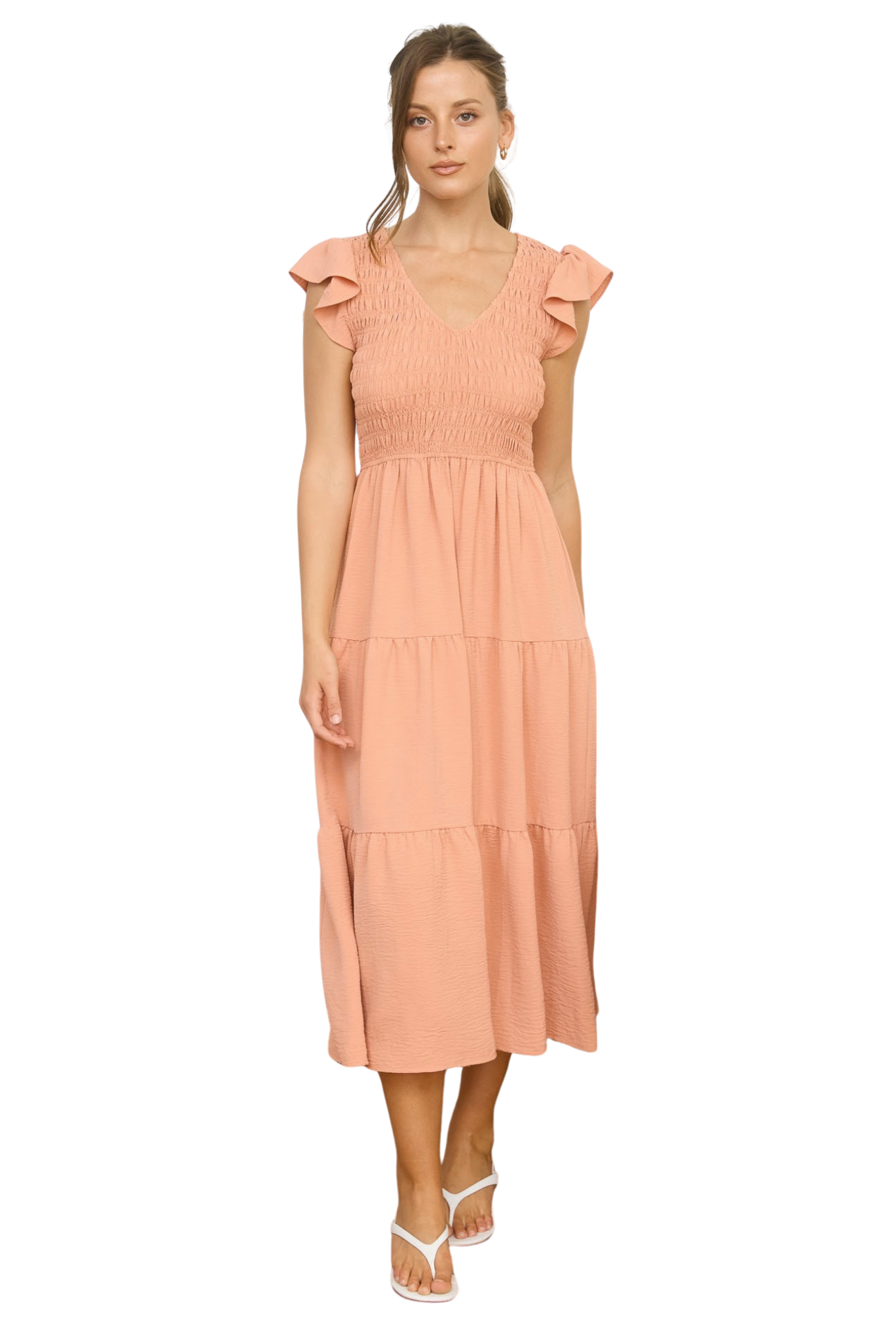 Embrace effortless elegance with this versatile midi dress, designed for those who appreciate timeless style. The flattering v-neck draws attention upward while the ruched chest detail creates a sculpted silhouette that flatters every figure. Tiered layers add movement and dimension, perfect for spring days when you want to look polished without trying too hard. Transition seamlessly from brunch to evening plans—this is the one dress that does it all.
