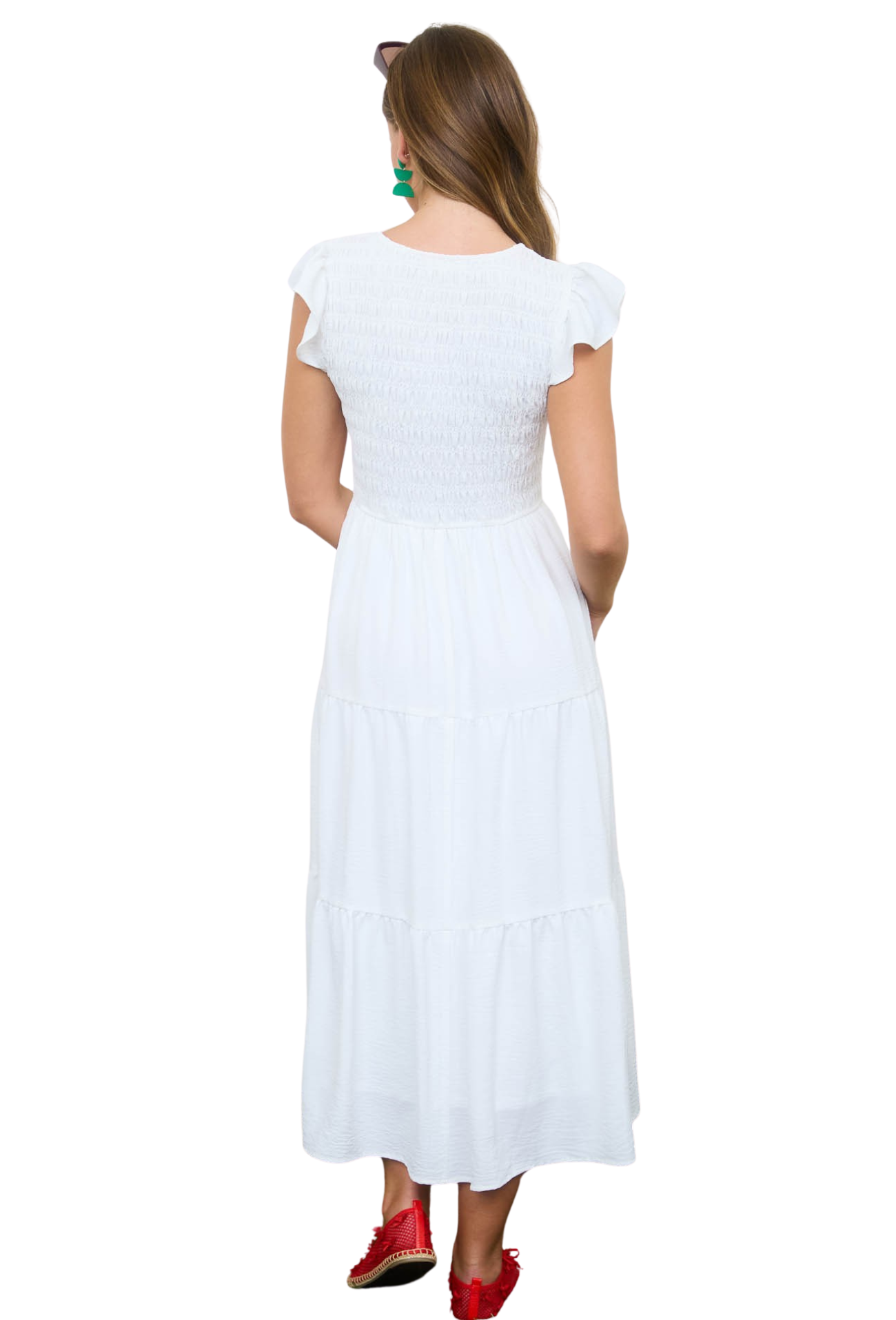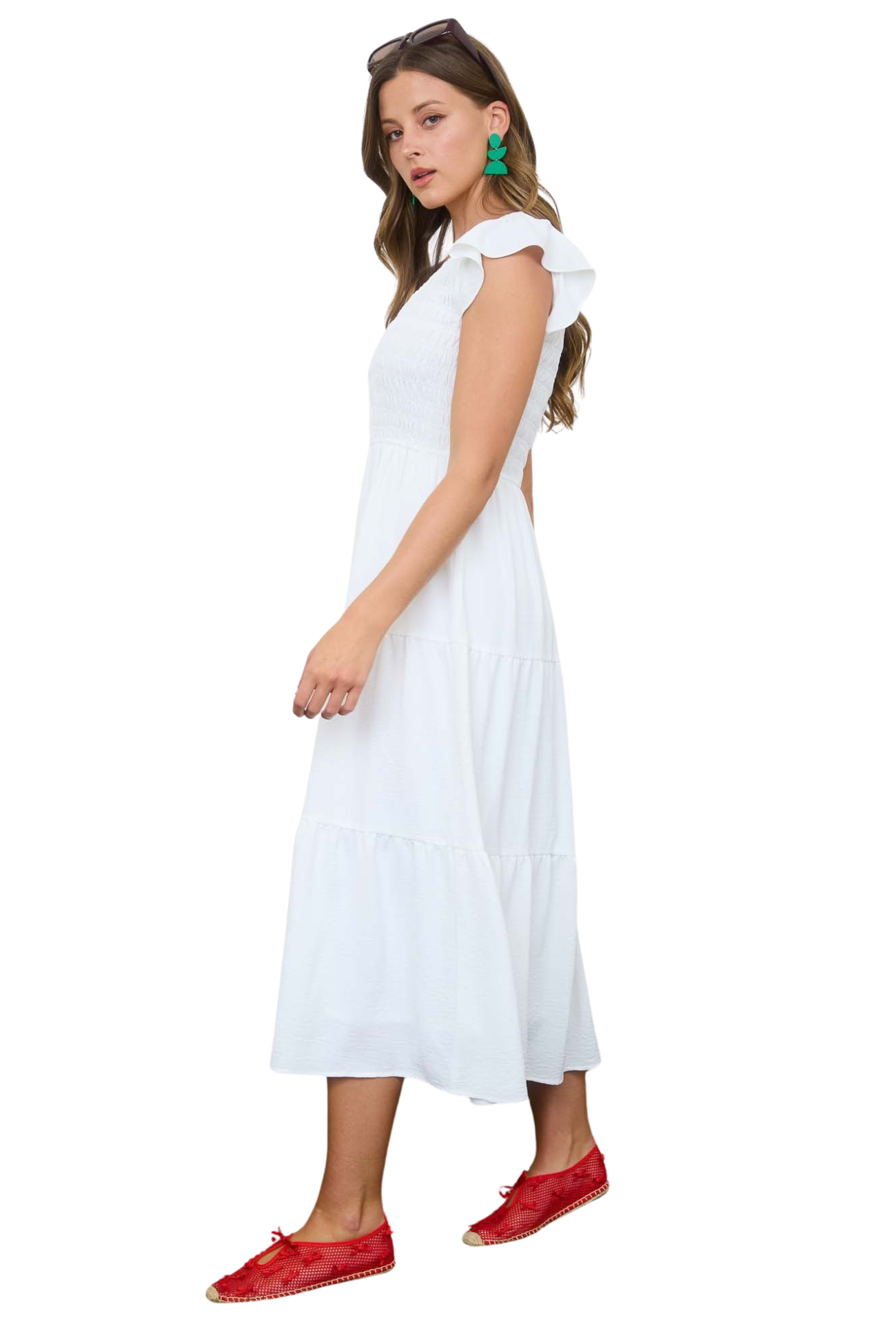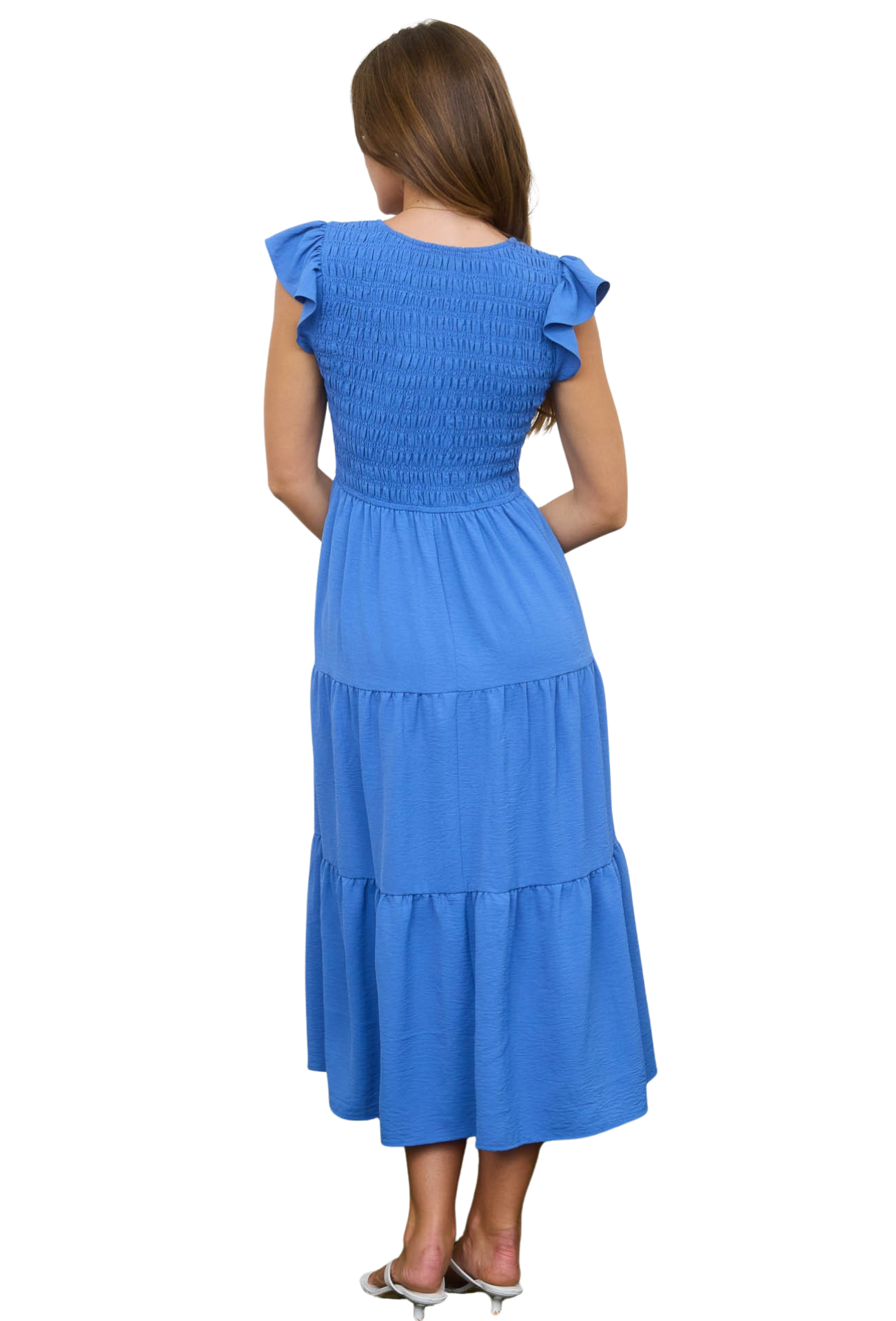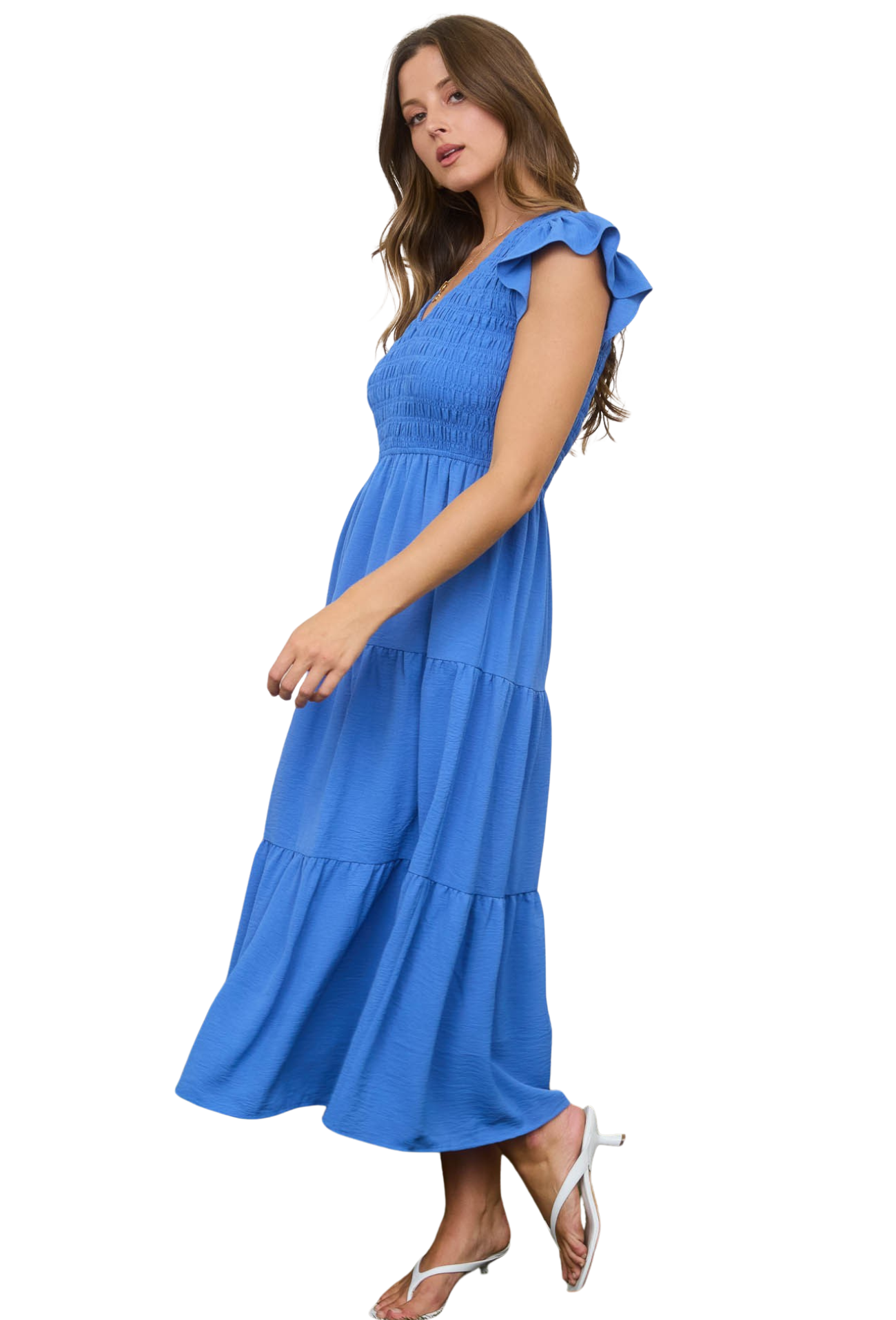 Embrace effortless elegance with this versatile midi dress, designed for those who appreciate timeless style. The flattering v-neck draws attention upward while the ruched chest detail creates a sculpted silhouette that flatters every figure. Tiered layers add movement and dimension, perfect for spring days when you want to look polished without trying too hard. Transition seamlessly from brunch to evening plans—this is the one dress that does it all.
