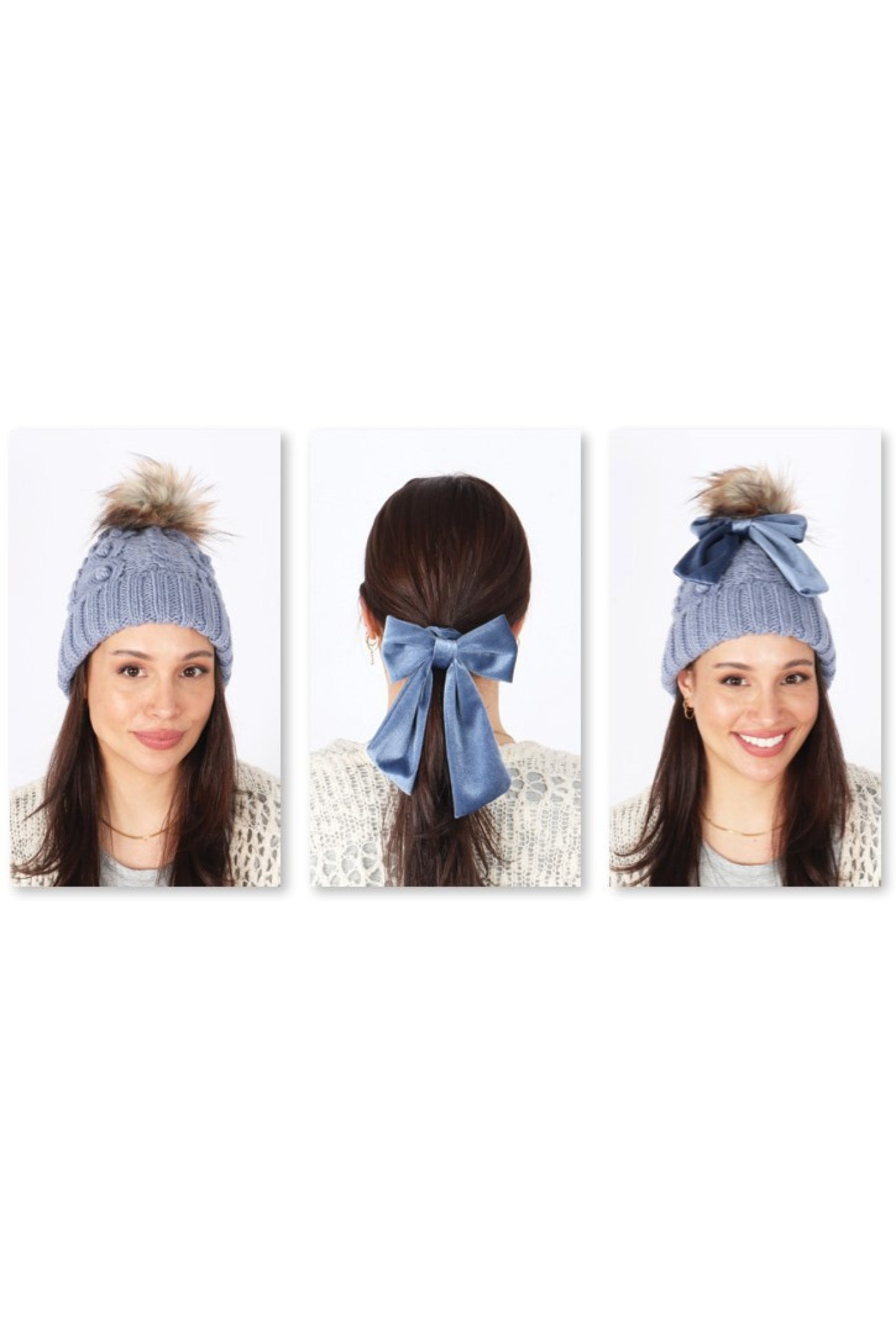 Stay cozy and stylish with this adorable 3-in-1 beanie featuring a plush fuzzy pom on top. The set includes a matching scrunchie with a charming bow, giving you multiple ways to express your look. Perfect for chilly days, this warm beanie keeps you comfortable while the cute design turns heads. One versatile piece, endless styling possibilities.