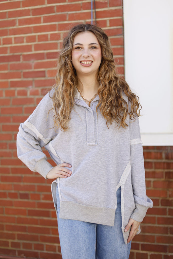 Introducing the Somewhere New Sweatshirt - stay cozy and stylish with this collared, button closure sweatshirt. Perfect for any occasion, this must-have piece is sure to elevate your wardrobe with its versatile design. Make a statement and feel confident in this comfortable and chic sweatshirt.