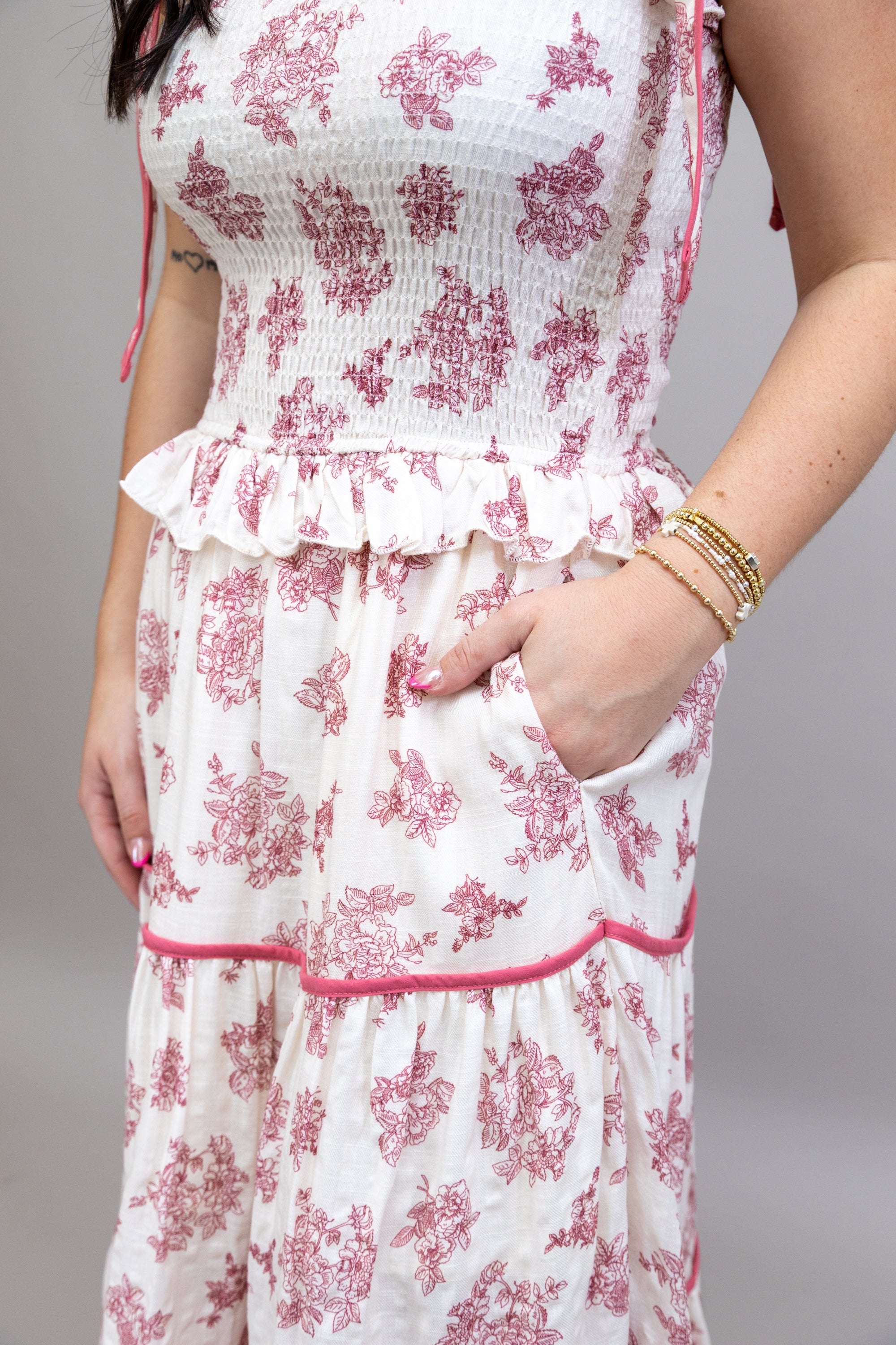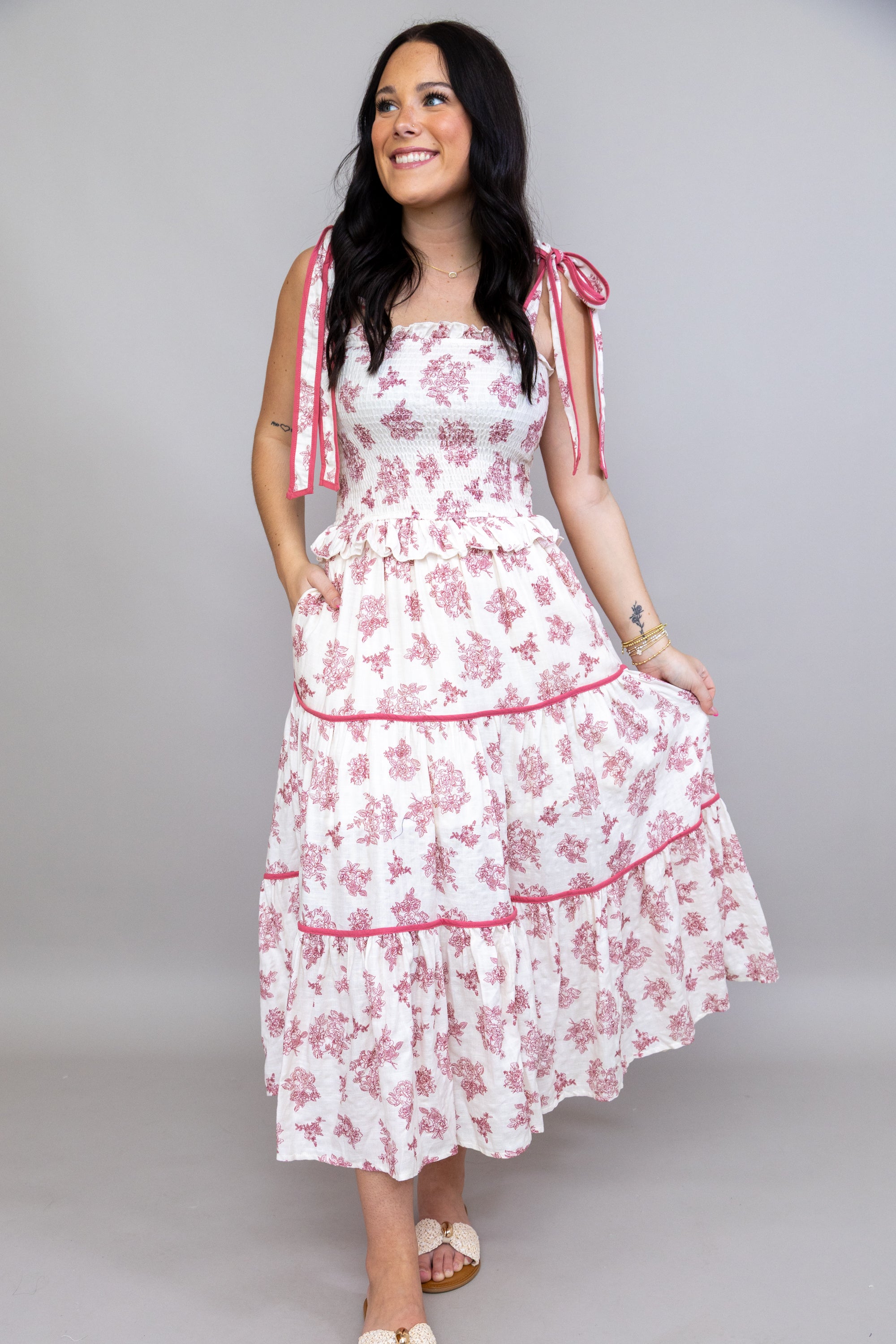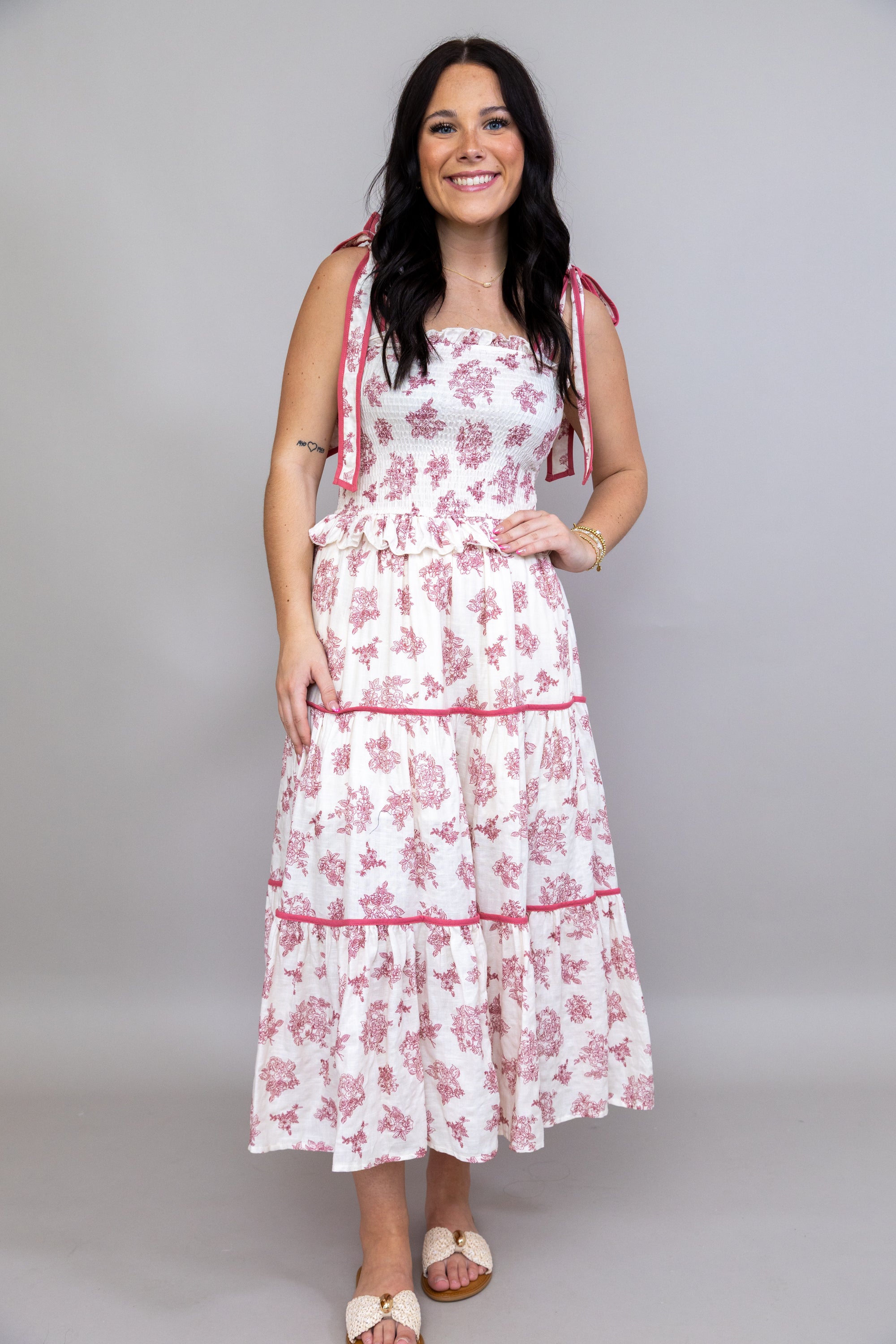 Elevate your wardrobe with this charming midi dress featuring a delicate floral print that brings effortless elegance to any occasion. The smocked bodice provides a flattering, structured fit while the adjustable tie straps offer customizable comfort. Cascading tiered layers create beautiful movement and dimension, making this piece perfect for garden parties, brunches, or special events. A versatile style that transitions seamlessly from day to evening!