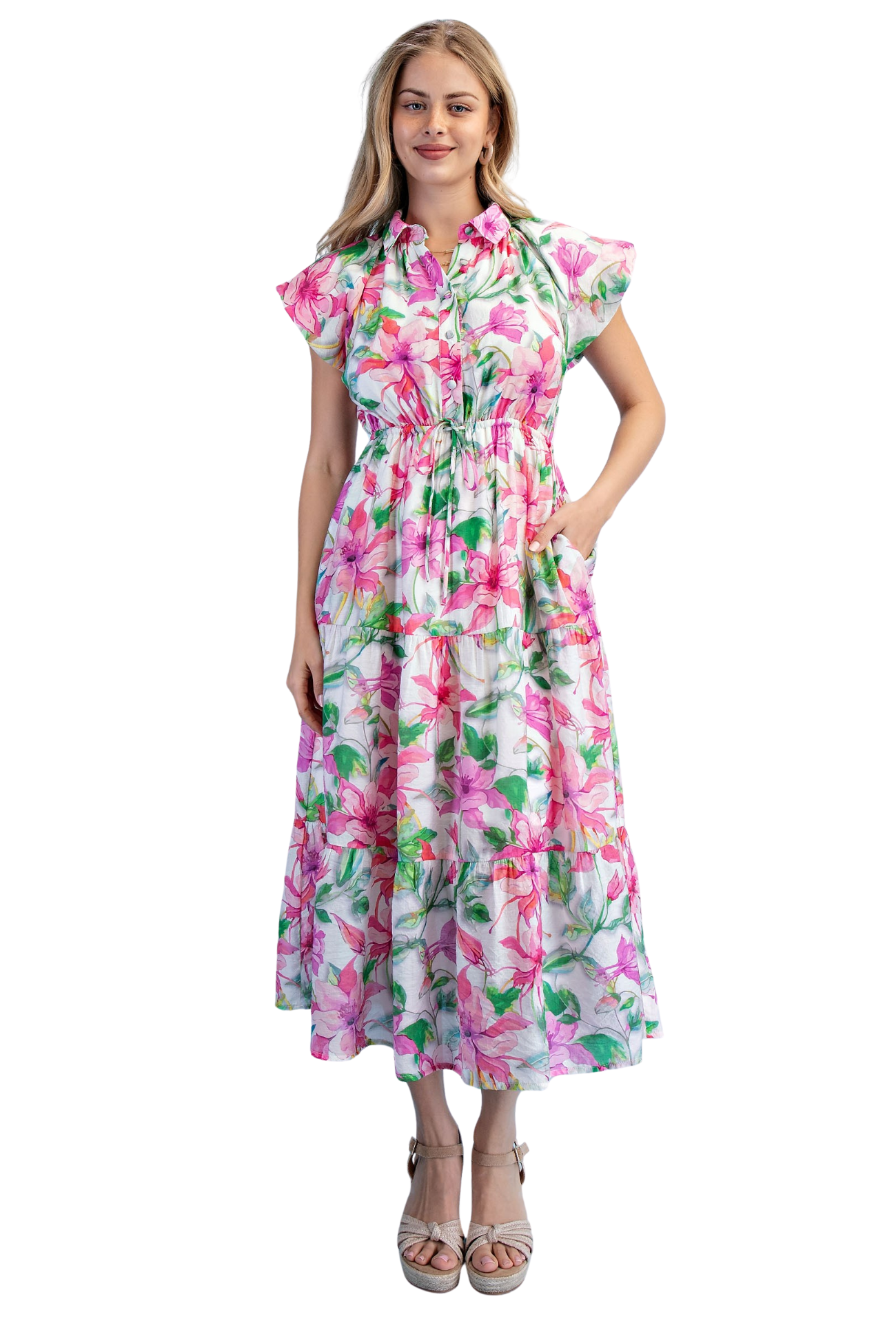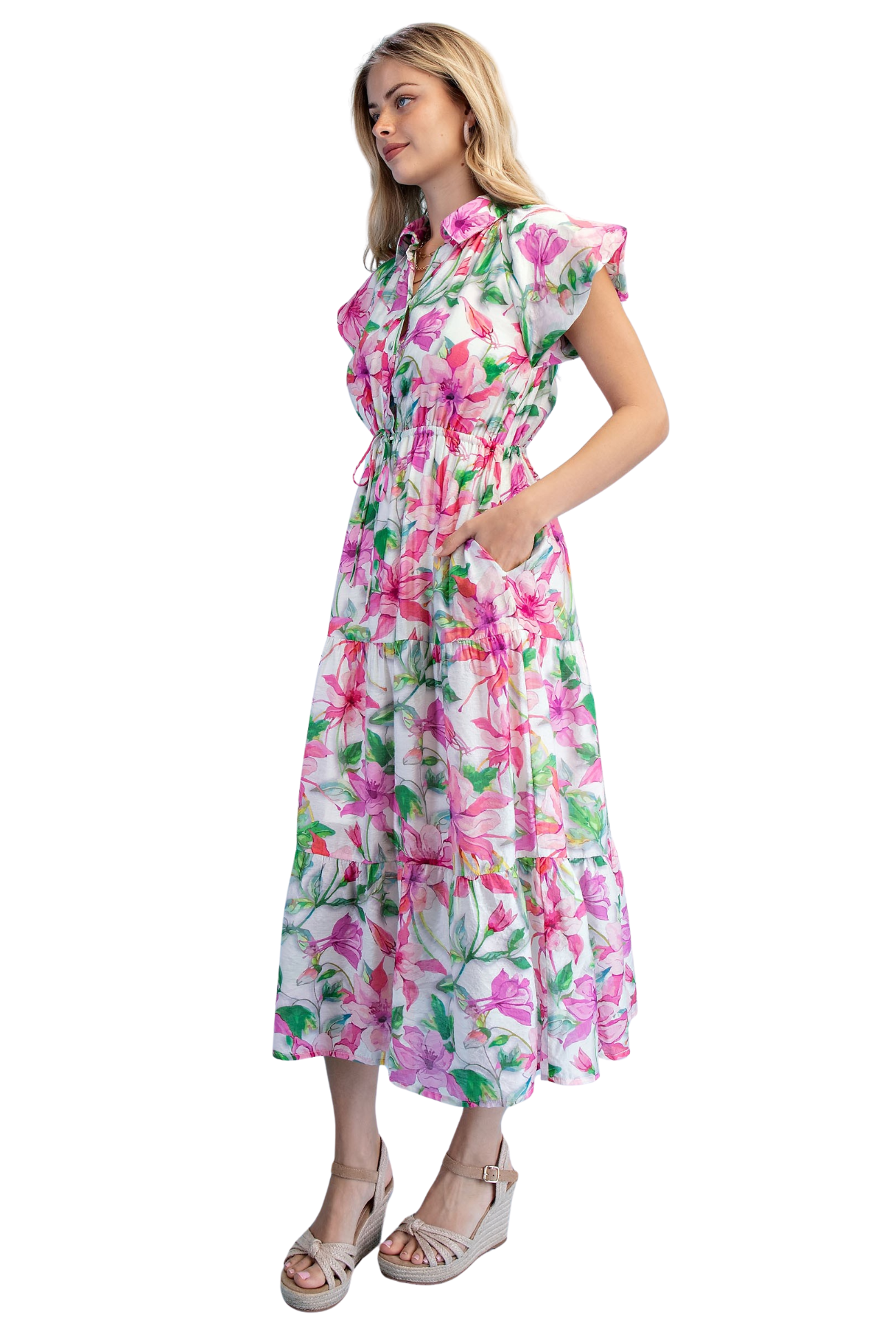 Escape to paradise with this charming midi dress featuring a classic floral print that brings effortless elegance to your wardrobe. The structured collar and button details add a polished touch, while the adjustable drawstring waist allows you to customize your silhouette for the perfect fit. Fully lined for comfort and confidence, this versatile piece transitions seamlessly from casual days to special occasions. A timeless addition to any collection!