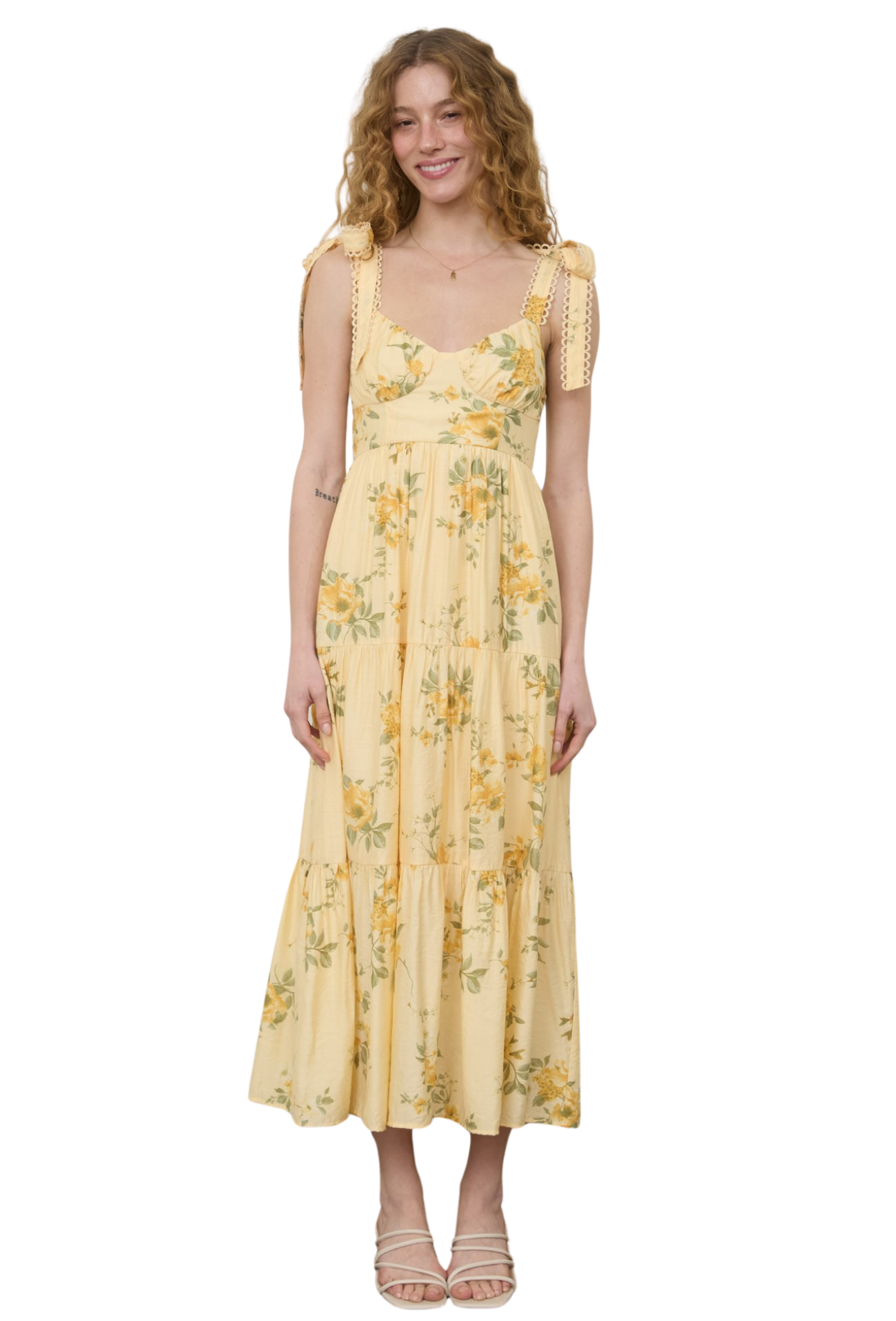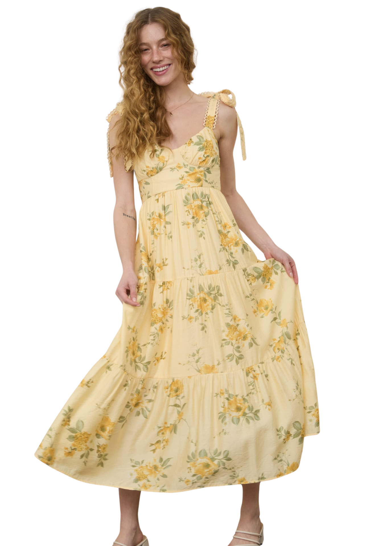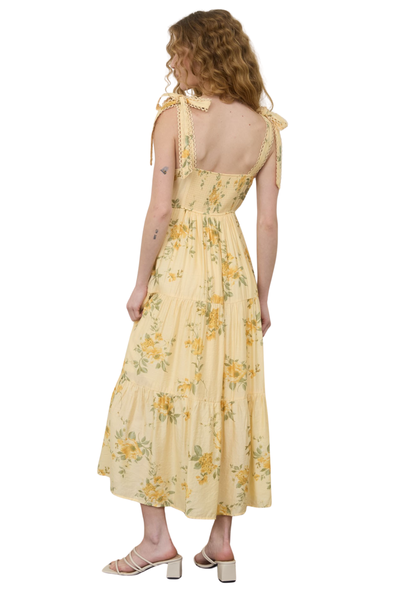 Embrace effortless spring style with this charming midi dress featuring delicate tie straps and a romantic floral print. The smocked back detail adds texture and visual interest while allowing for a comfortable, adjustable fit. Flowy fabric drapes beautifully, creating movement with every step—perfect for warm-weather days and breezy evenings. A versatile piece that transitions seamlessly from casual outings to garden gatherings!