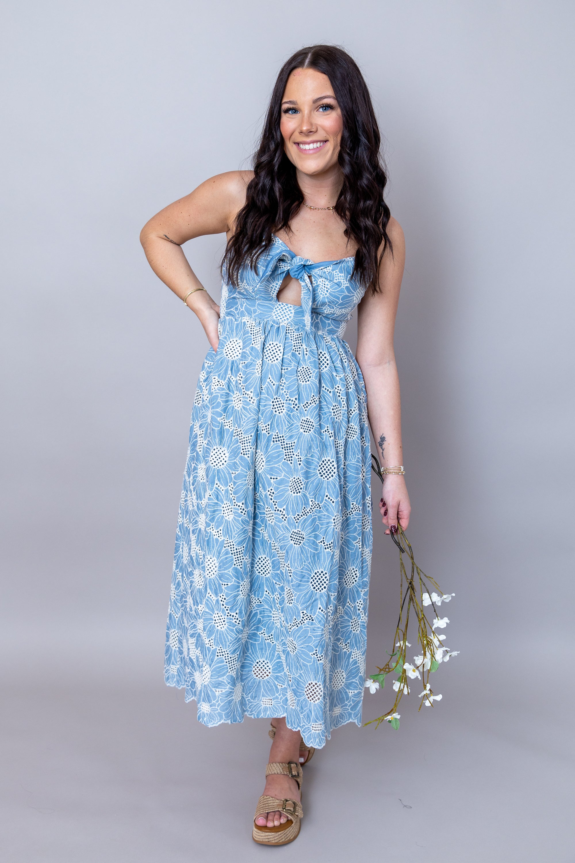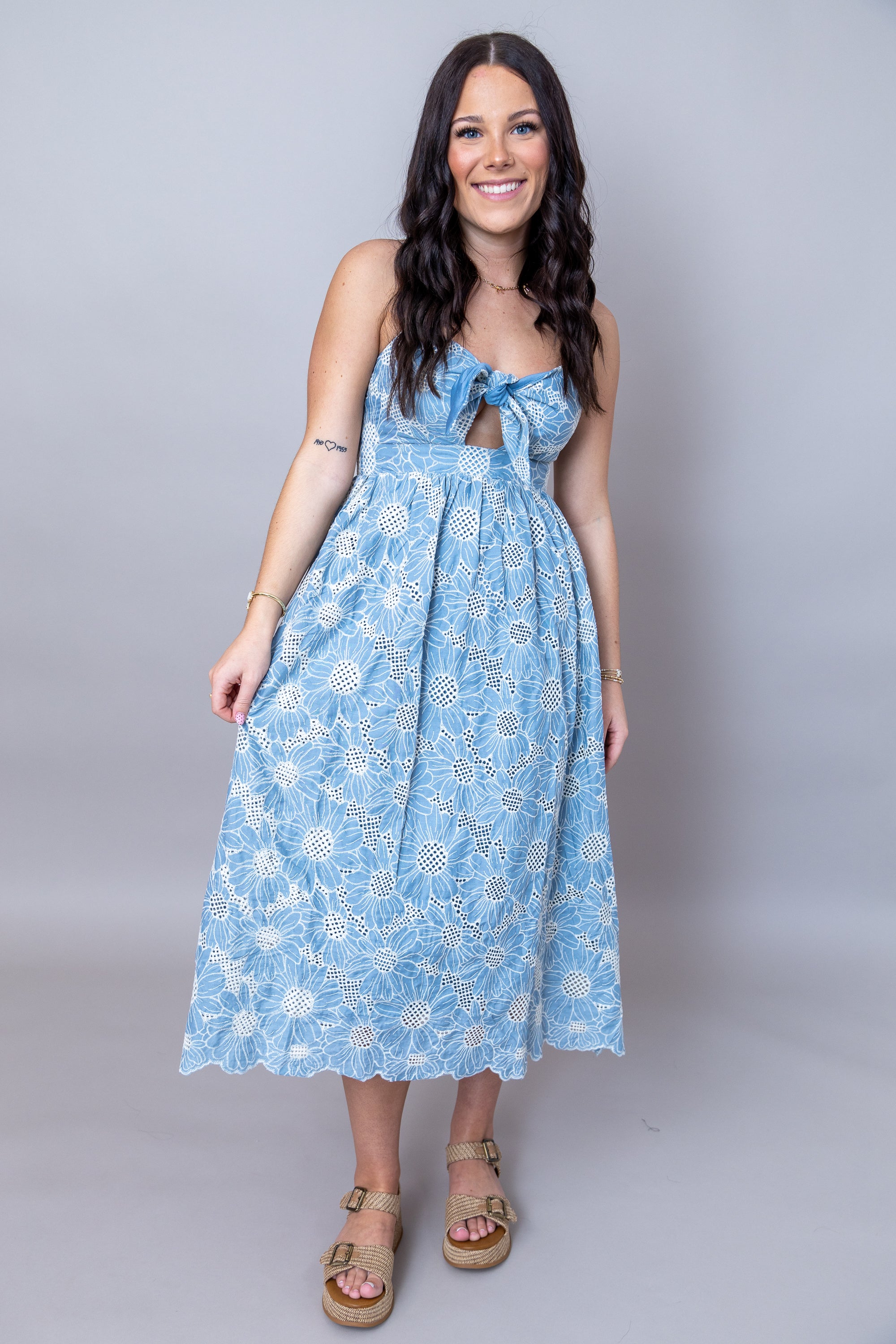Embrace effortless elegance this spring with the It's A Lovely Day Dress. This midi silhouette features delicate embroidery that adds timeless sophistication to your wardrobe. Adjustable thin straps ensure a personalized fit for all-day comfort, while the secure zipper closure keeps you looking polished from morning to night. Perfect for garden parties, brunches, or any occasion calling for understated charm!