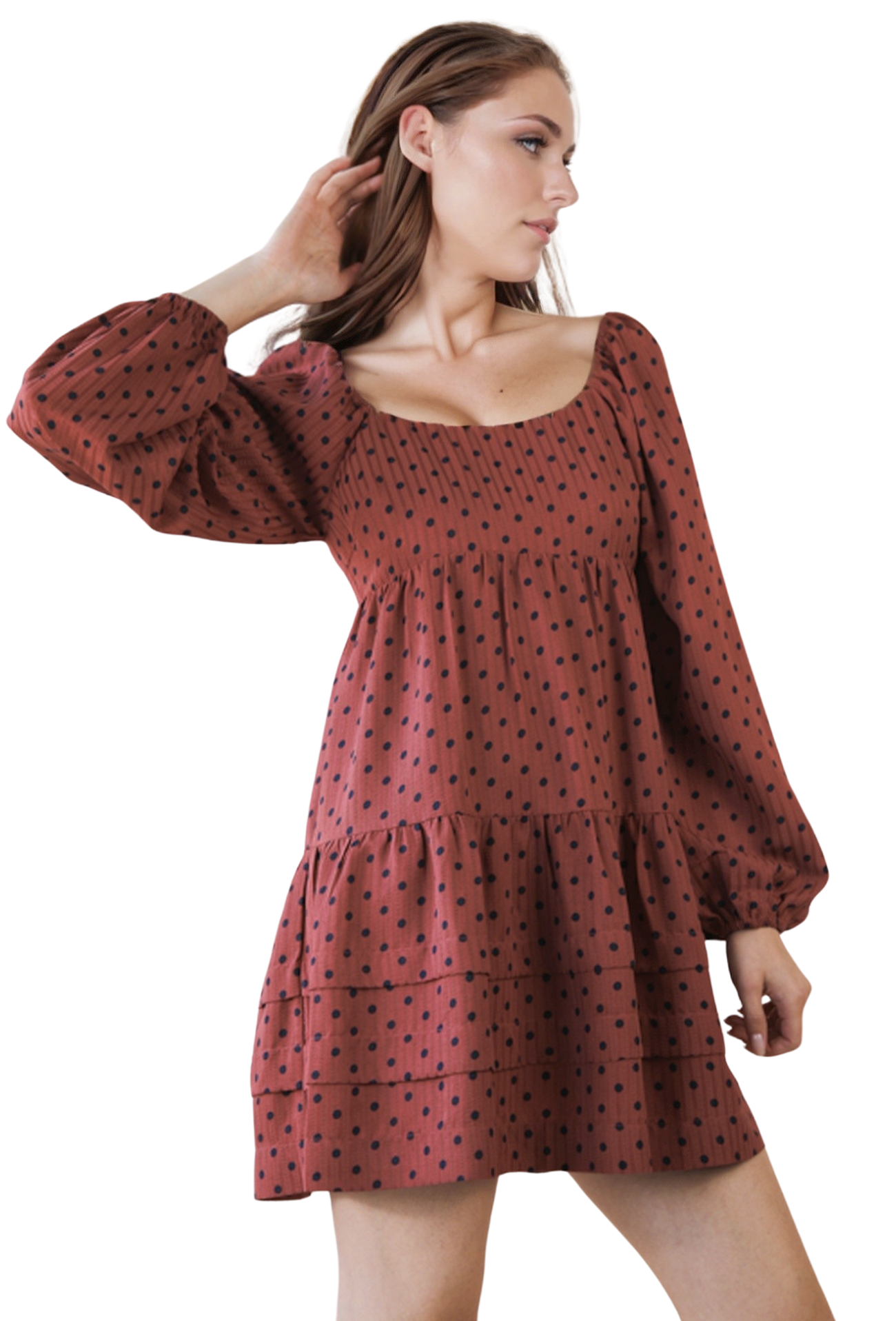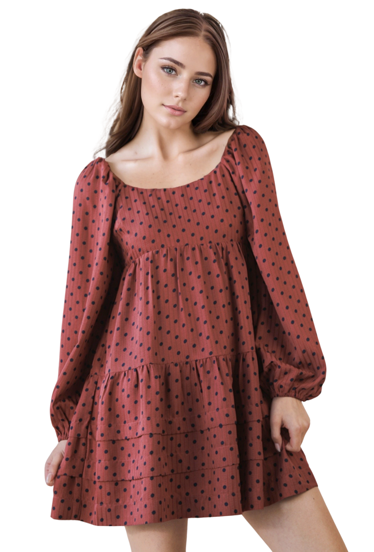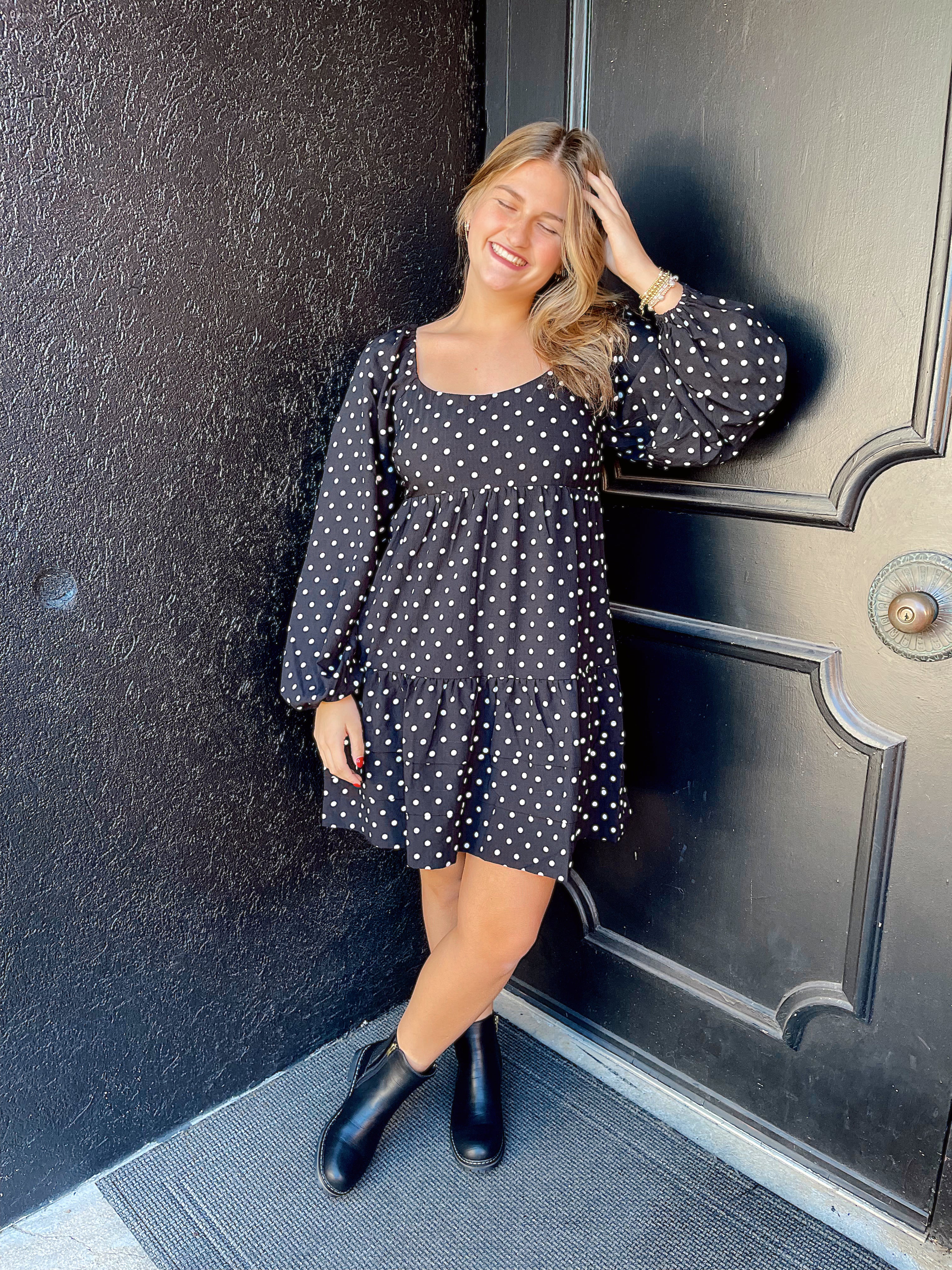 This short dress features a timeless polka dot pattern and elegant long sleeves, combining classic charm with modern style. Perfect for day-to-night wear, its flattering fit ensures comfort and confidence wherever you go. Add a playful yet sophisticated touch to your wardrobe with this versatile piece.