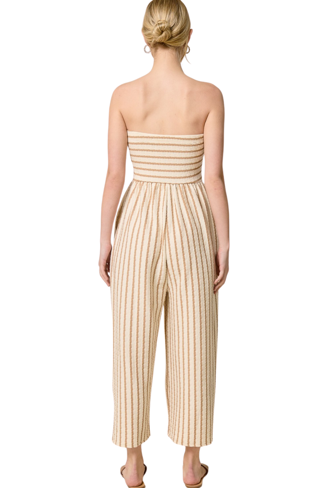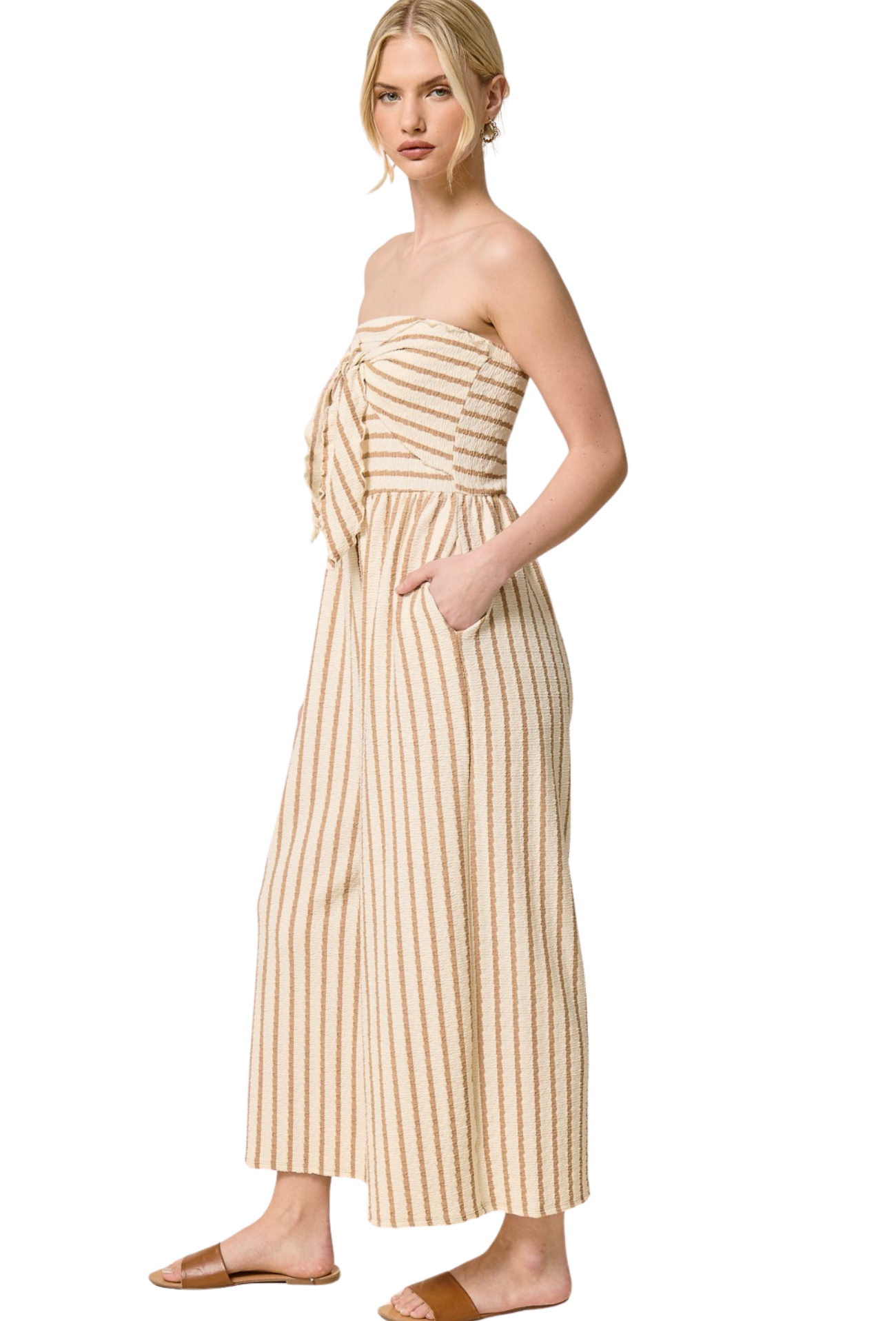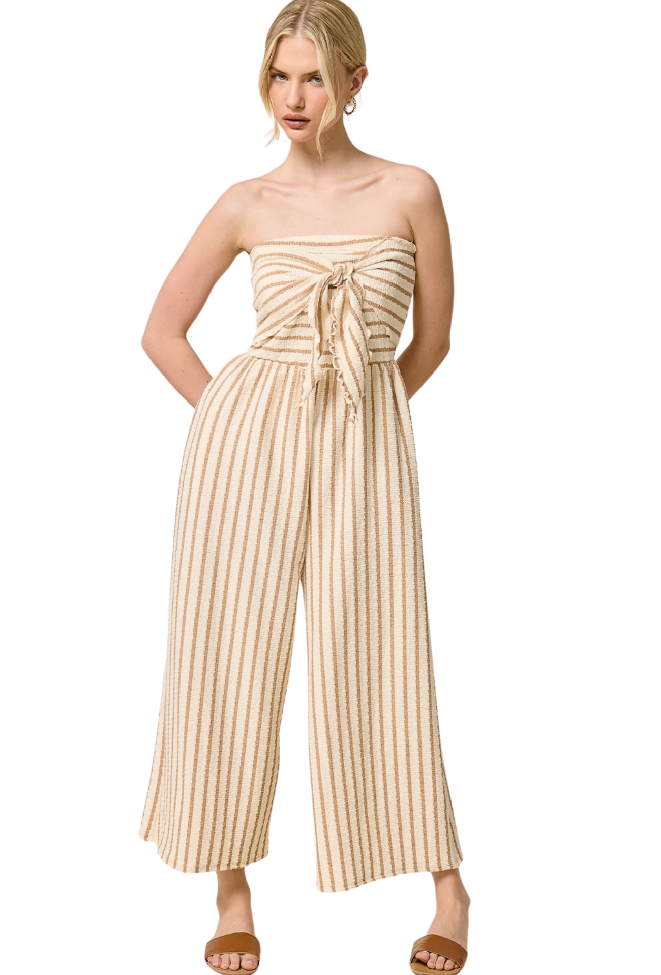 Effortless elegance meets everyday versatility in the Can't Stop Me Now Jumpsuit. This strapless design features a flattering front tie detail and softly structured bodice that creates gentle shaping without sacrificing comfort. The textured, stretchy fabric moves with you, while the relaxed wide-leg silhouette offers a polished look that works from morning coffee to evening plans. Pull-on styling means zero fuss—just slip it on and go. One piece, endless possibilities.