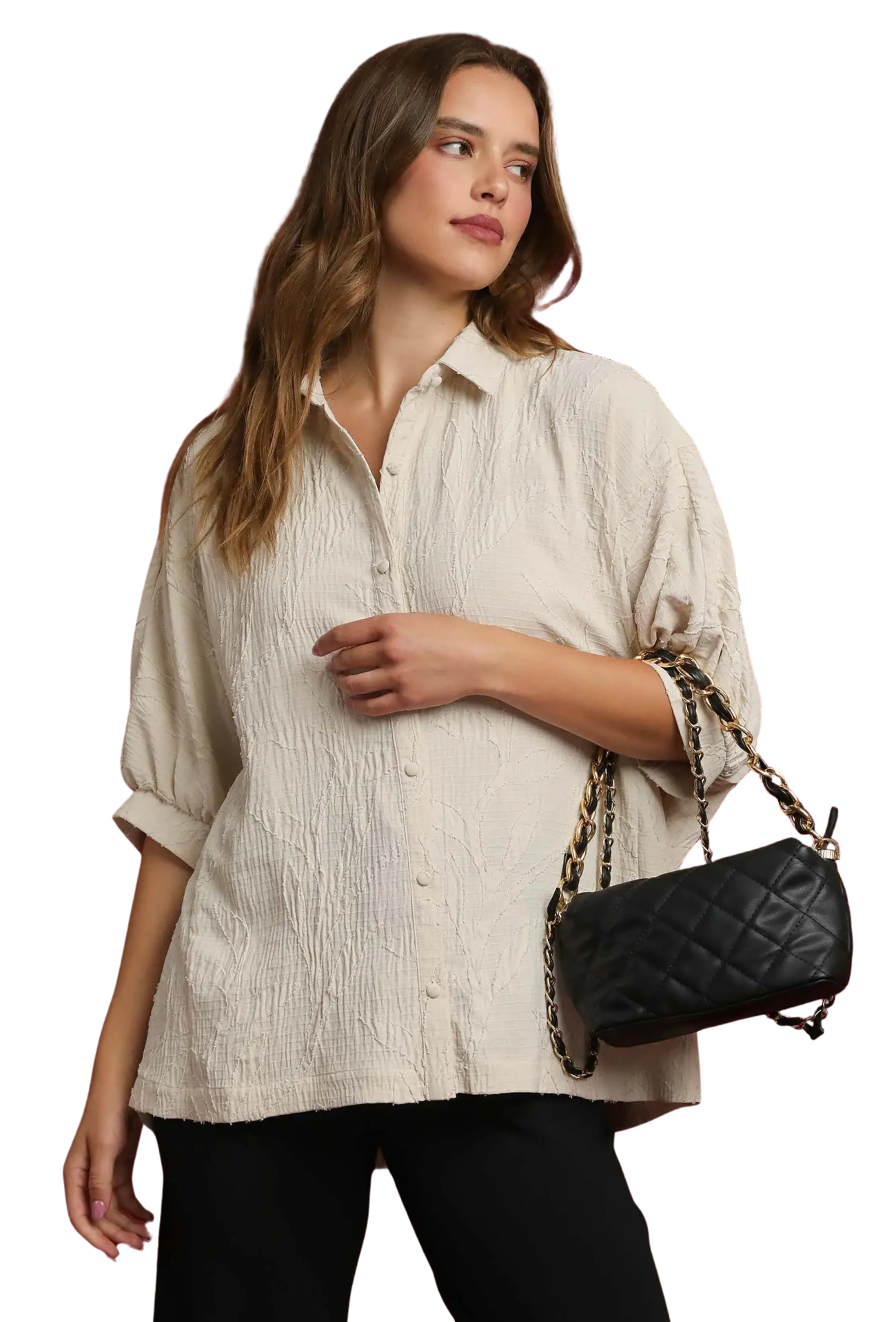 Elevate your everyday wardrobe with the Can't You See It Button Down Blouse, a versatile piece that effortlessly transitions from office to weekend. Crafted from textured jacquard fabric, this blouse features a classic collared neckline and convenient button-down front for easy styling. The distinctive high-low hem adds modern flair and movement, while the unlined construction keeps it breathable and comfortable. Perfect for layering or wearing solo, this blouse is the polished essential you've been searching for.