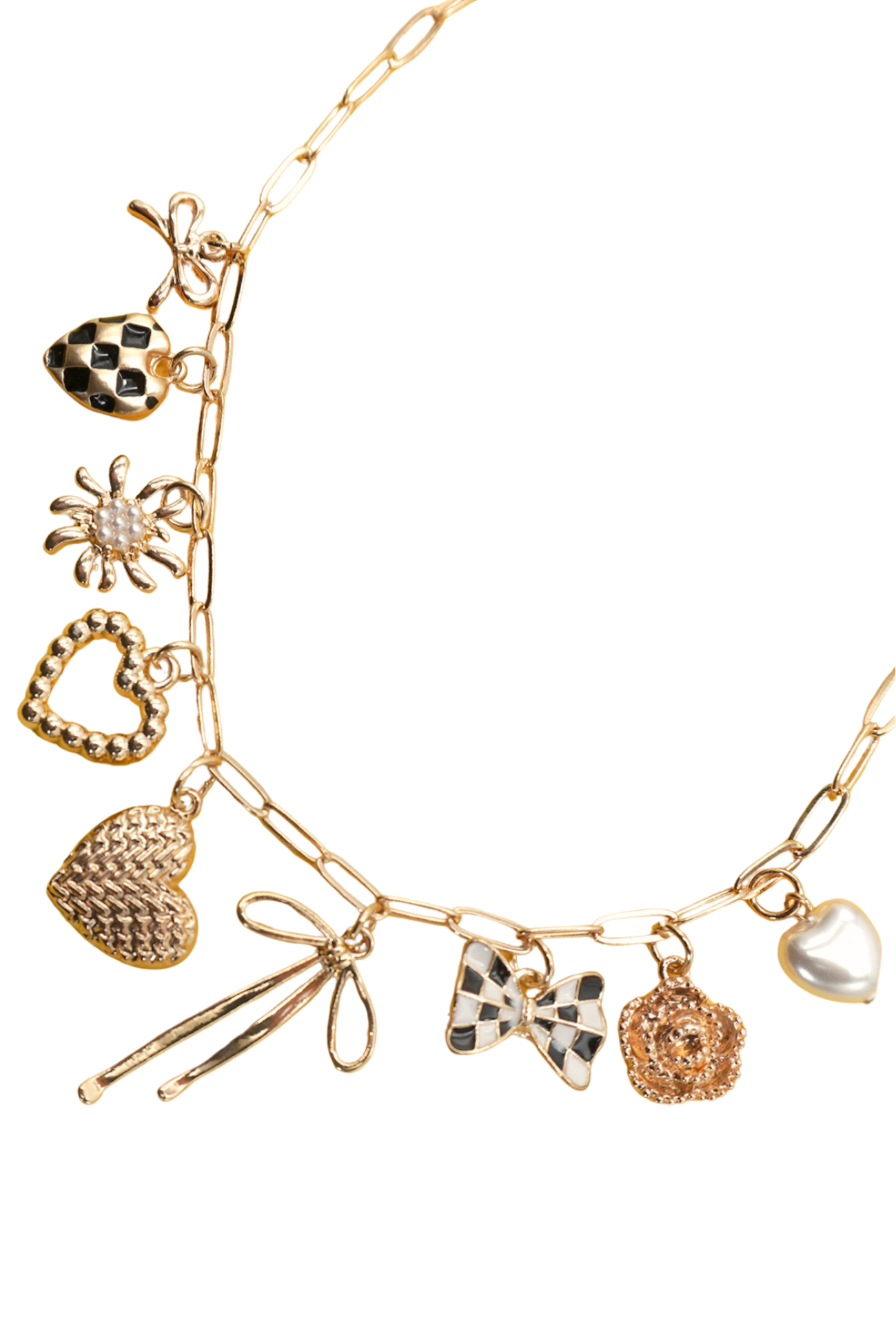 Elevate your everyday style with this enchanting gold paperclip chain necklace, adorned with delicate checkered heart and bow charms. The lightweight design makes it perfect for layering or wearing solo, while the lustrous gold finish adds a touch of sophistication to any outfit. These charming accents catch the light beautifully, creating an eye-catching piece that transitions seamlessly from casual to dressy occasions. Whether you're looking to express your personality or gift something special, this necklace combines playful elegance with timeless appeal.