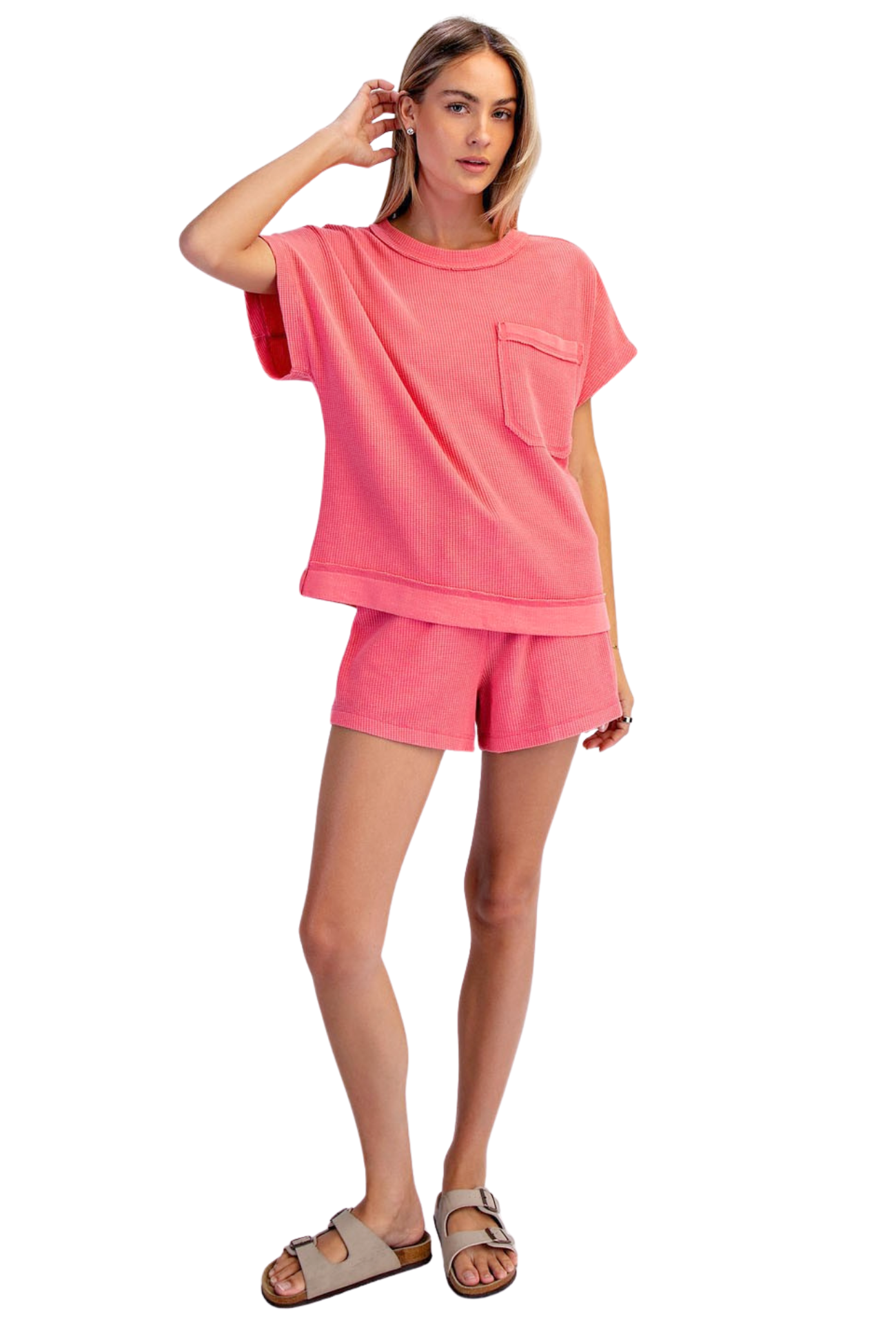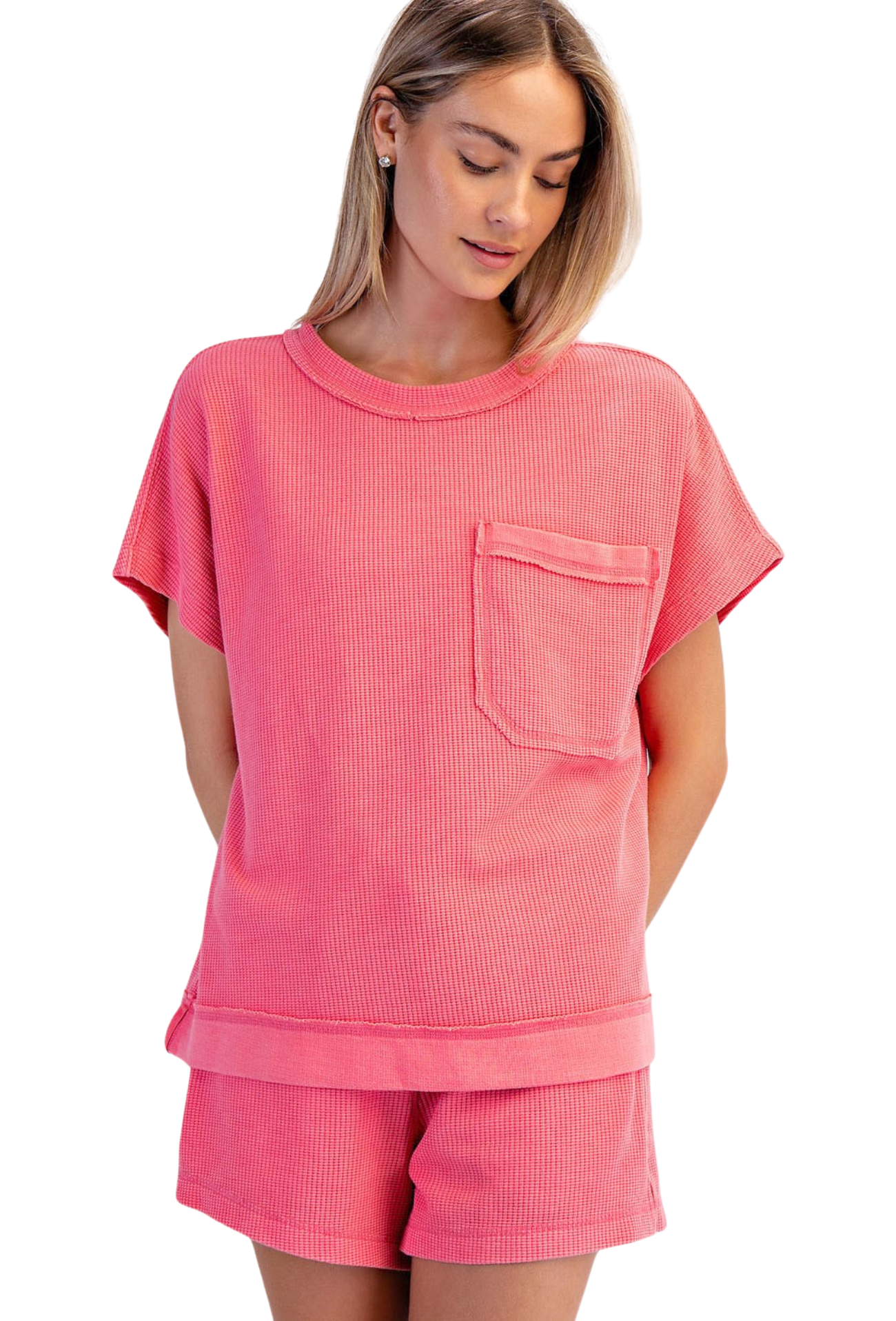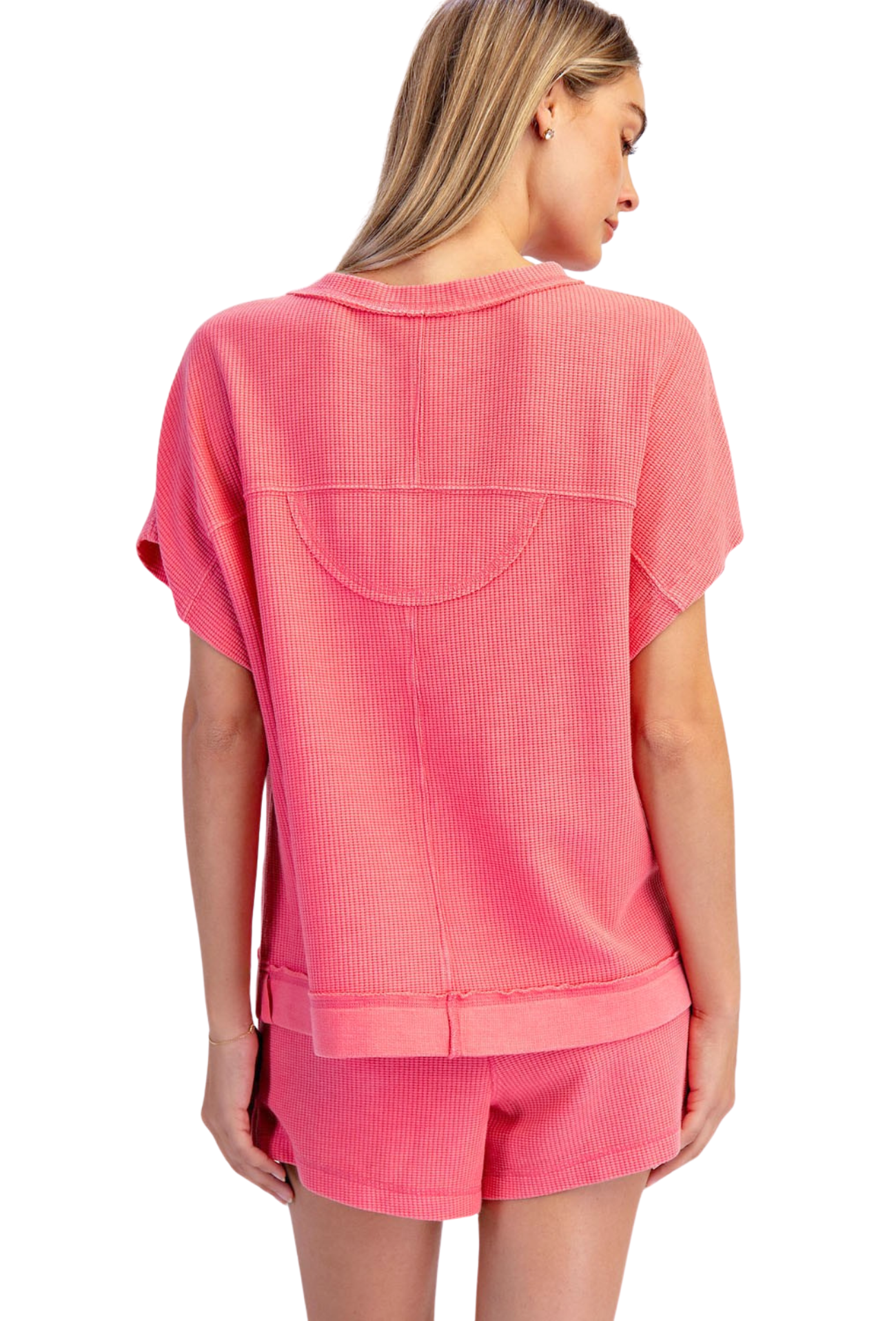 Don't let this versatile tee slip off your radar. Crafted in a textured waffle knit fabric, it delivers comfort with subtle visual interest that elevates any casual look. The relaxed short sleeves make it perfect for layering or wearing solo, whether you're running errands or meeting friends. Easy to style and even easier to love, this top deserves a permanent spot in your wardrobe rotation.