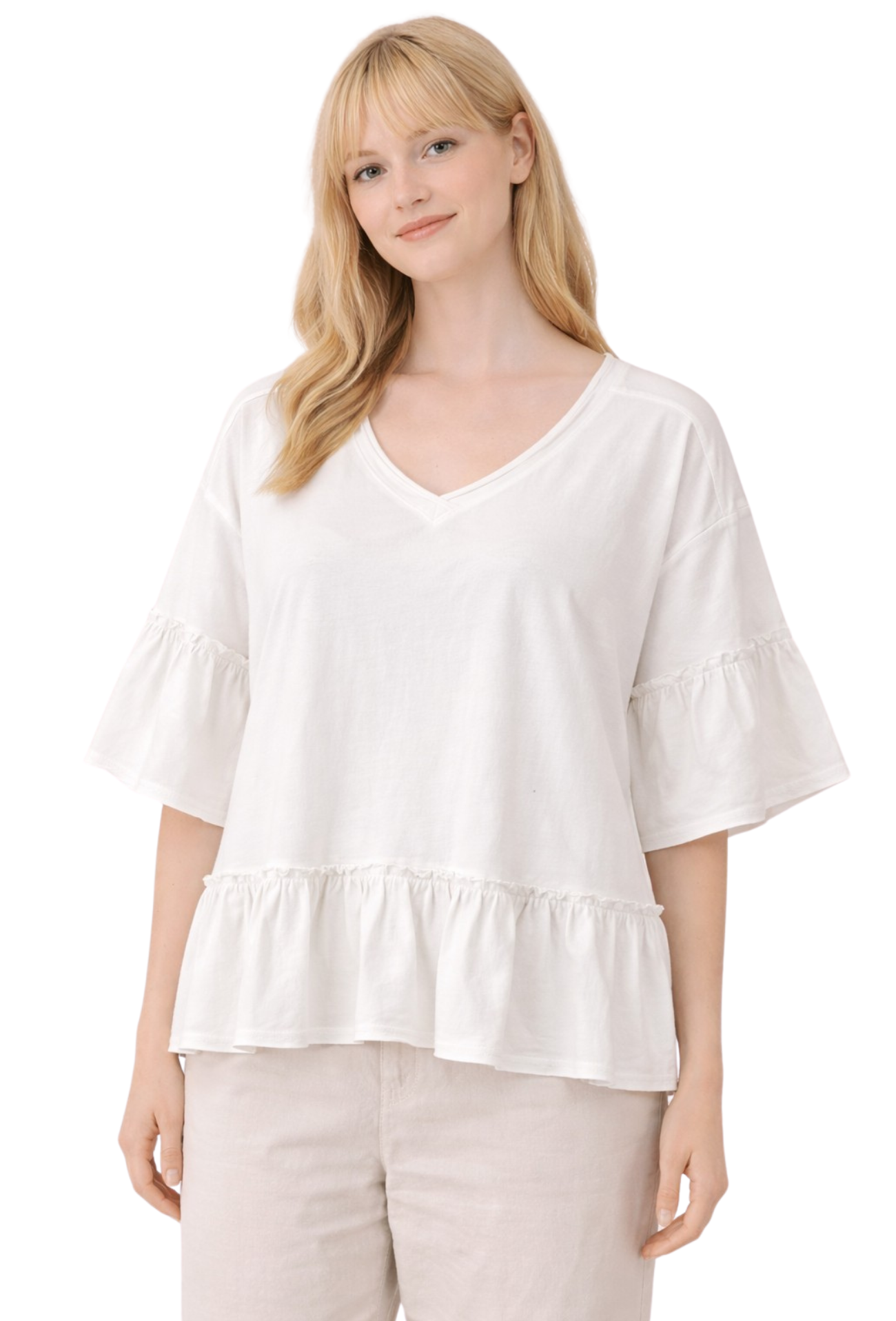 Discover effortless sophistication with our Elevated Classics Top. This charming piece features a flattering v-neck design paired with delicate short sleeves and playful ruffles that add dimension and movement to your everyday look. Perfect for dressing up casual outfits or layering under your favorite pieces, this versatile top brings a touch of refined elegance to any wardrobe. Whether you're heading to brunch or the office, you'll appreciate how this thoughtfully designed top elevates your style with minimal effort.