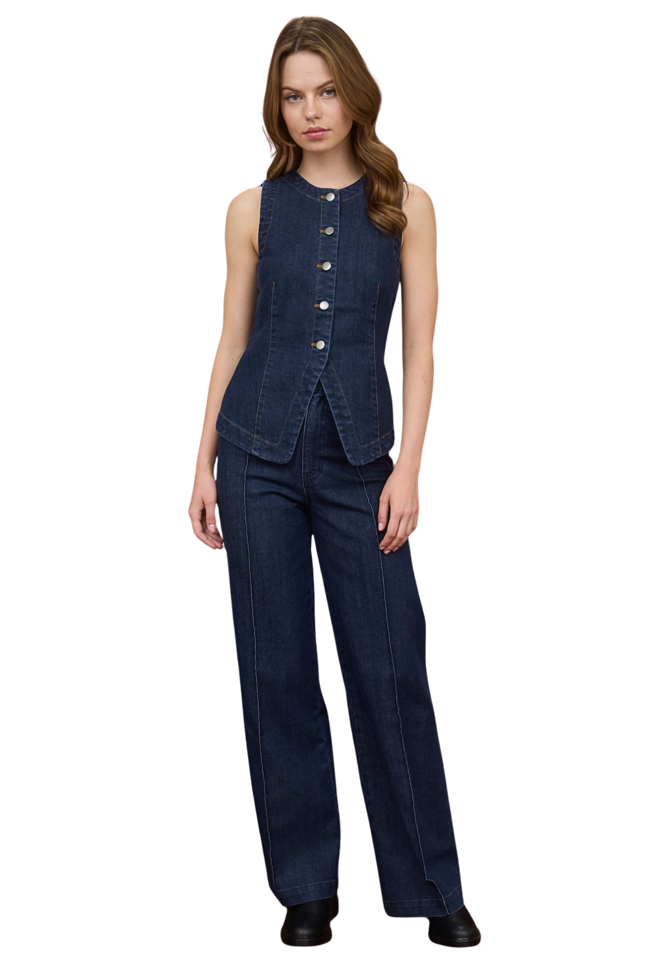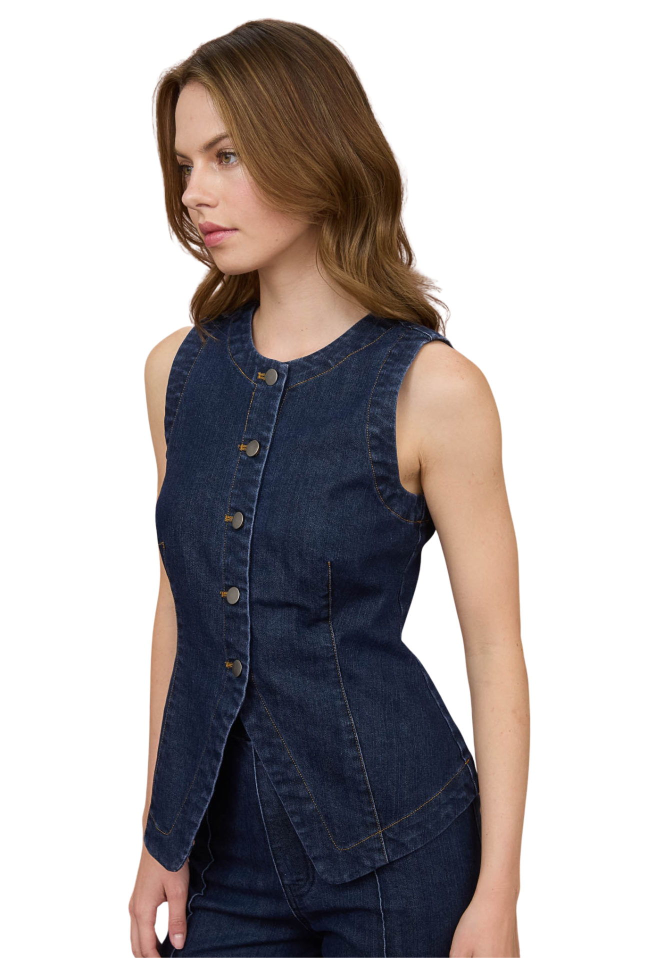 Elevate your denim game with the Good To Be Back Vest—a chic essential that effortlessly transitions from casual to polished. Crafted in quality denim with a secure button closure, this versatile piece layers beautifully over your favorite tops. Pair it with our matching bottoms to create a coordinated look that turns heads. Whether you're dressing up jeans or adding edge to a dress, this vest delivers timeless style with modern appeal. The perfect wardrobe investment for anyone seeking that coveted denim-on-denim moment.