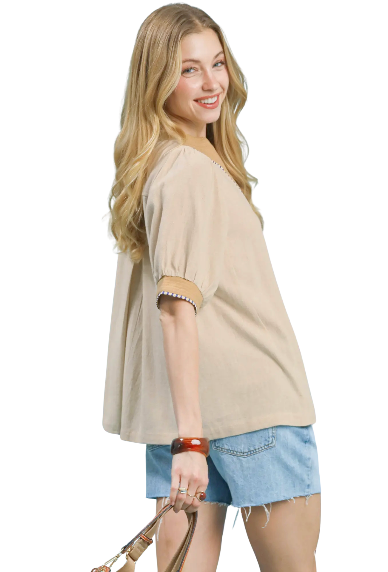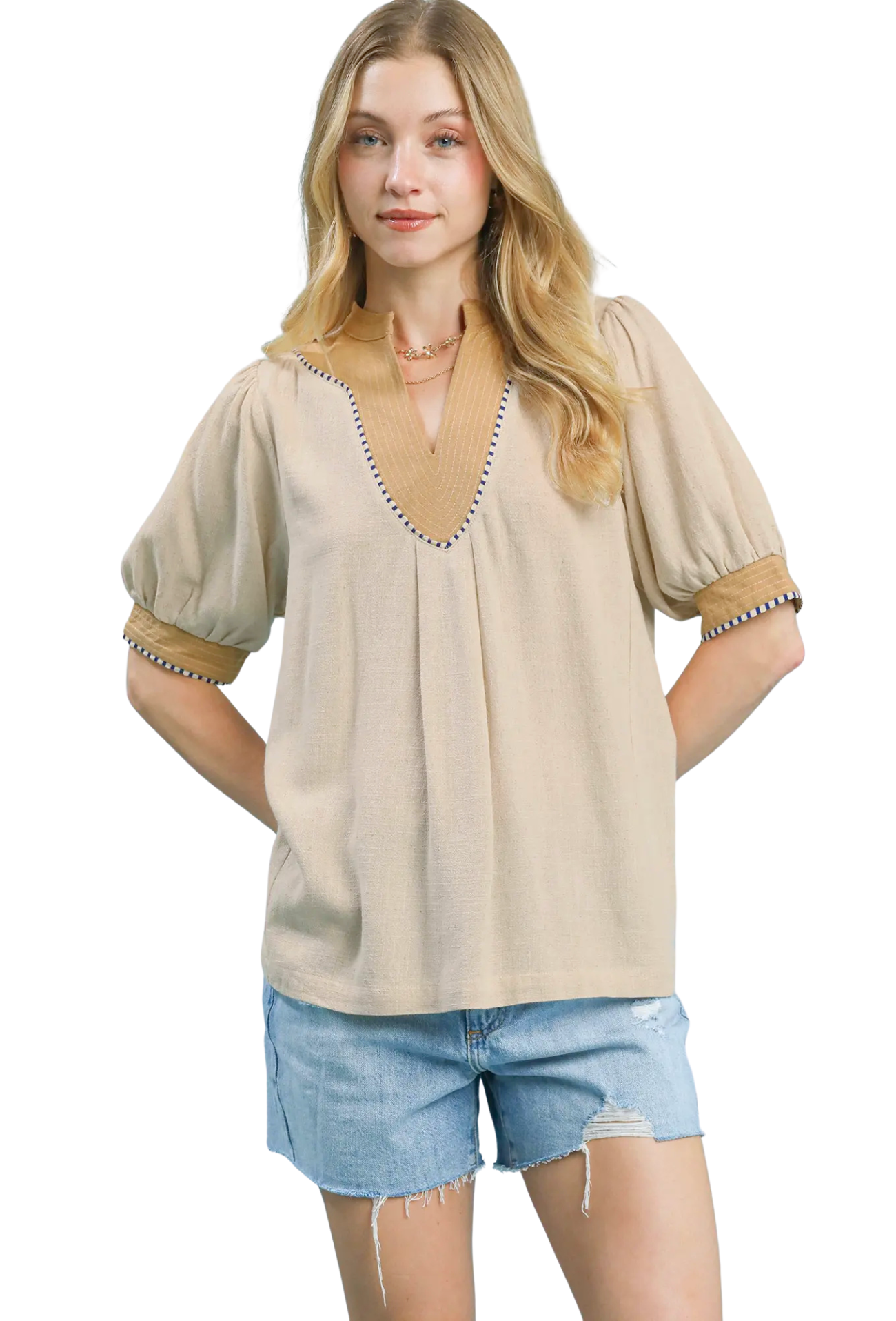Discover timeless sophistication with the Graceful Moments Blouse, crafted from a breathable linen blend that keeps you cool and comfortable all day long. The classic V-neckline flatters every frame, while three-quarter sleeves offer the perfect balance between coverage and airiness. Eye-catching stripe contrast details add visual interest and dimension to this versatile piece, making it ideal for dressing up or down. Whether you're heading to brunch, the office, or a casual gathering, this elegant blouse delivers effortless style that works season after season.