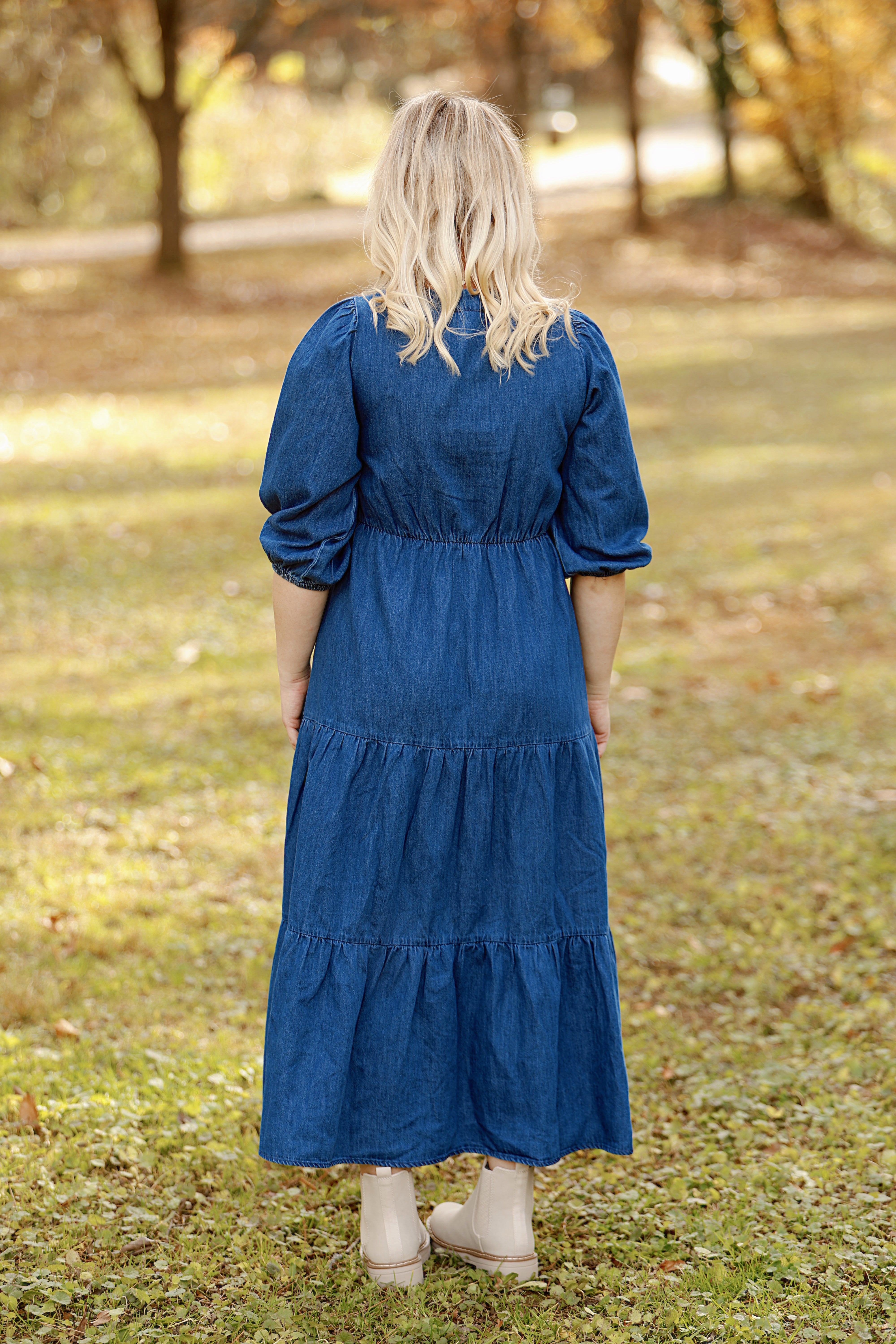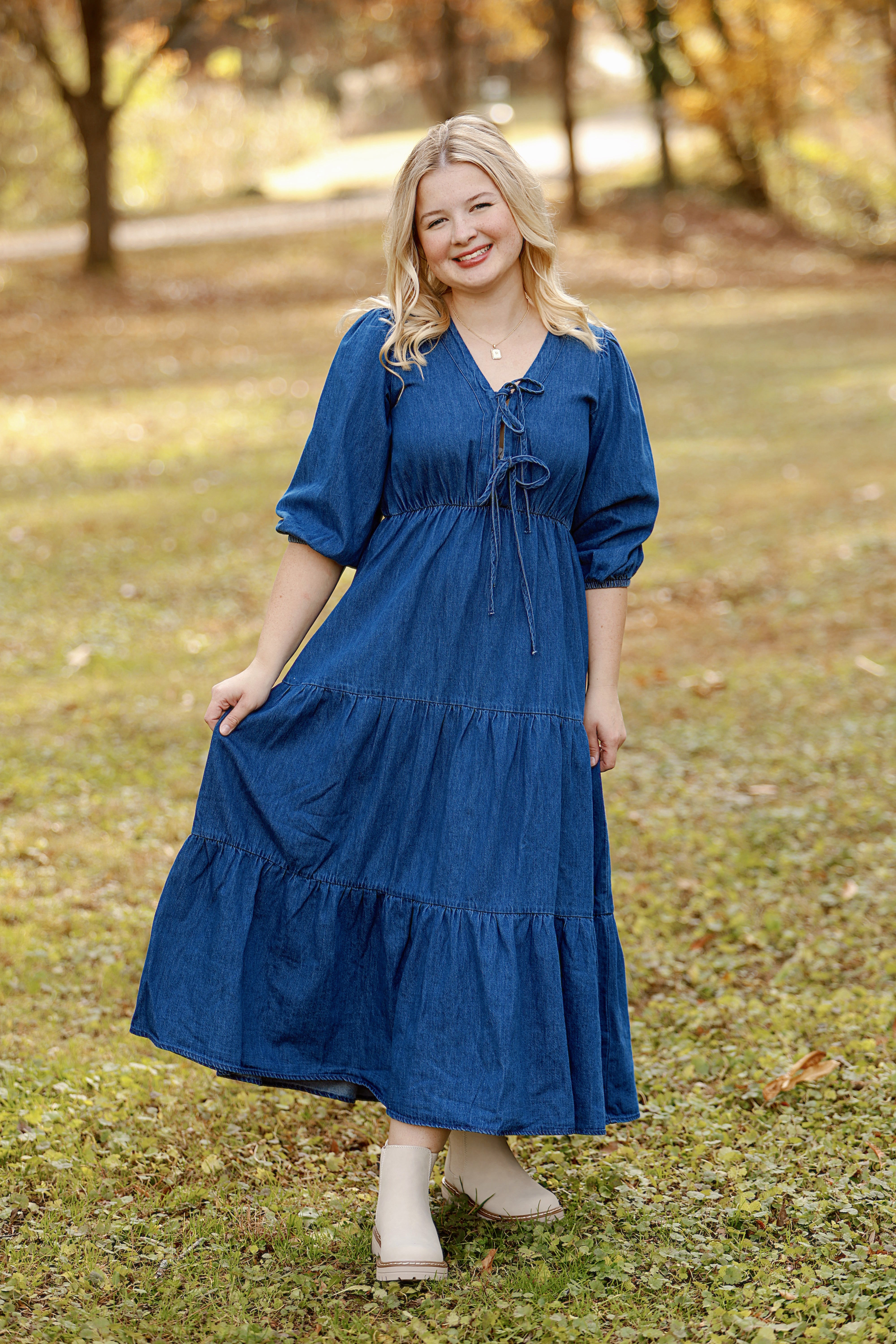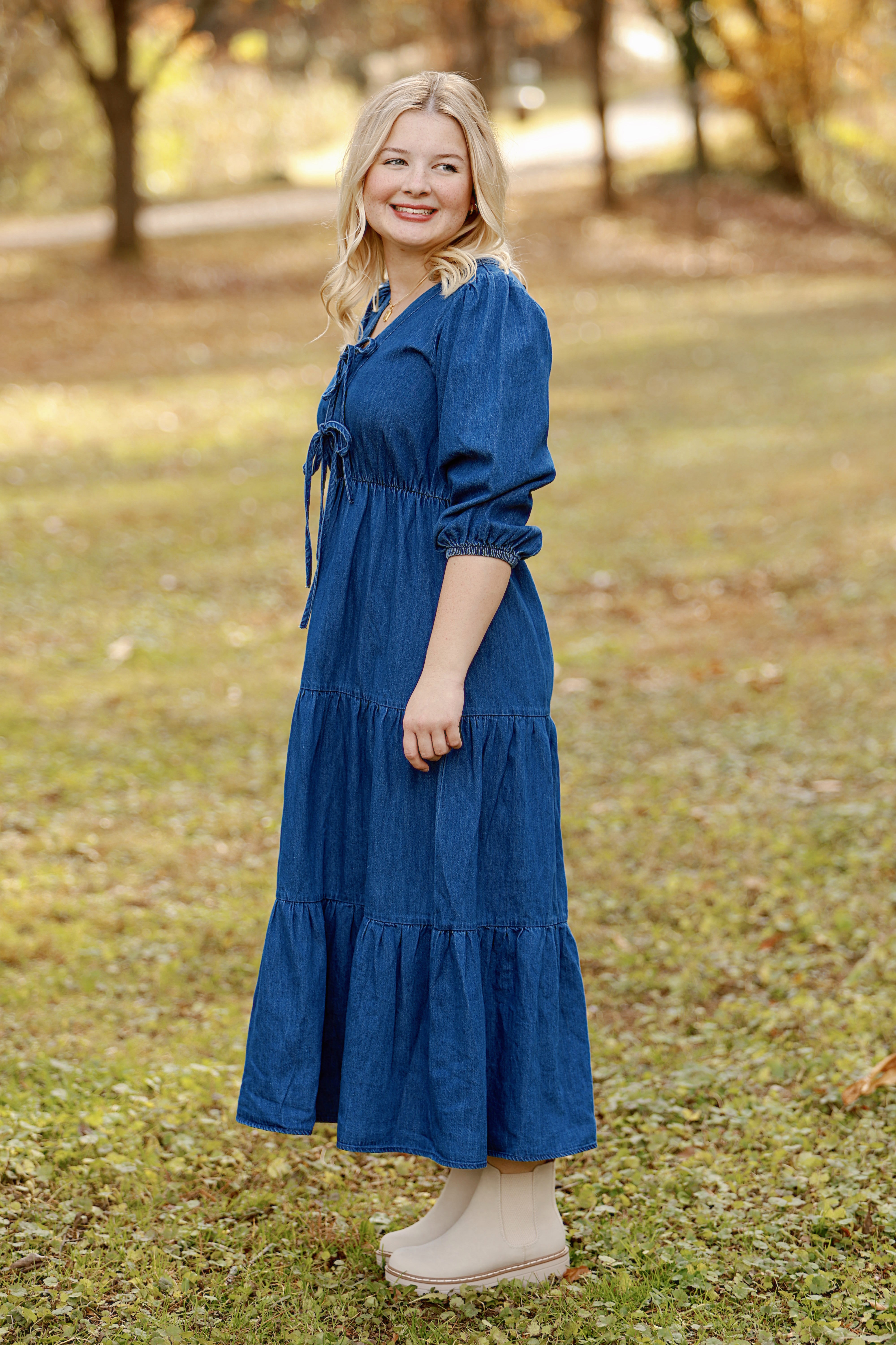 Elevate your everyday style with this charming denim dress that effortlessly combines comfort and sophistication. Featuring a flattering v-neck and long sleeves, it's the perfect piece for transitional weather while maintaining a polished look. Delicate bows add a playful, feminine touch that sets this dress apart from basic denim staples. Whether you're dressing up for brunch or keeping it casual, this versatile dress adapts to any occasion and pairs beautifully with your favorite accessories. A wardrobe essential that brings joy to getting dressed.