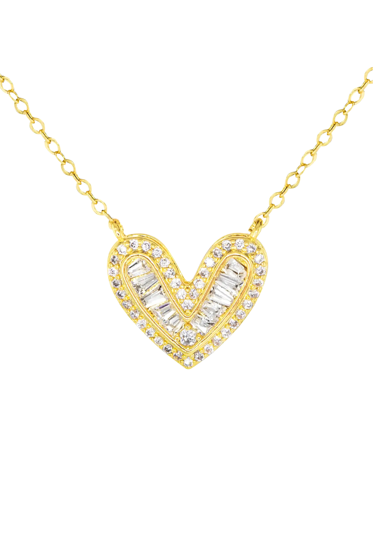 Elevate your everyday elegance with this delicate heart necklace, where refined gold meets brilliant sparkle. Featuring baguette-cut cubic zirconia stones that catch the light with every movement, this piece delivers luxury-inspired glamour without the hefty price tag. The dainty design sits perfectly against your skin, making it ideal for layering or wearing solo. Whether you're dressing up for a special occasion or adding a touch of sophistication to casual wear, this necklace becomes an instant favorite. A timeless investment that complements any style and makes an unforgettable gift.