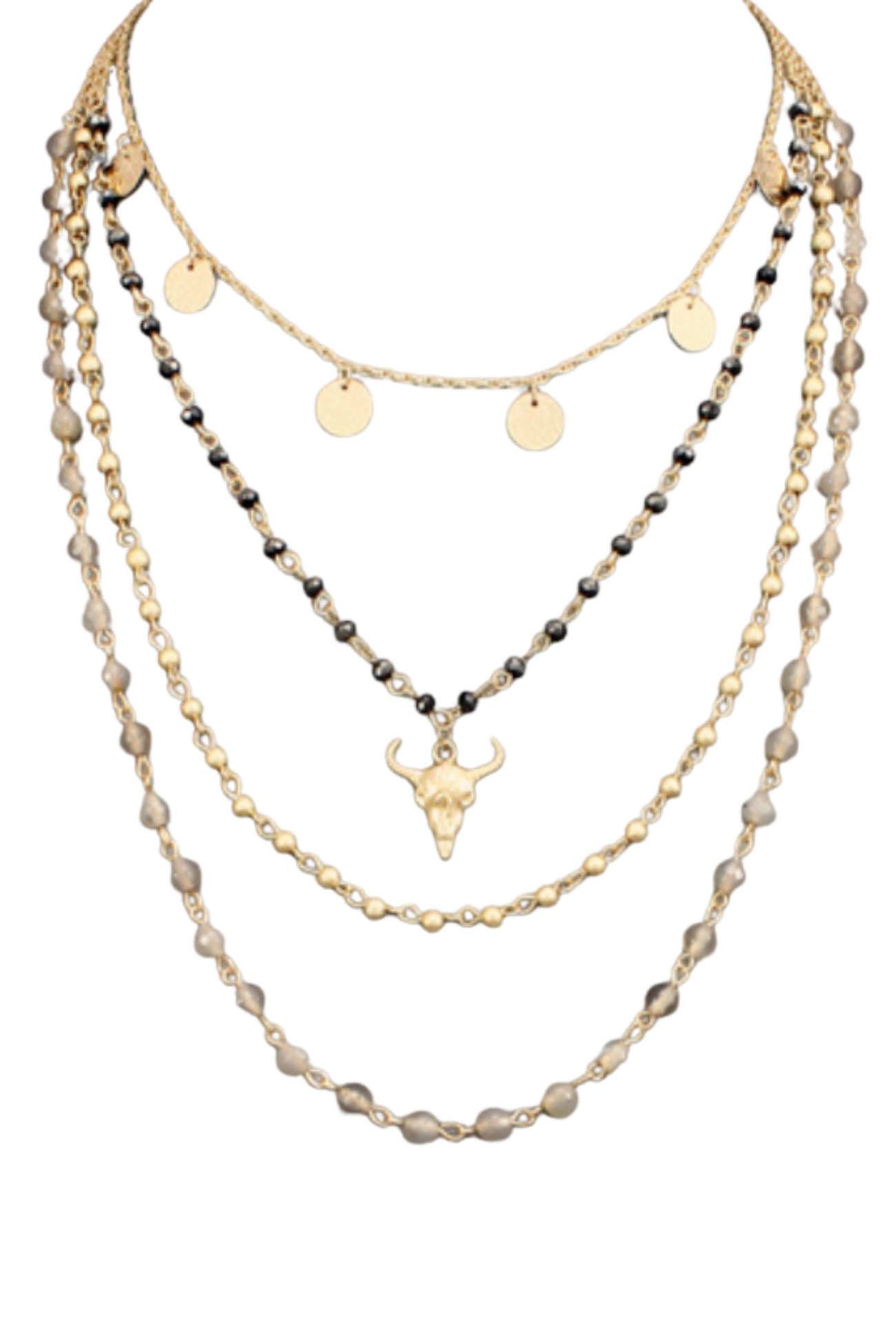 Embrace bold western style with this striking layered necklace featuring delicate beaded strands and charming longhorn pendant details. Each layer adds dimension and movement, creating an eye-catching look that transitions effortlessly from casual to dressed up. Perfect for adding a touch of southwestern flair to any outfit.