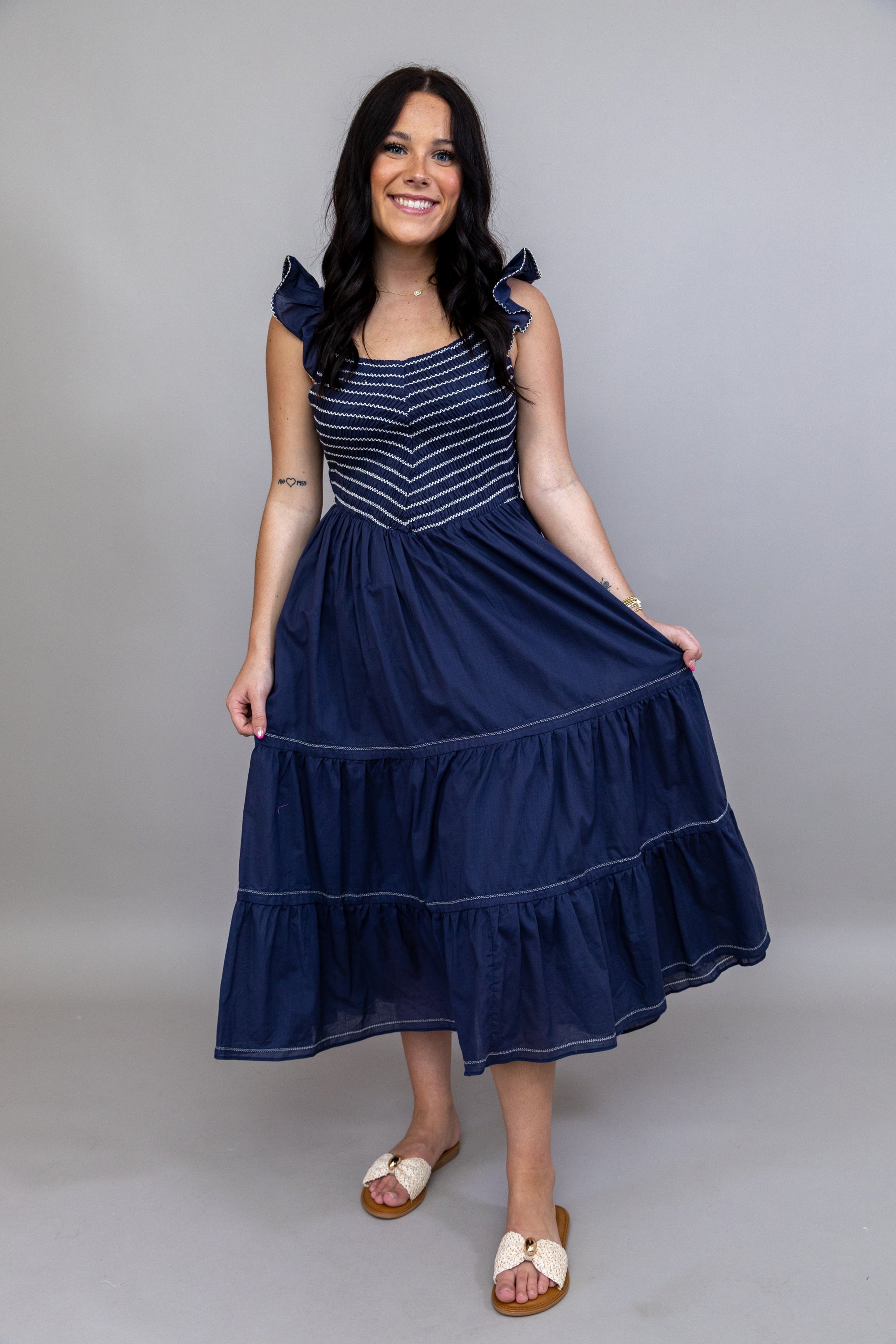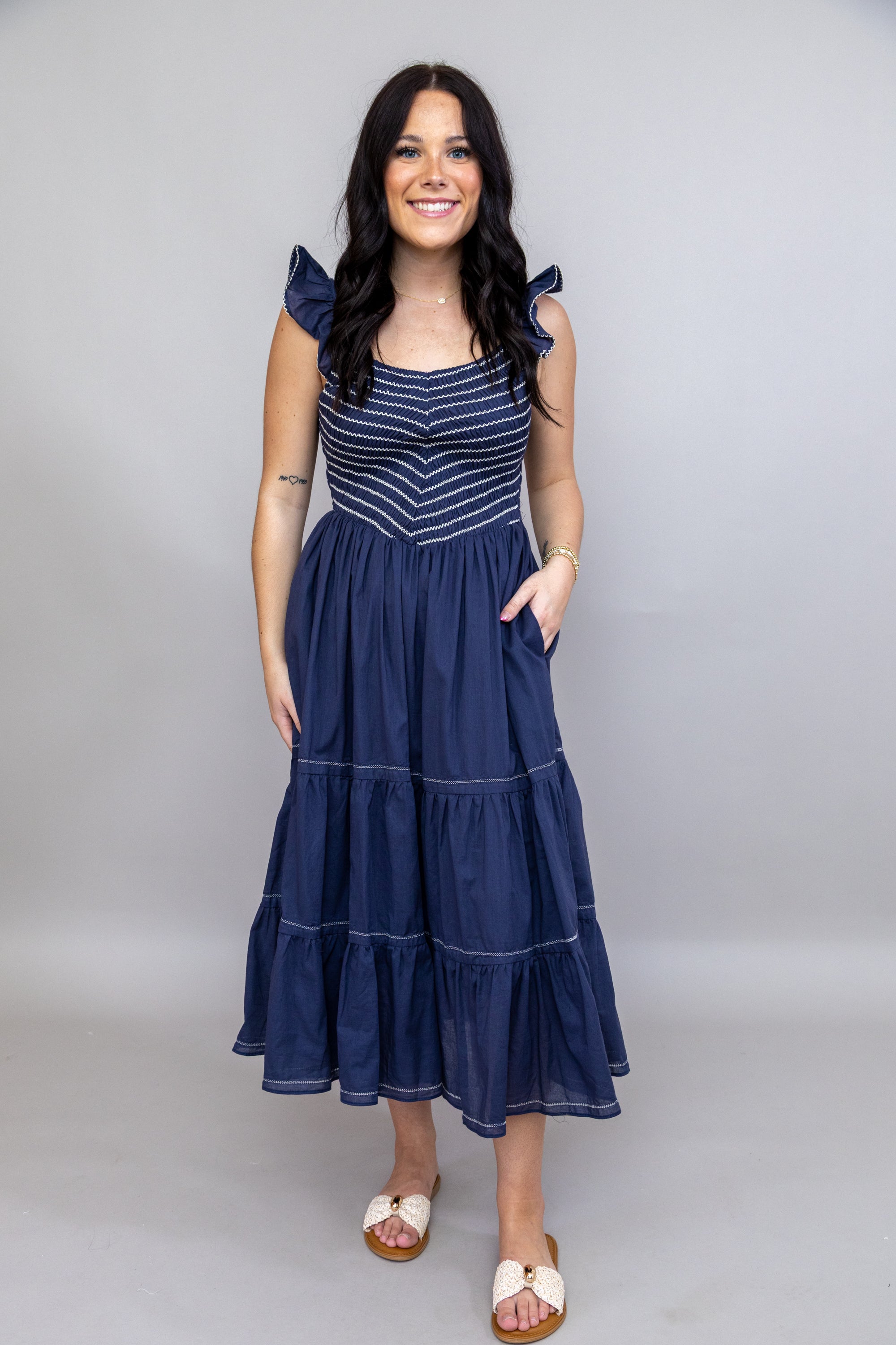 The No Time Like Now Midi Dress combines thoughtful design details for all-day comfort and style. A smocked bodice provides gentle shaping and visual texture, while the empire waist flatters your silhouette with a classic, feminine cut. Adjustable straps ensure the perfect fit for your frame, allowing you to customize comfort and support. This versatile midi dress works beautifully for brunch, work, or evening plans—a wardrobe staple that adapts to your lifestyle!