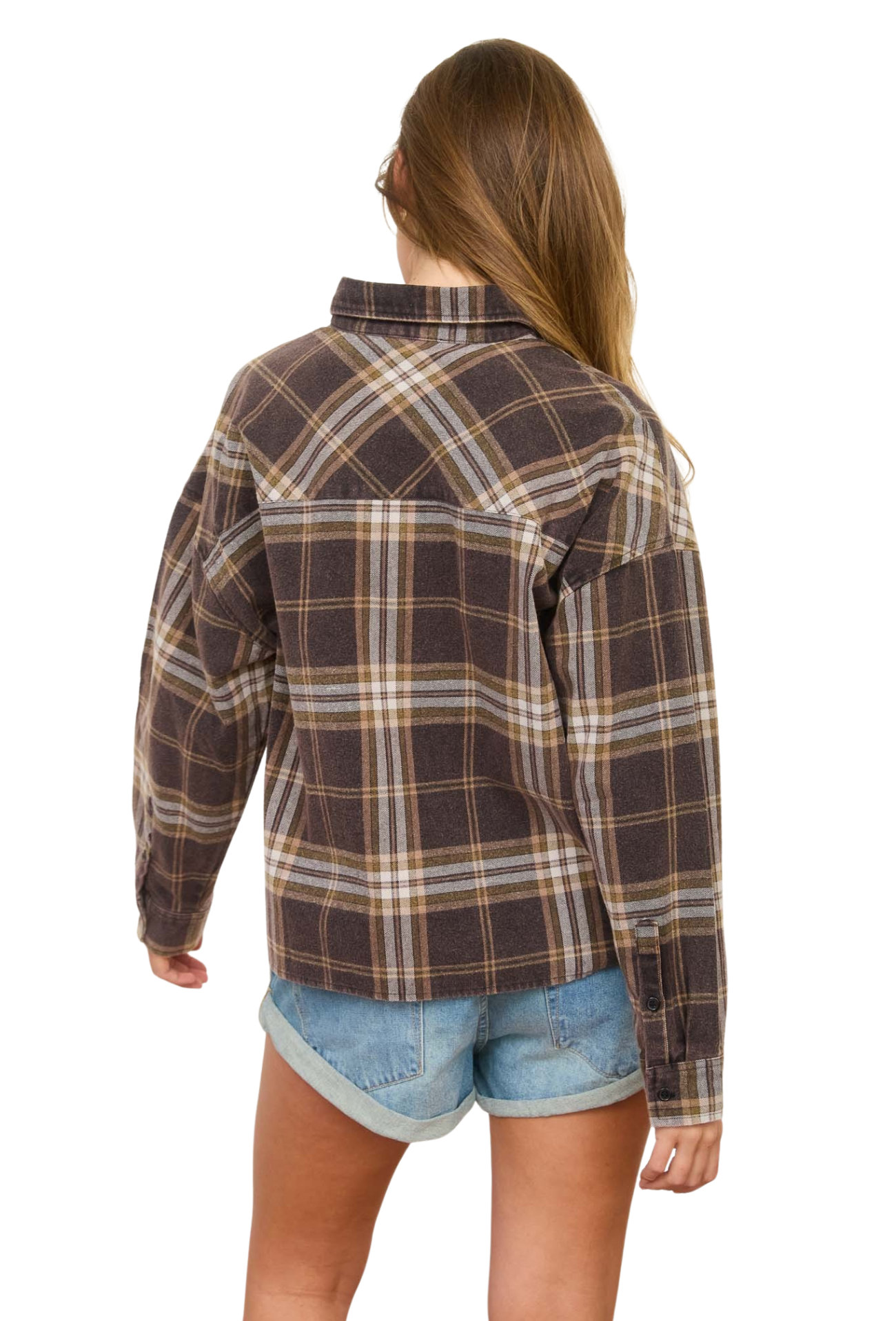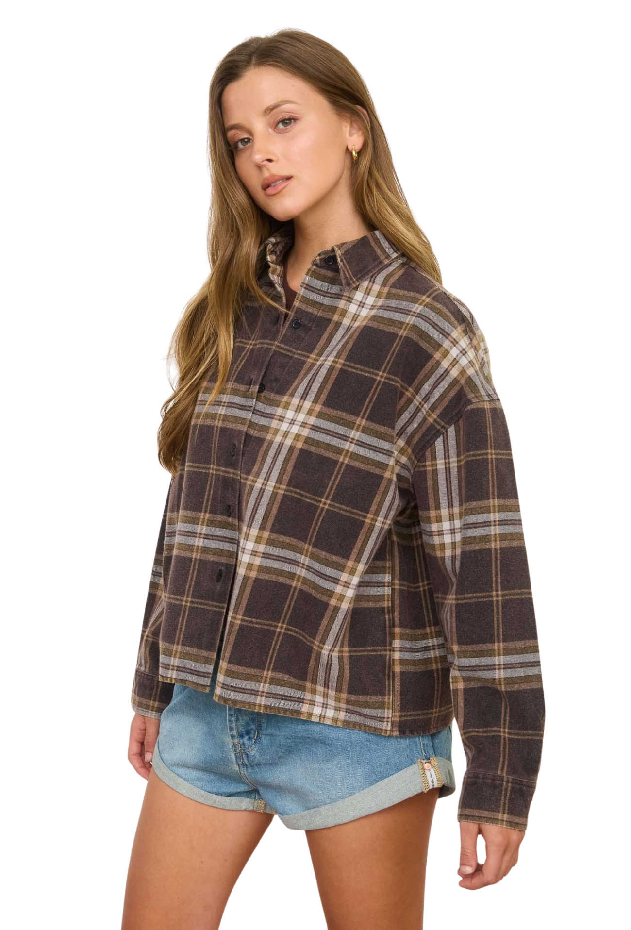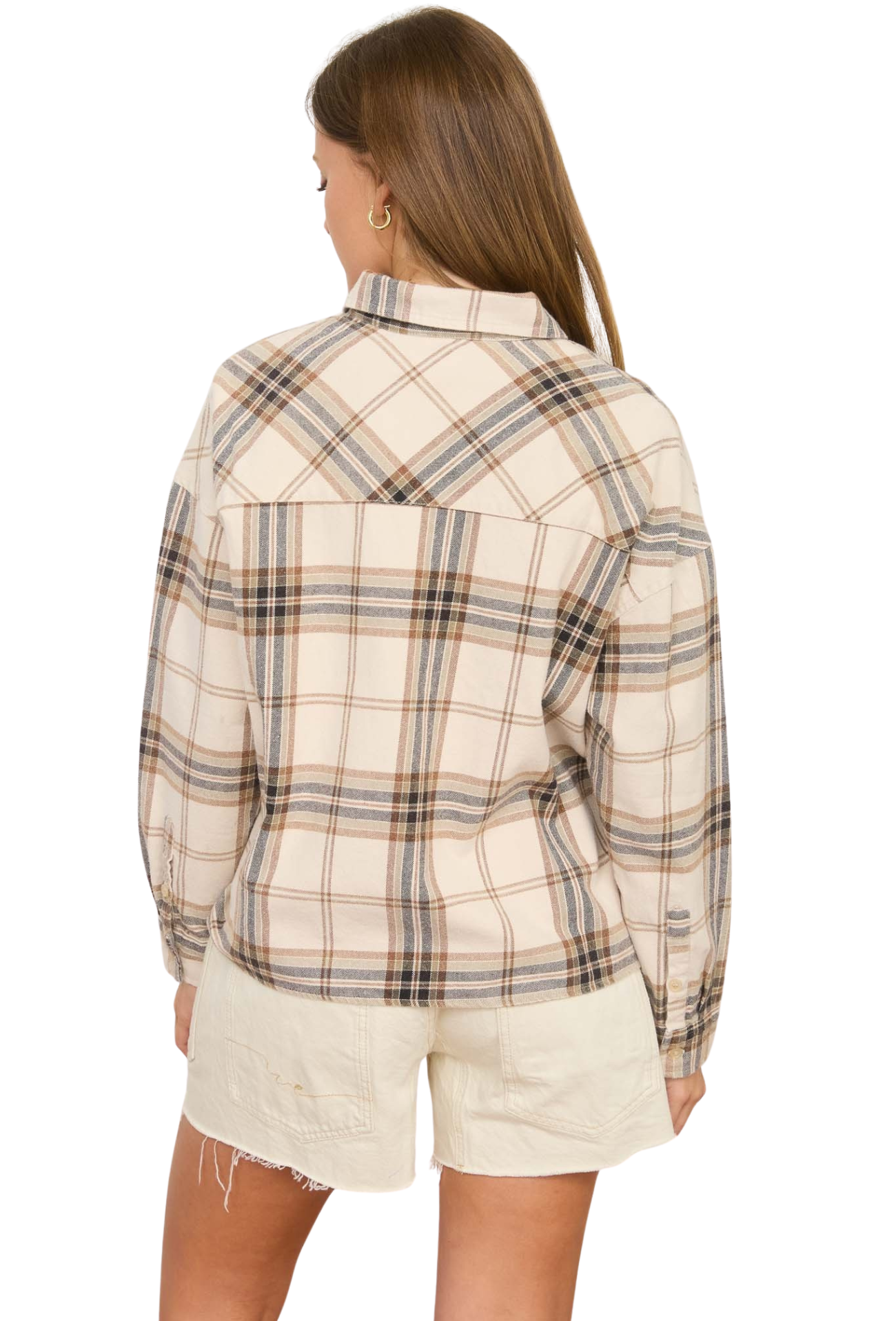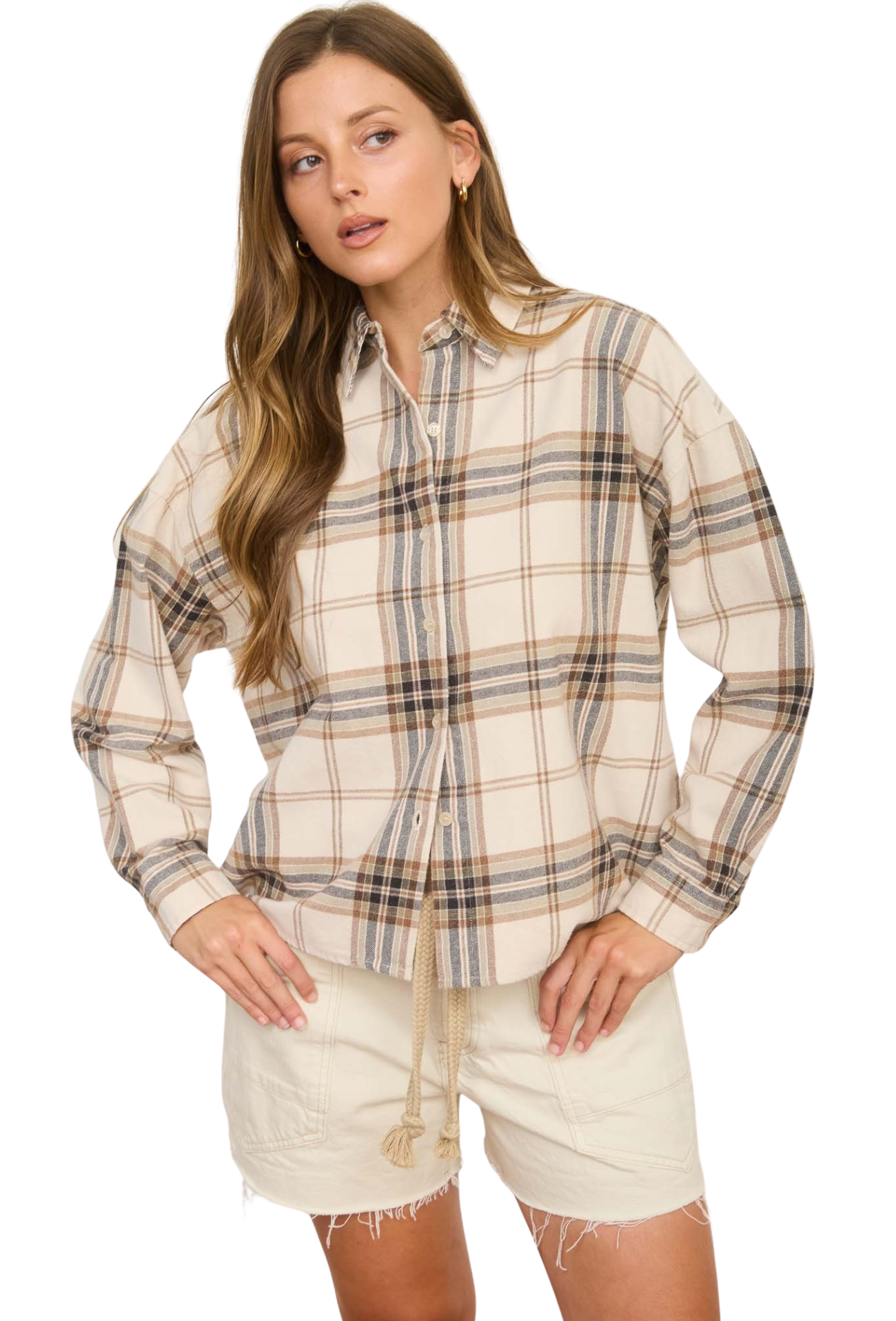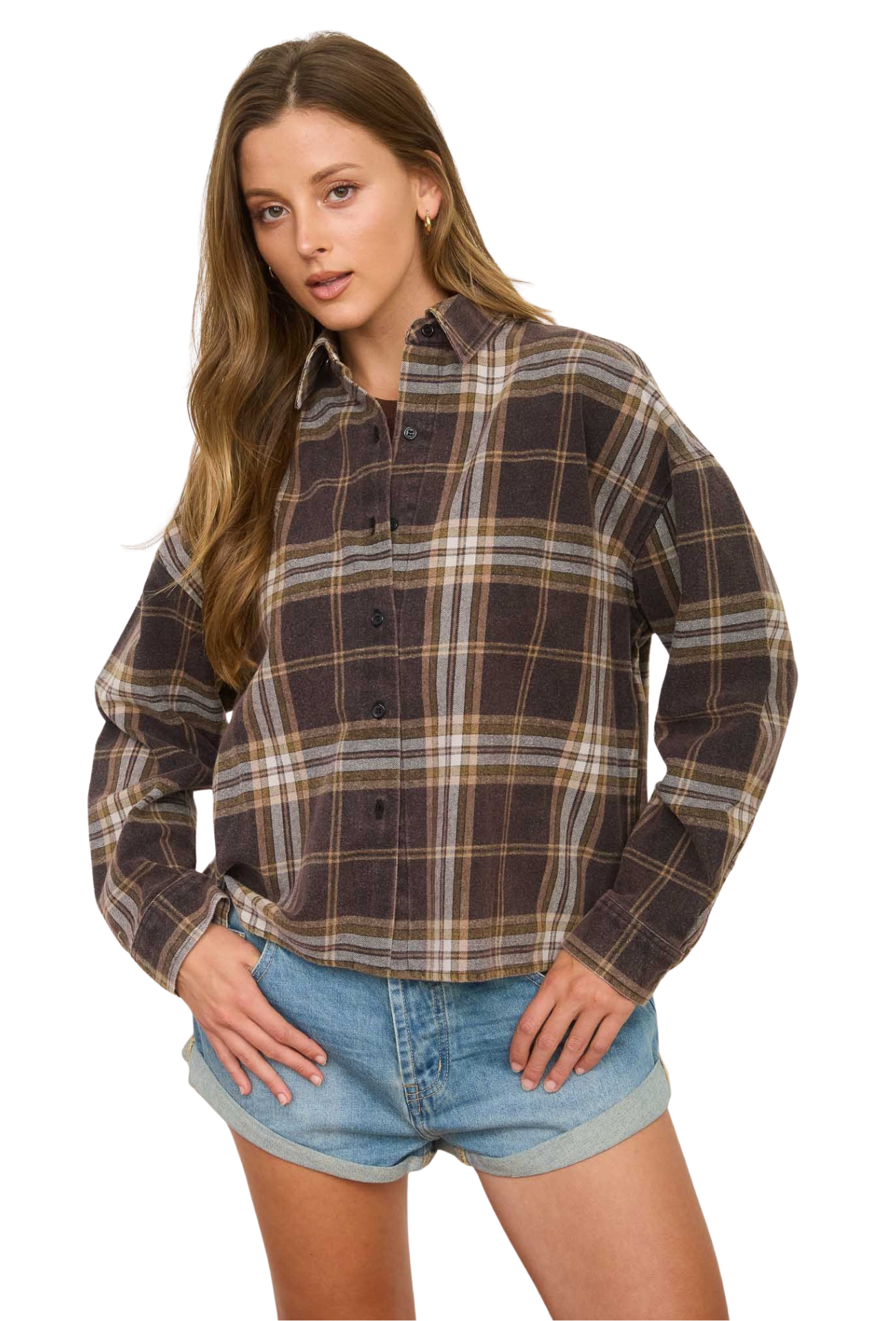 Step into understated sophistication with the Retro Vibes Flannel, where vintage aesthetics meet contemporary comfort. This woven plaid top combines a structured collared neckline with a relaxed boxy silhouette and drop shoulder design that flatters every frame. Button-down styling offers endless styling possibilities—wear it as a standalone statement piece or layer it effortlessly over basics for added dimension. Long sleeves provide versatile coverage perfect for any season, while the classic plaid pattern brings timeless character to your everyday rotation. Whether you're channeling 90s nostalgia or simply seeking a reliable wardrobe staple, this flannel delivers authentic style that never goes out of fashion.