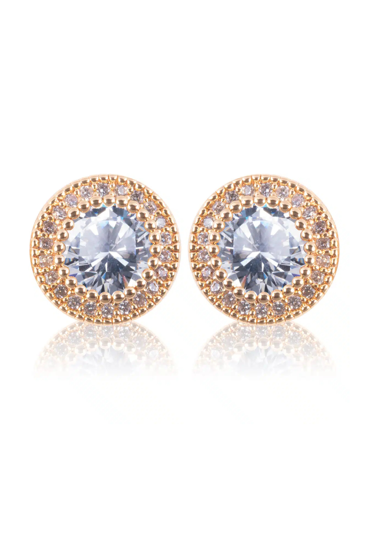 Elevate your everyday elegance with these stunning Round Halo Stud Earrings. Featuring a mesmerizing blue sparkle at the center, each earring is crowned with a radiant gold halo that catches the light beautifully. The perfect balance of sophistication and shimmer, these versatile studs transition seamlessly from day to night, adding a touch of refined glamour to any look. A timeless investment piece that celebrates your refined taste.