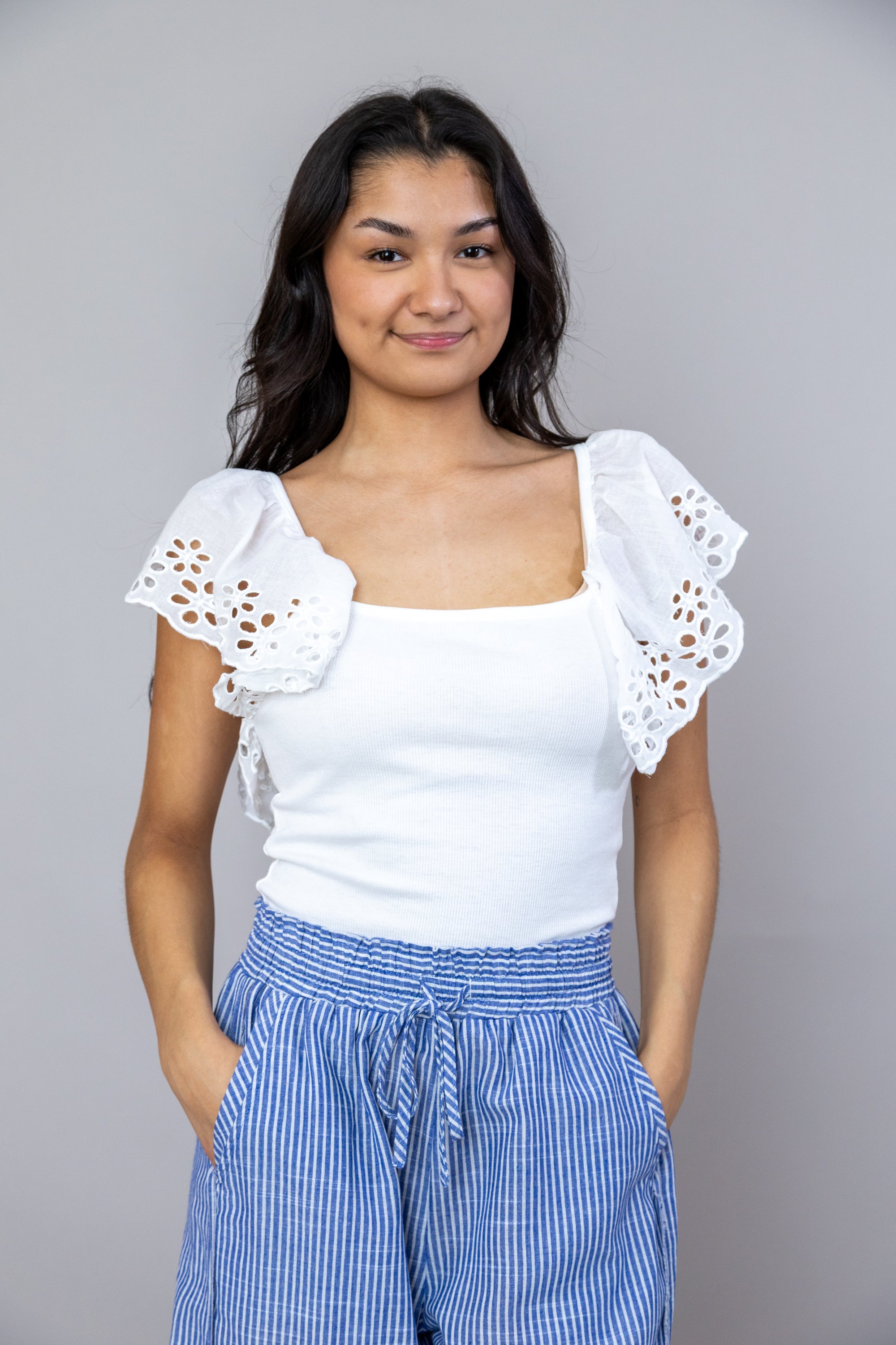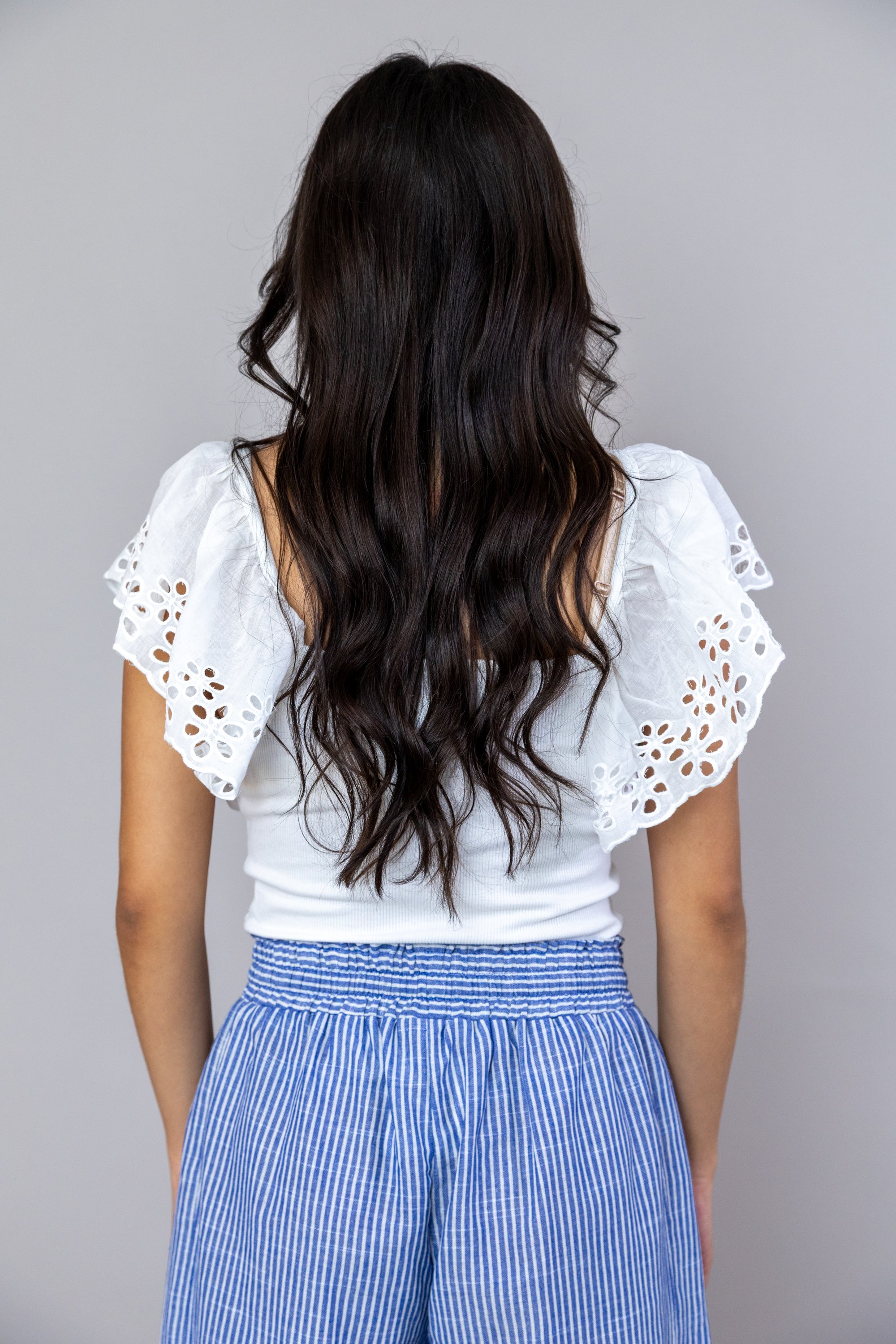 Step into the season with this breezy crop top that combines timeless details with modern appeal. The square neckline frames your shoulders beautifully while delicate eyelet puff sleeves add a playful, romantic flair. Crafted from ribbed fabric for a smooth, supportive fit, this piece transitions seamlessly from casual days to evening outings. Style it high-waisted or layered for endless versatility!