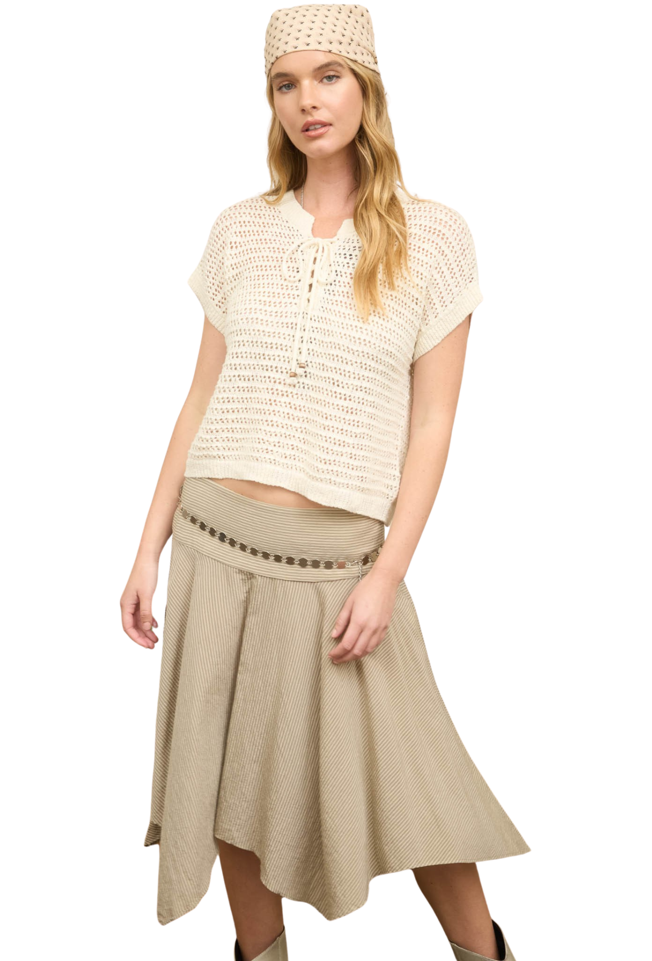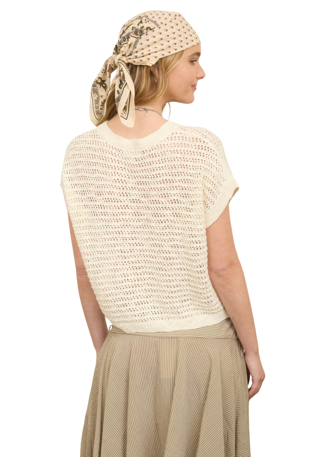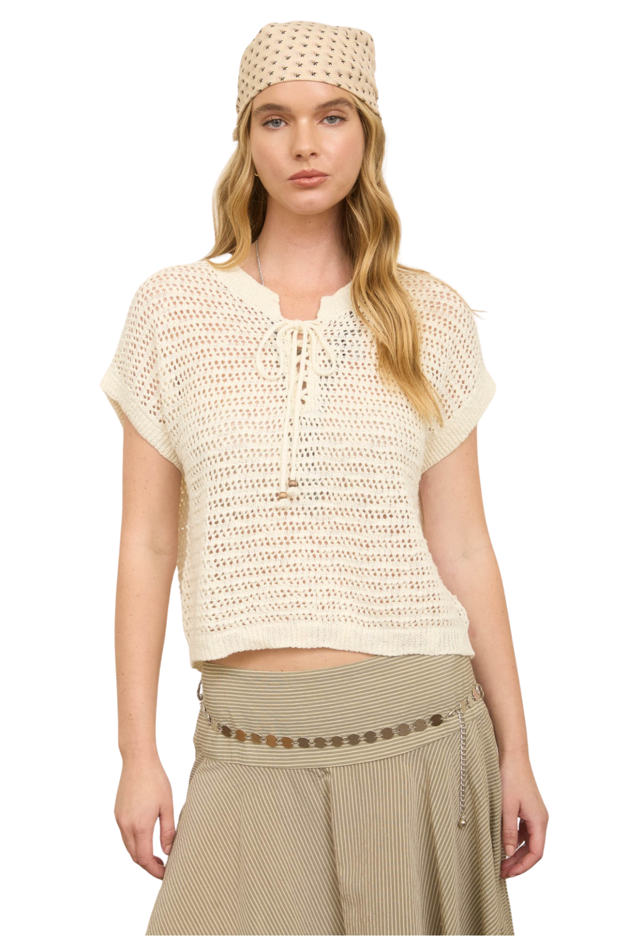 Embrace effortless elegance with this charming short-sleeve sweater, crafted from soft crochet knit that drapes beautifully. The delicate cap sleeves offer a flattering, feminine silhouette, while the adjustable lace-up neckline lets you customize your look from modest to playfully daring. Perfect for layering or wearing solo, this versatile piece transitions seamlessly from casual days to special occasions. The breathable crochet construction keeps you comfortable while the intricate texture adds visual interest and dimension. A timeless wardrobe essential that combines comfort with undeniable style.