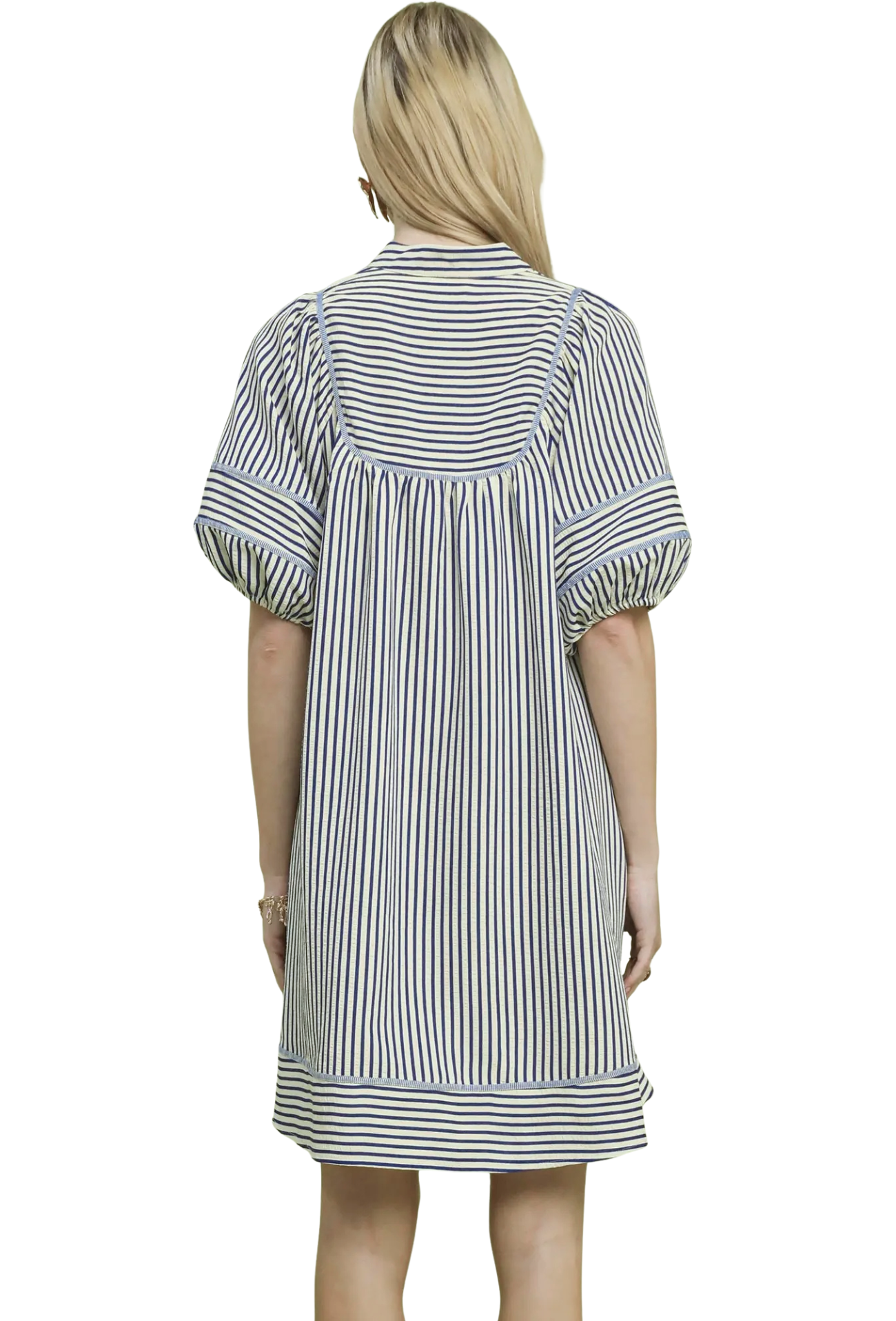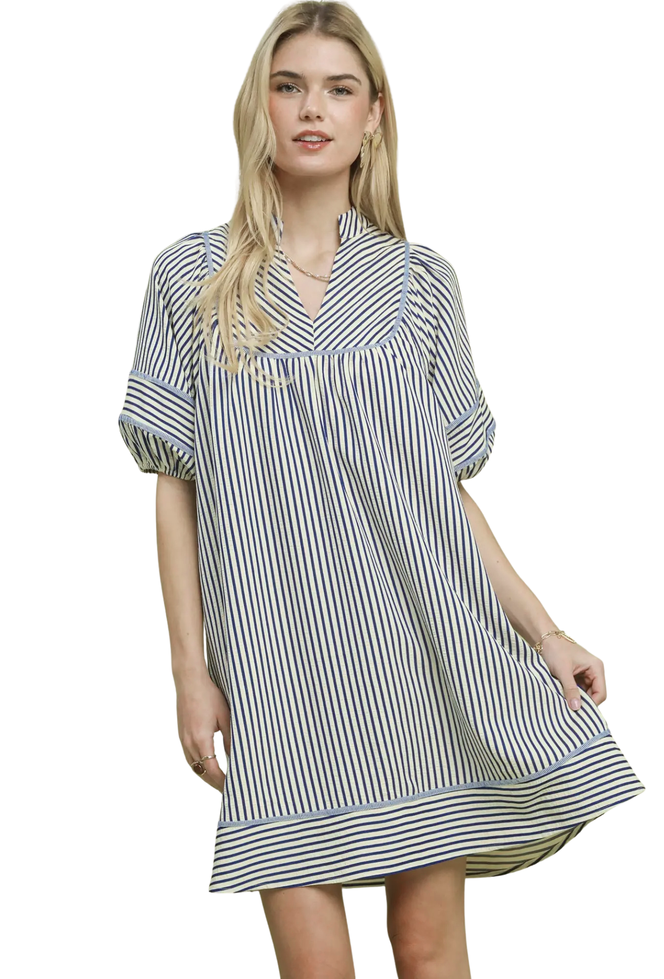 Embrace effortless style with the Sunny Days Dress, featuring a flattering v-neck neckline that elongates your silhouette. The classic striped pattern adds visual interest and versatility, pairing seamlessly with your favorite accessories. Puff sleeves bring a touch of feminine charm and movement, creating a look that's both playful and polished. Perfect for casual outings or dressed-up occasions, this dress delivers comfort without compromising on style. Make it your go-to piece for days when you want to look put-together with minimal effort.