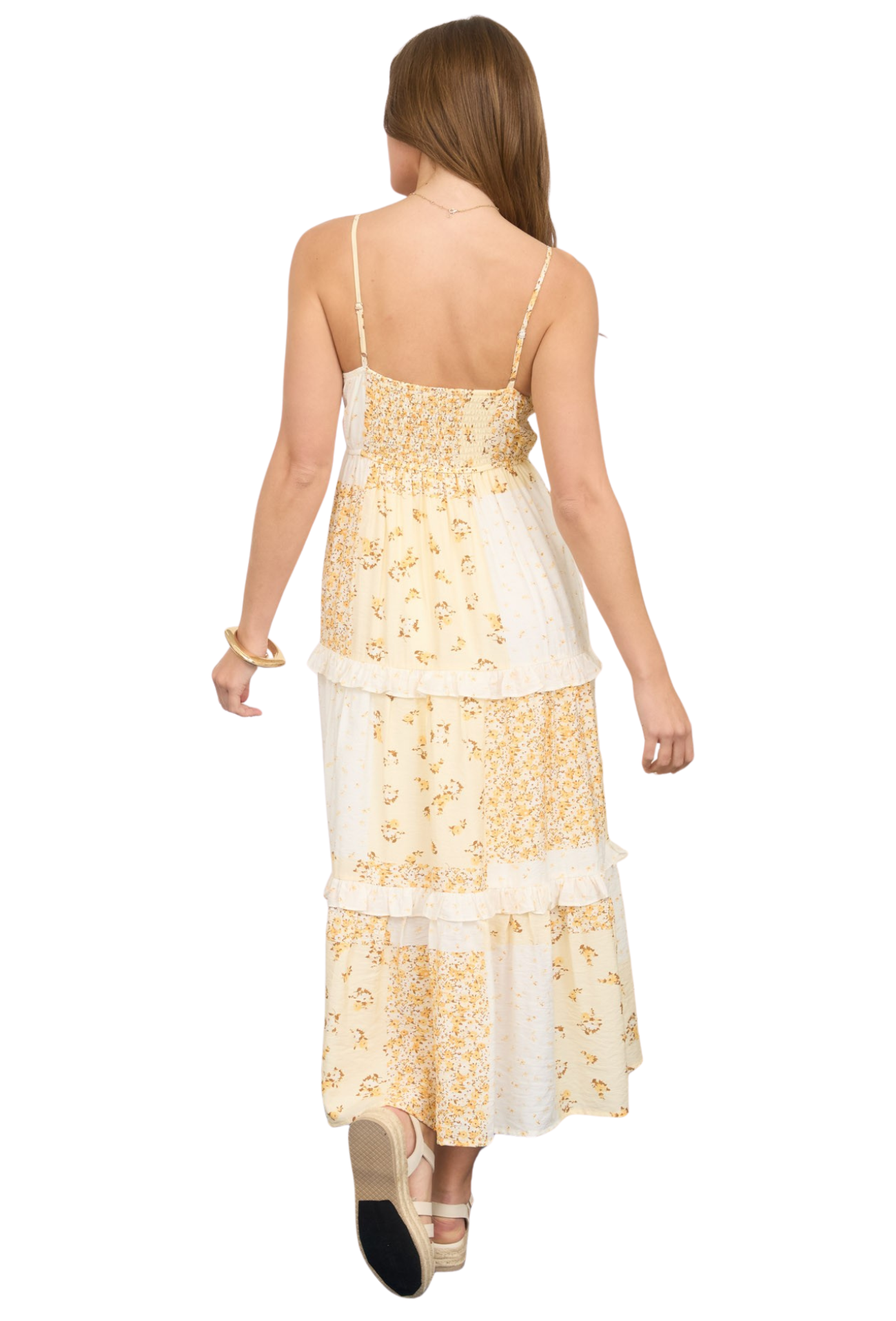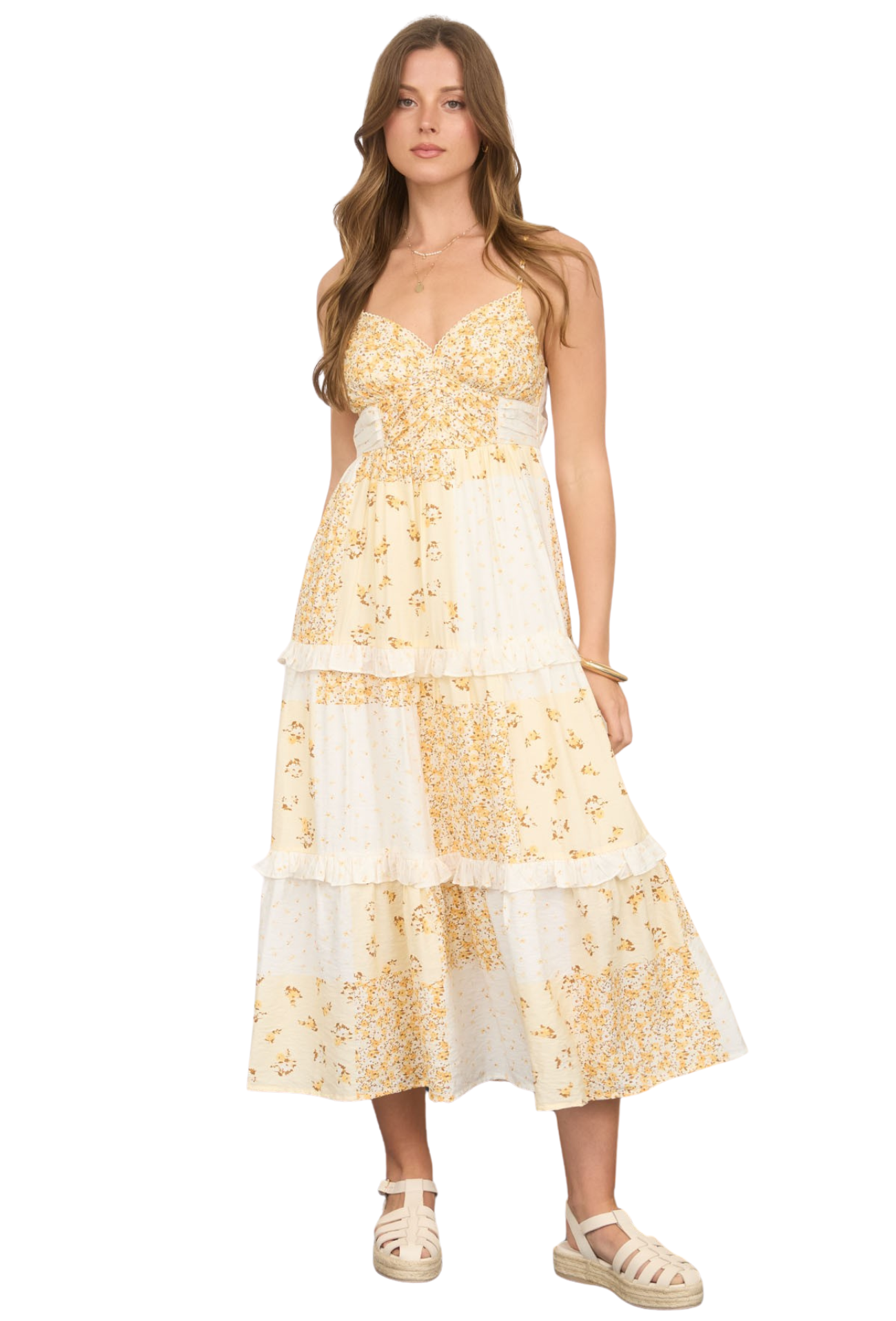 Embrace effortless elegance in this charming midi dress, designed to make you feel radiant. Delicate floral patterns create a romantic aesthetic, while playful ruffle details add movement and dimension. The fitted shirred waist defines your silhouette beautifully, and the sweetheart neckline offers a flattering, timeless touch. Perfect for garden parties, brunch dates, or any occasion calling for understated sophistication.