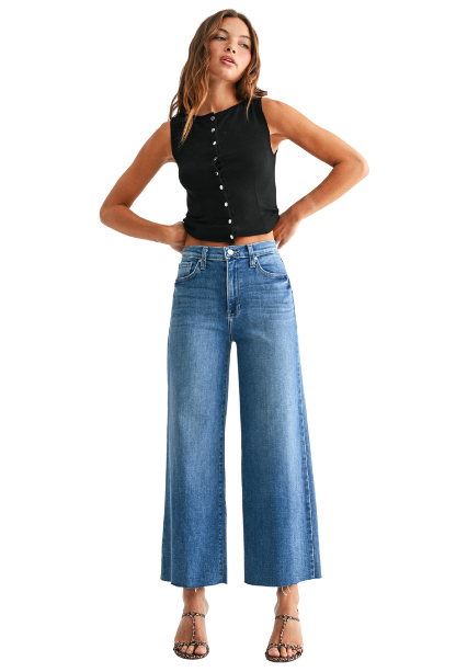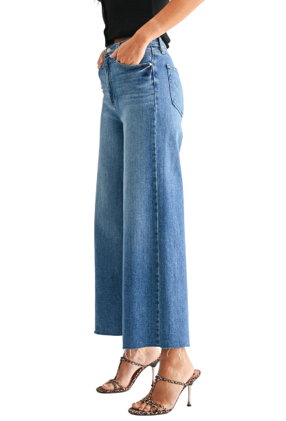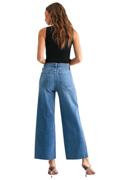 These Just Black Denim Maria HR Wide Leg Jeans feature a flattering high-rise fit and a stylish raw hem for an effortlessly chic look. Crafted with stretch fabric, they ensure all-day comfort and ease of movement while accentuating your silhouette. Perfect for elevating any casual outfit with a modern, relaxed vibe.