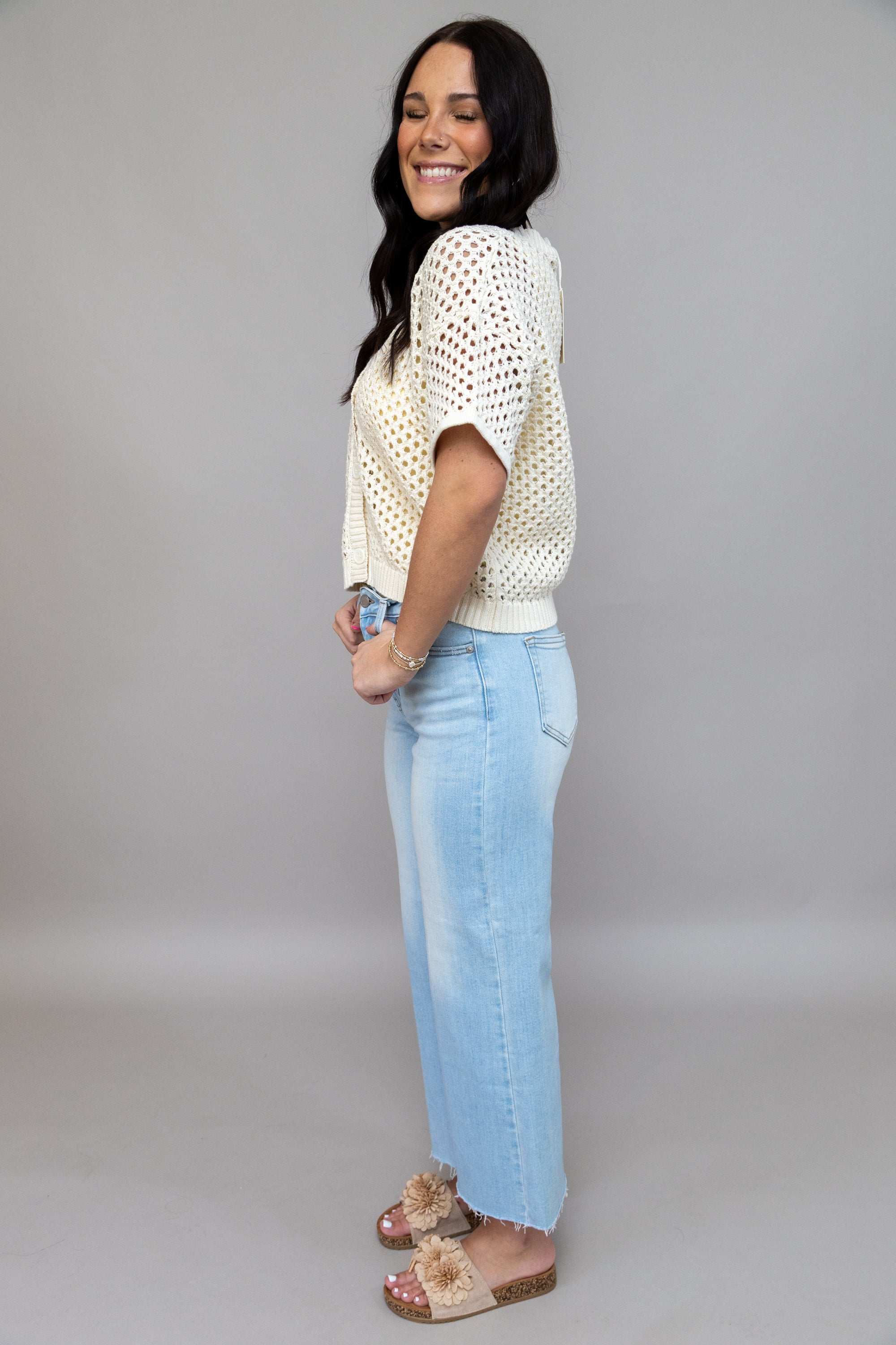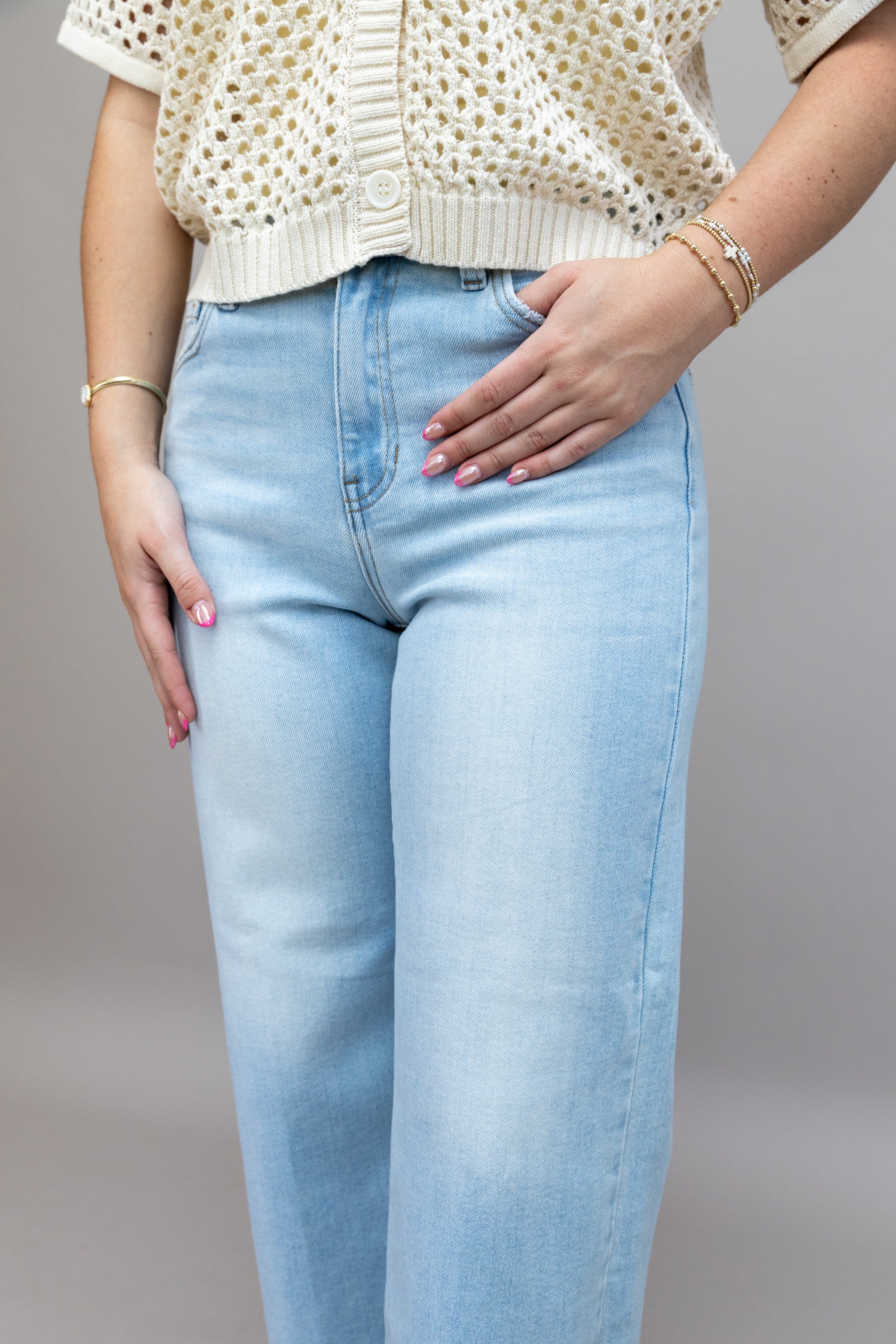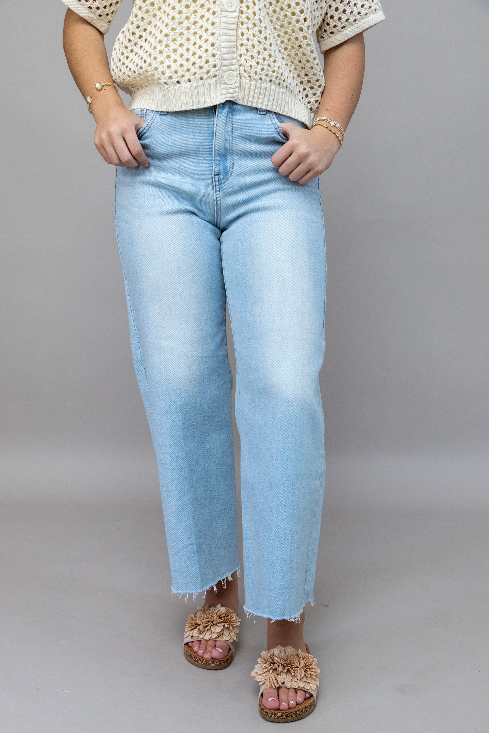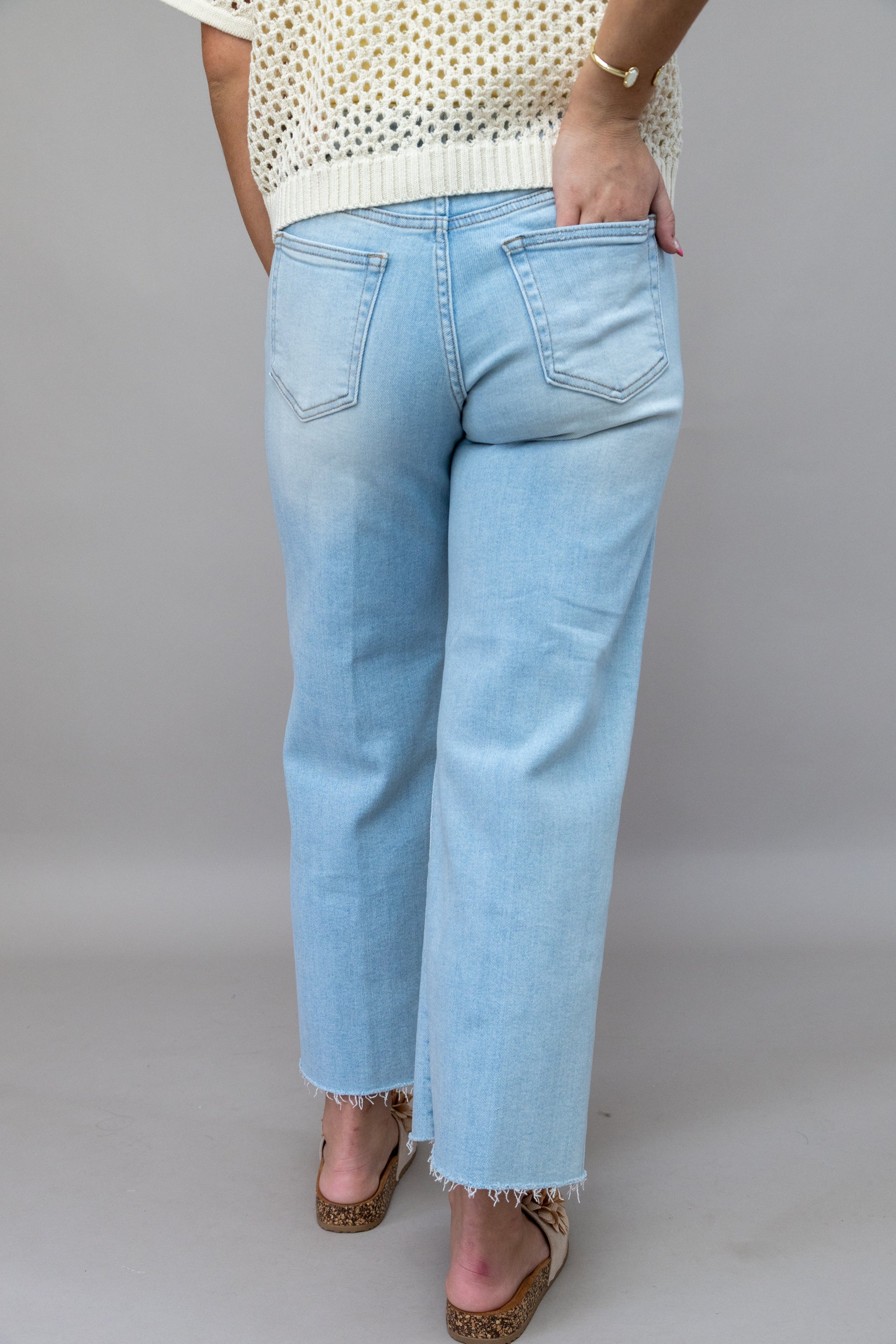 Elevate your everyday style with these mid-rise wide-leg jeans that effortlessly blend comfort and edge. The light wash creates a versatile, approachable look that pairs with everything in your closet, while the raw hem adds an undeniable touch of modern attitude. Perfect for those who want their denim to make a statement without trying too hard. Dress them up or down—these jeans are your new go-to for looking put-together with minimal effort.