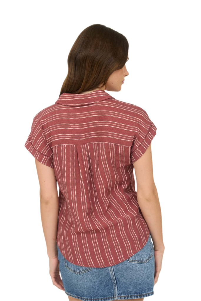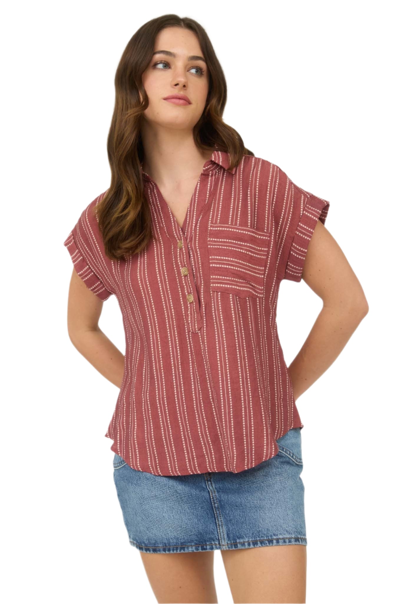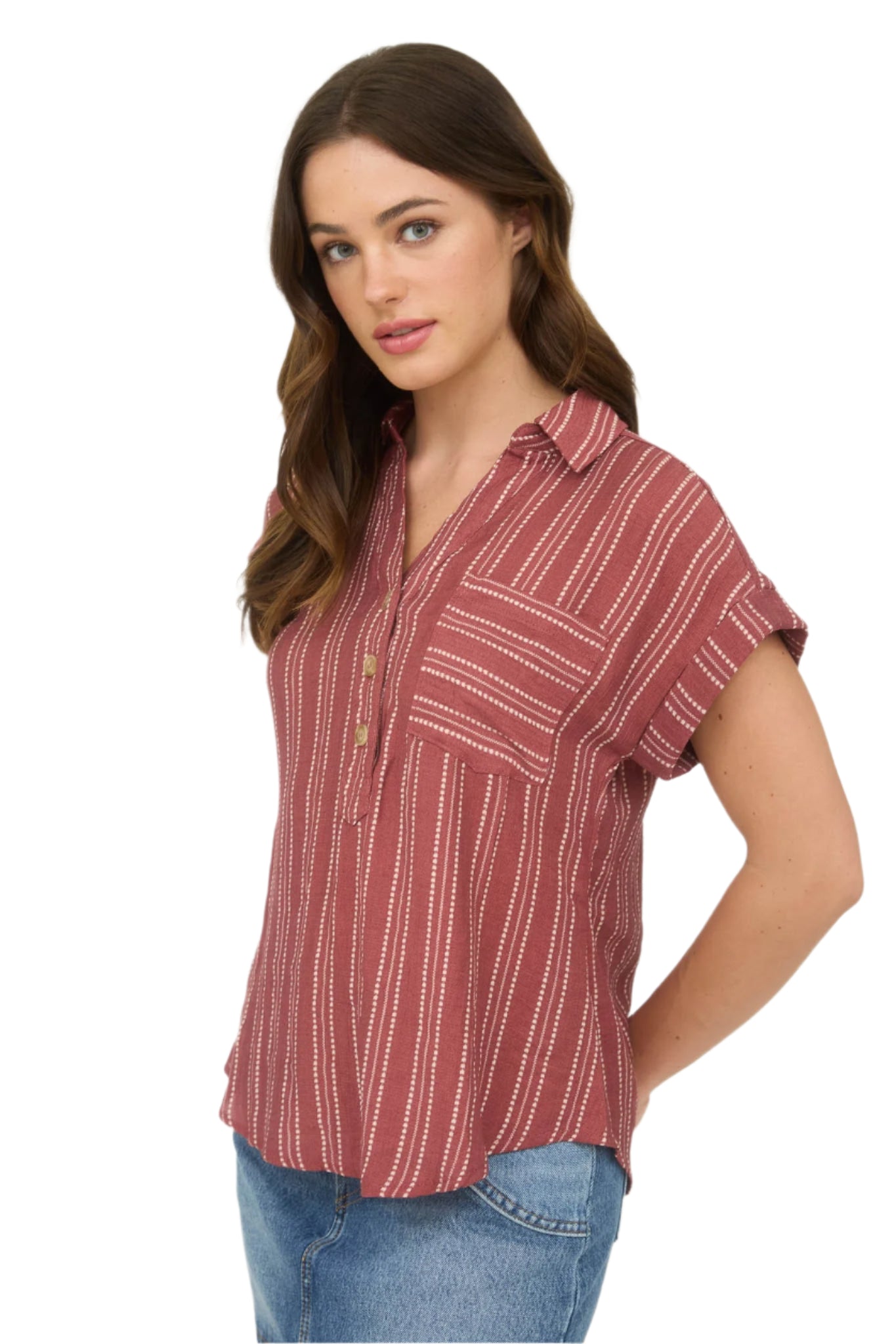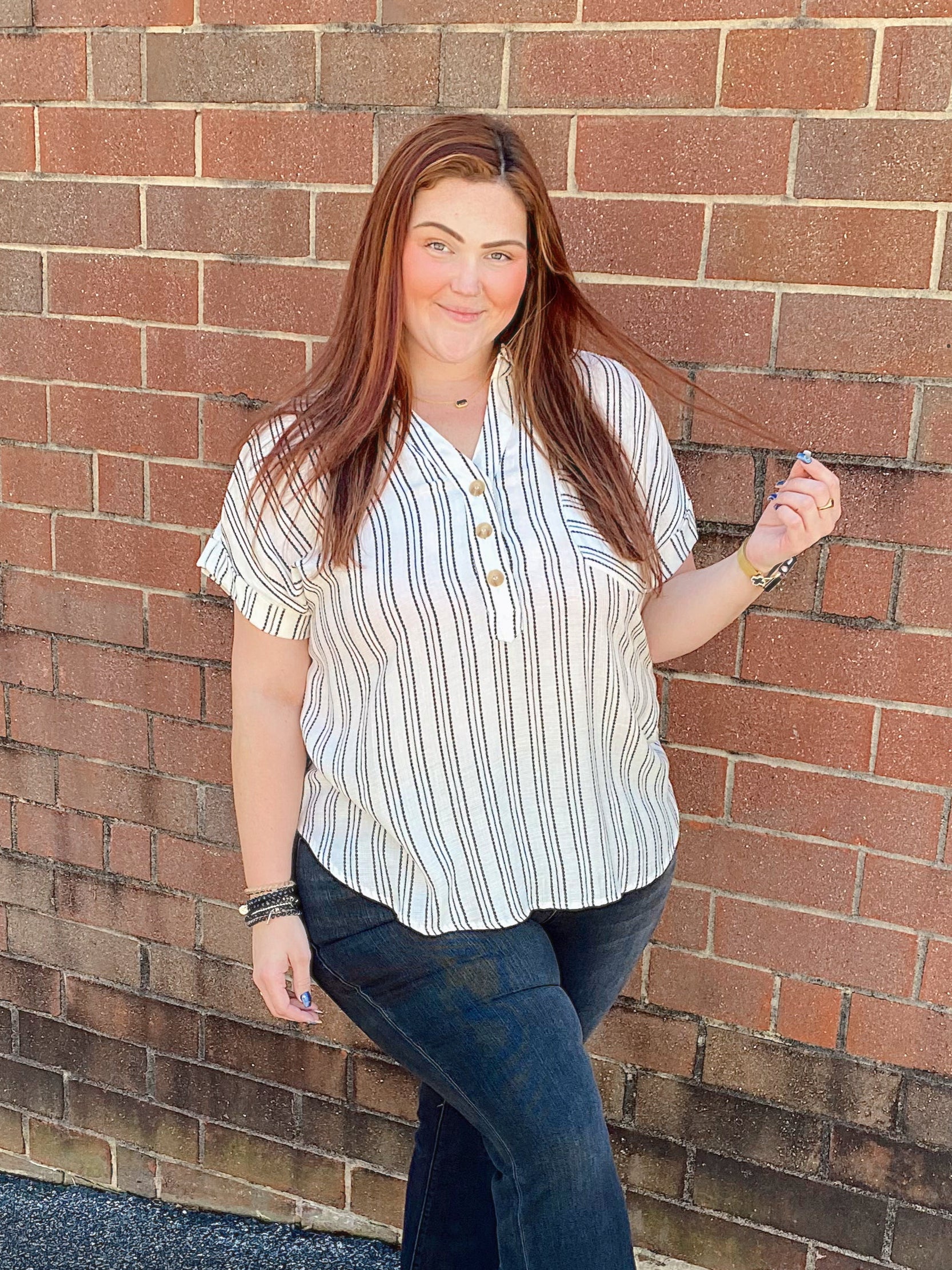 This charming top features playful striped fabric and cuffed short sleeves, adding a touch of casual elegance to your wardrobe. Its flattering fit and cute design make it perfect for everyday wear or dressing up for a relaxed outing. Embrace comfort and style effortlessly with this versatile piece.