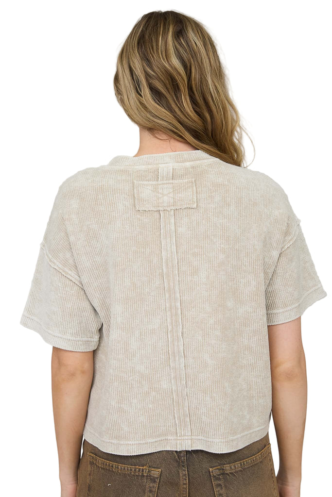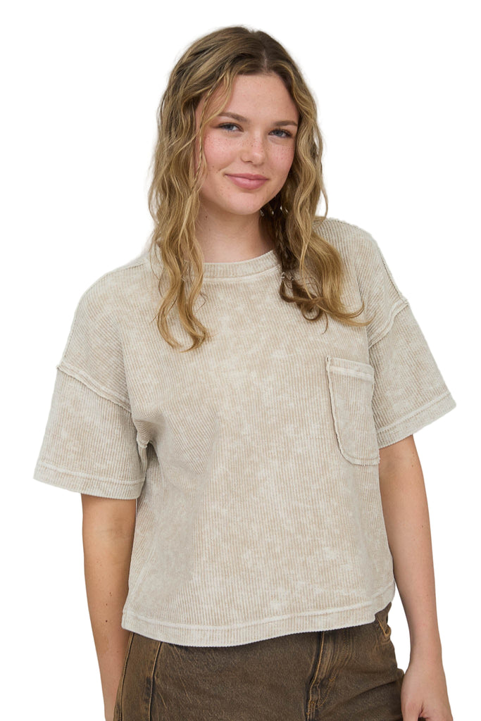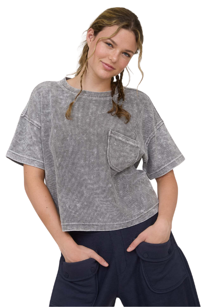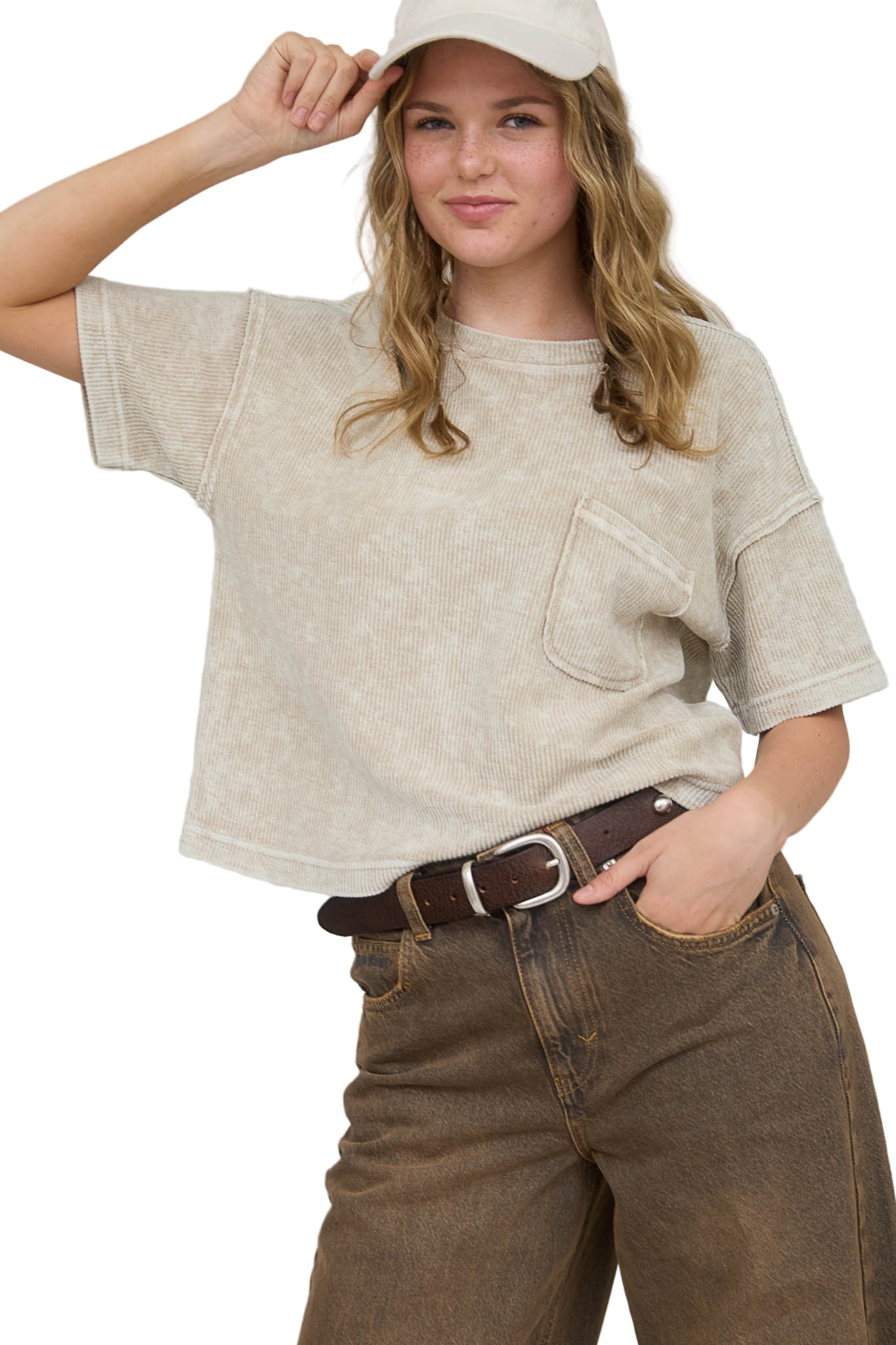 The Casual Cutie Pocket Tee combines the cozy feel of knit fabric with the ease of short sleeves, making it an elevated basic for your wardrobe. Perfect for layering or wearing on its own, this tee offers effortless style and comfortable fit, enhanced by a charming pocket detail that adds subtle character to your everyday look.