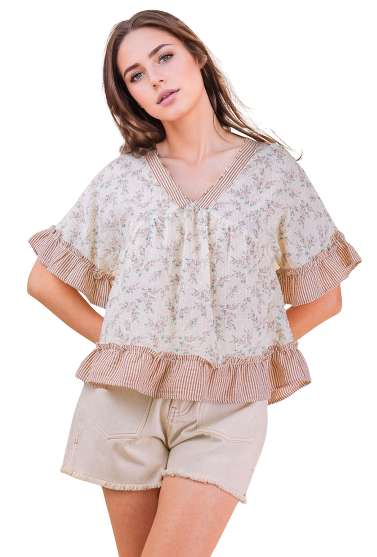 Embrace the season with this charming Finders Keepers Top, featuring a flattering v-neck and delicate ruffles that capture spring's romantic spirit. The vibrant floral print brings garden-fresh elegance to your wardrobe, perfect for layering or wearing solo. Designed to turn heads and lift your mood, this piece effortlessly transitions from casual brunches to evening outings. Let this blooming beauty become your go-to for looking polished and feeling confident all season long.