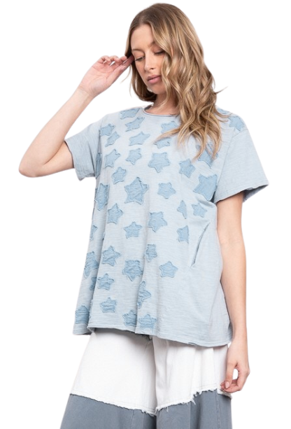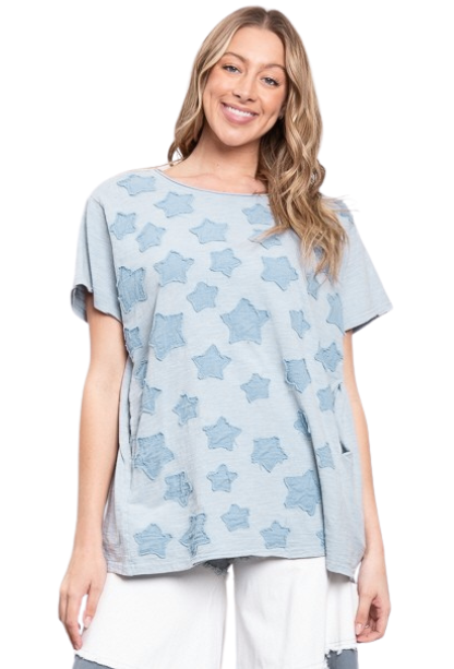 Introducing our Star Of The Show Patchwork Top! This boho-inspired top features an oversized fit, perfect for a relaxed and comfortable look. The patchwork star design adds a touch of charm and uniqueness, while the pockets add convenience and functionality. Be the star of any occasion with this must-have top!
