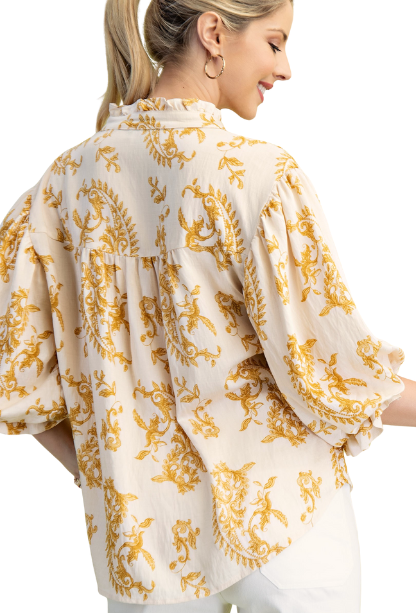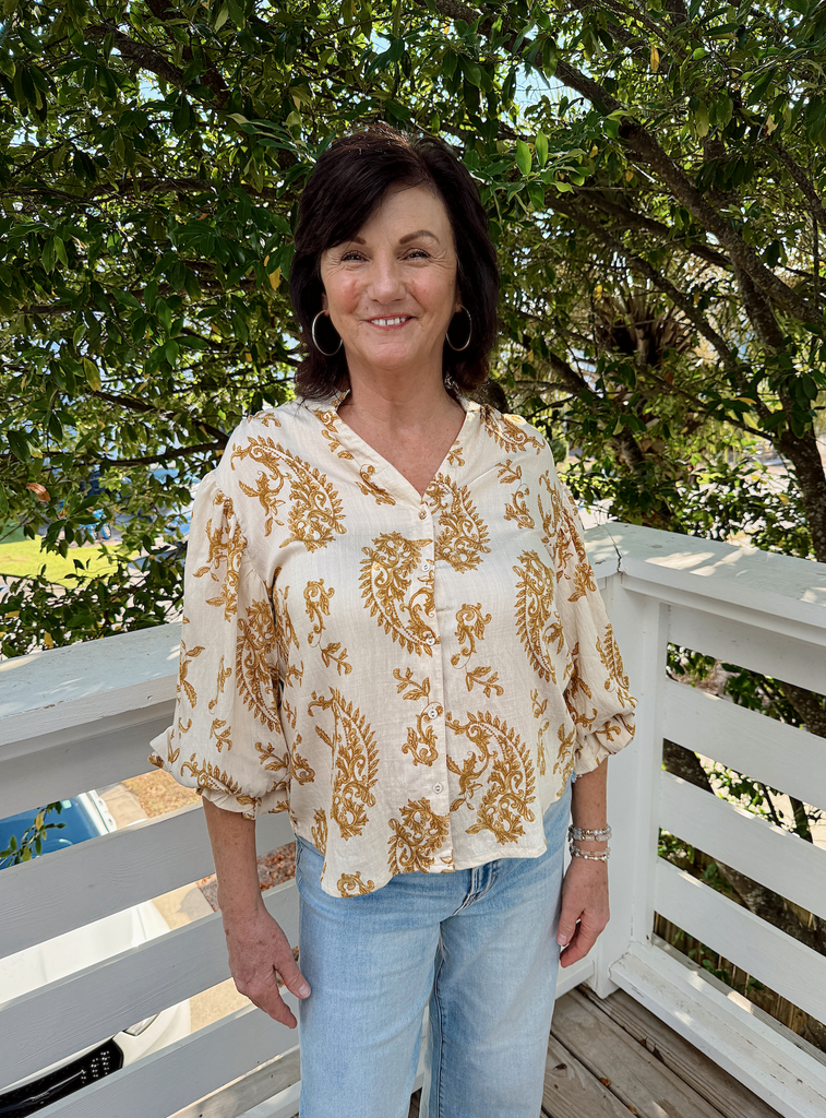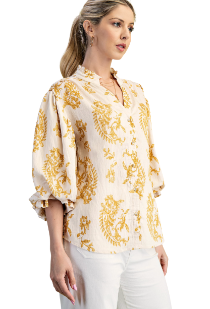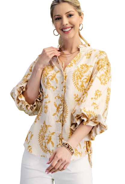 Elevate your wardrobe with the Take A Chance Blouse, featuring elegant puff sleeves that add a touch of romantic flair. Delicate button details enhance its sophisticated design, making it perfect for both casual outings and special occasions. Embrace effortless style and confidence every time you wear it.