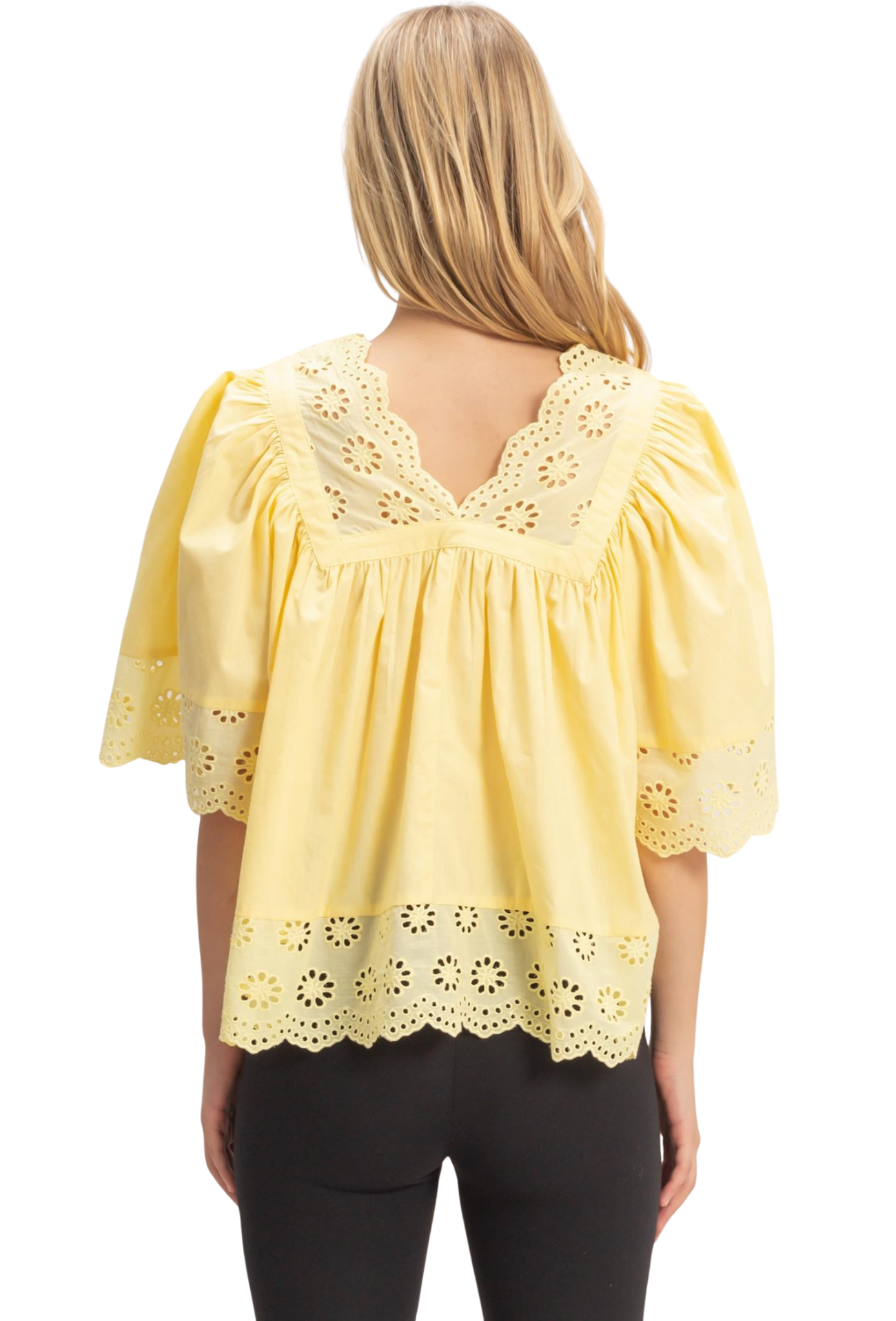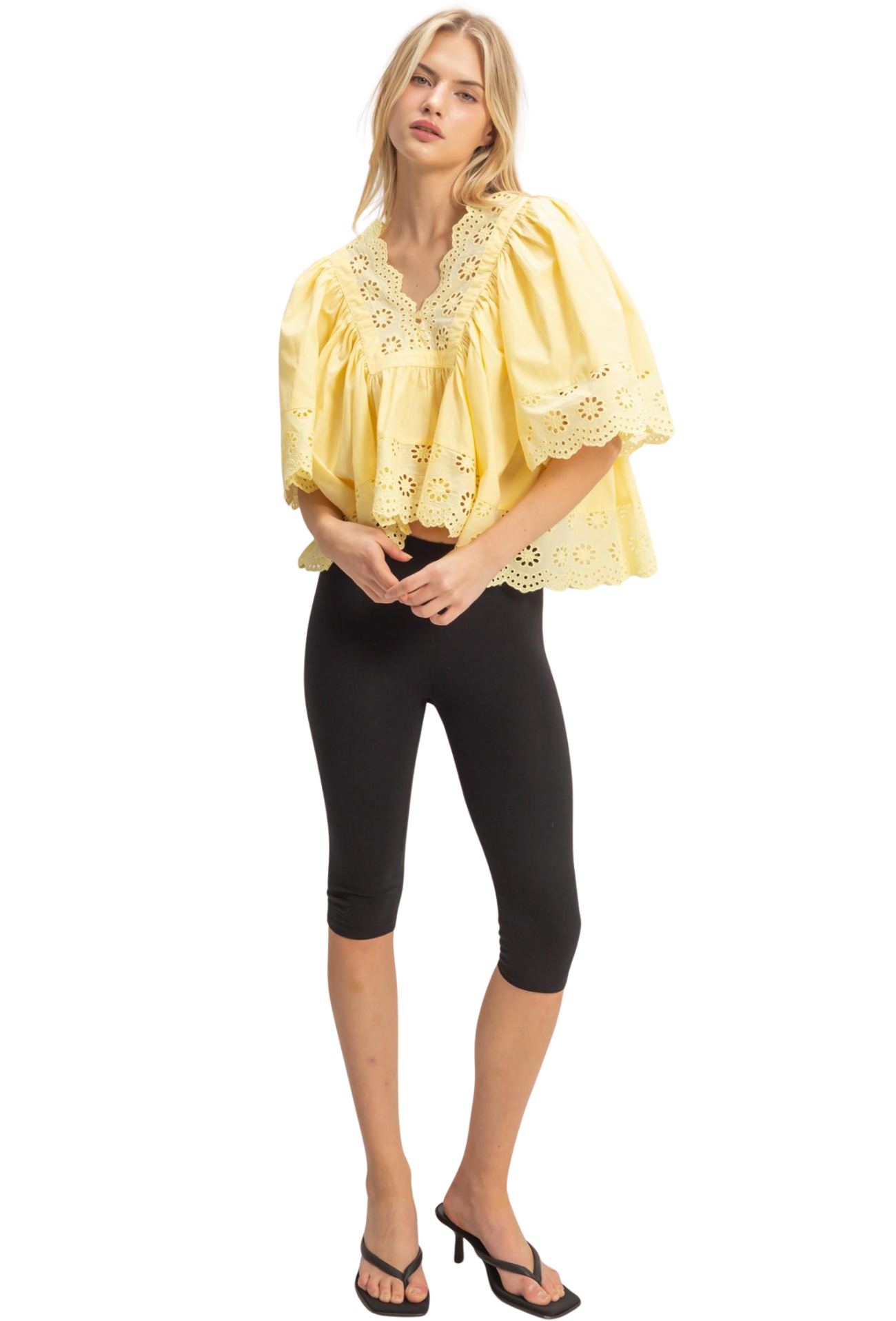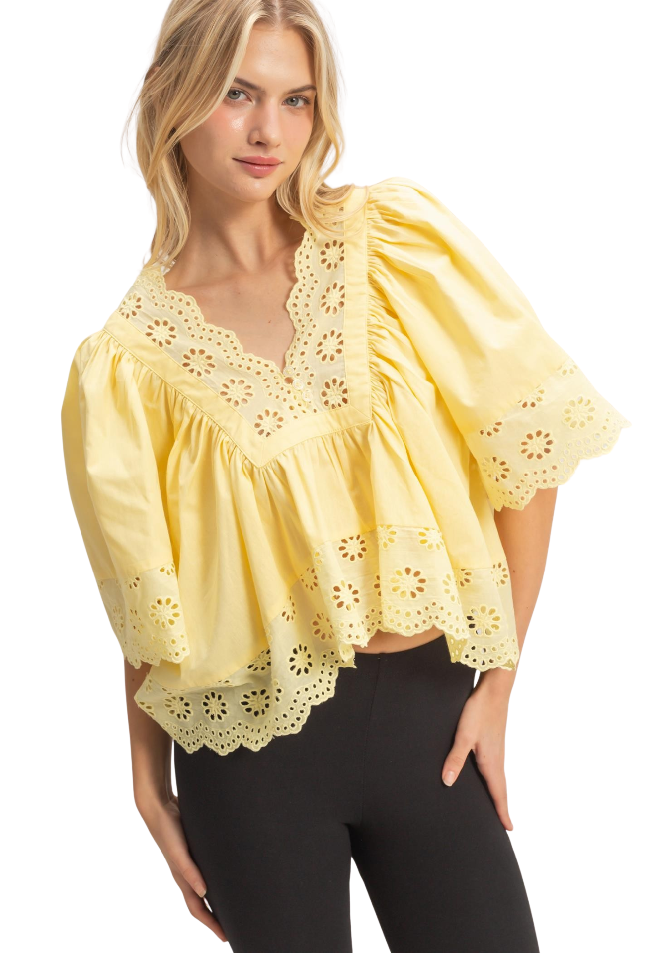 Brighten your wardrobe with this charming babydoll top featuring delicate eyelet trim details and a flattering V-neck silhouette. The cropped cut offers a modern, playful vibe perfect for pairing with high-waisted bottoms. Lightweight and versatile, this piece transitions effortlessly from casual days to evening outings. A wardrobe essential that brings sunshine to any look.