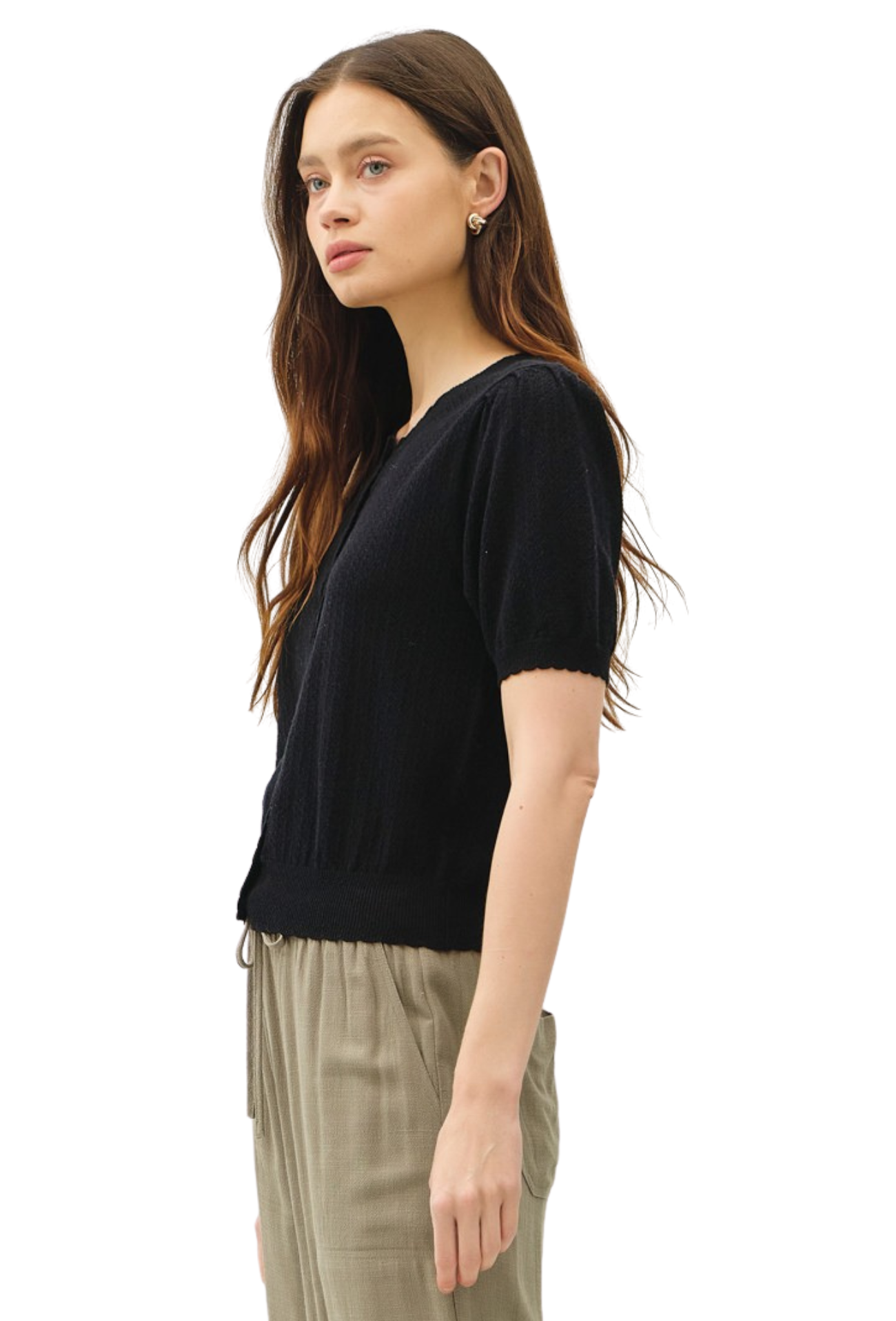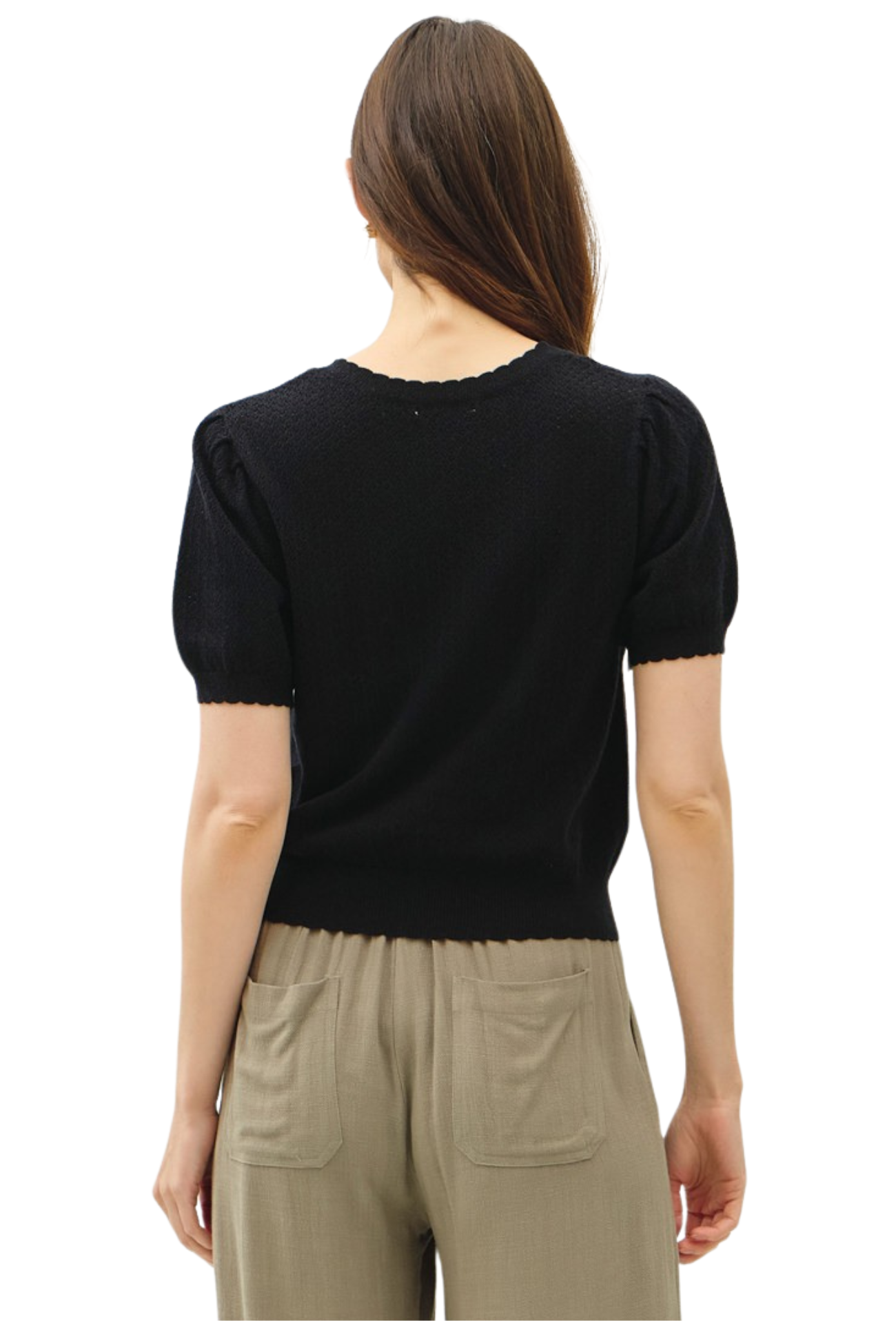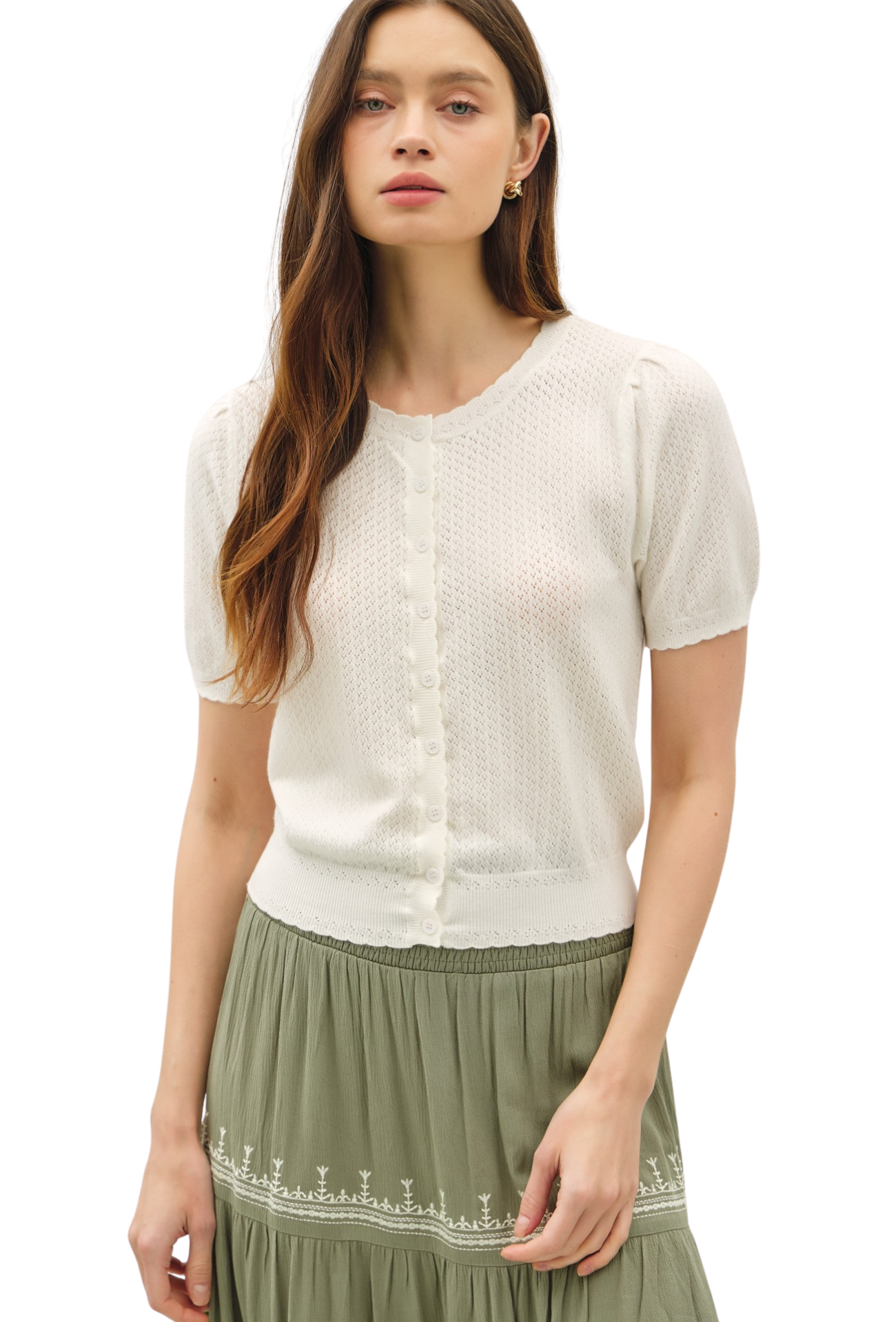 Effortlessly elevate your everyday wardrobe with this charming short-sleeve cardigan. Crafted from delicate pointelle knit, it offers a breathable, textured feel that's perfect for layering or wearing solo. The convenient button closure makes it easy to adjust your coverage throughout the day, while the refined construction ensures you'll reach for it season after season. Whether you're dressing up a casual outfit or adding polish to your work look, this versatile piece delivers comfort and style in one.