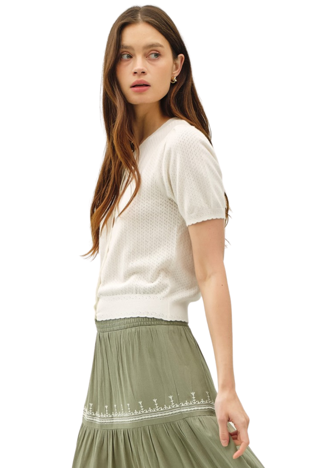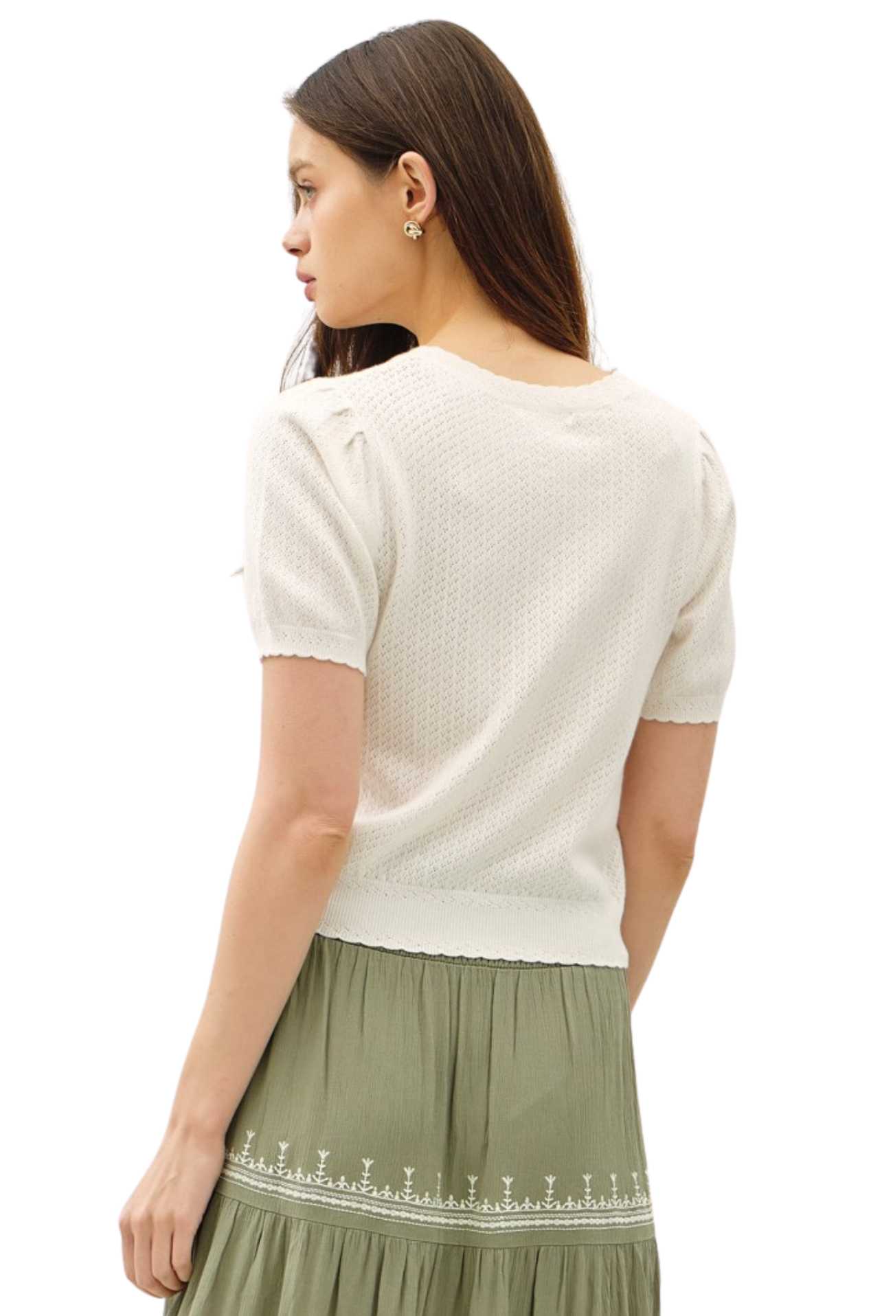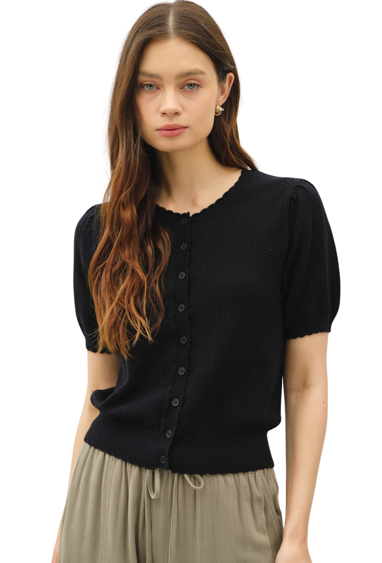 Effortlessly elevate your everyday wardrobe with this charming short-sleeve cardigan. Crafted from delicate pointelle knit, it offers a breathable, textured feel that's perfect for layering or wearing solo. The convenient button closure makes it easy to adjust your coverage throughout the day, while the refined construction ensures you'll reach for it season after season. Whether you're dressing up a casual outfit or adding polish to your work look, this versatile piece delivers comfort and style in one.