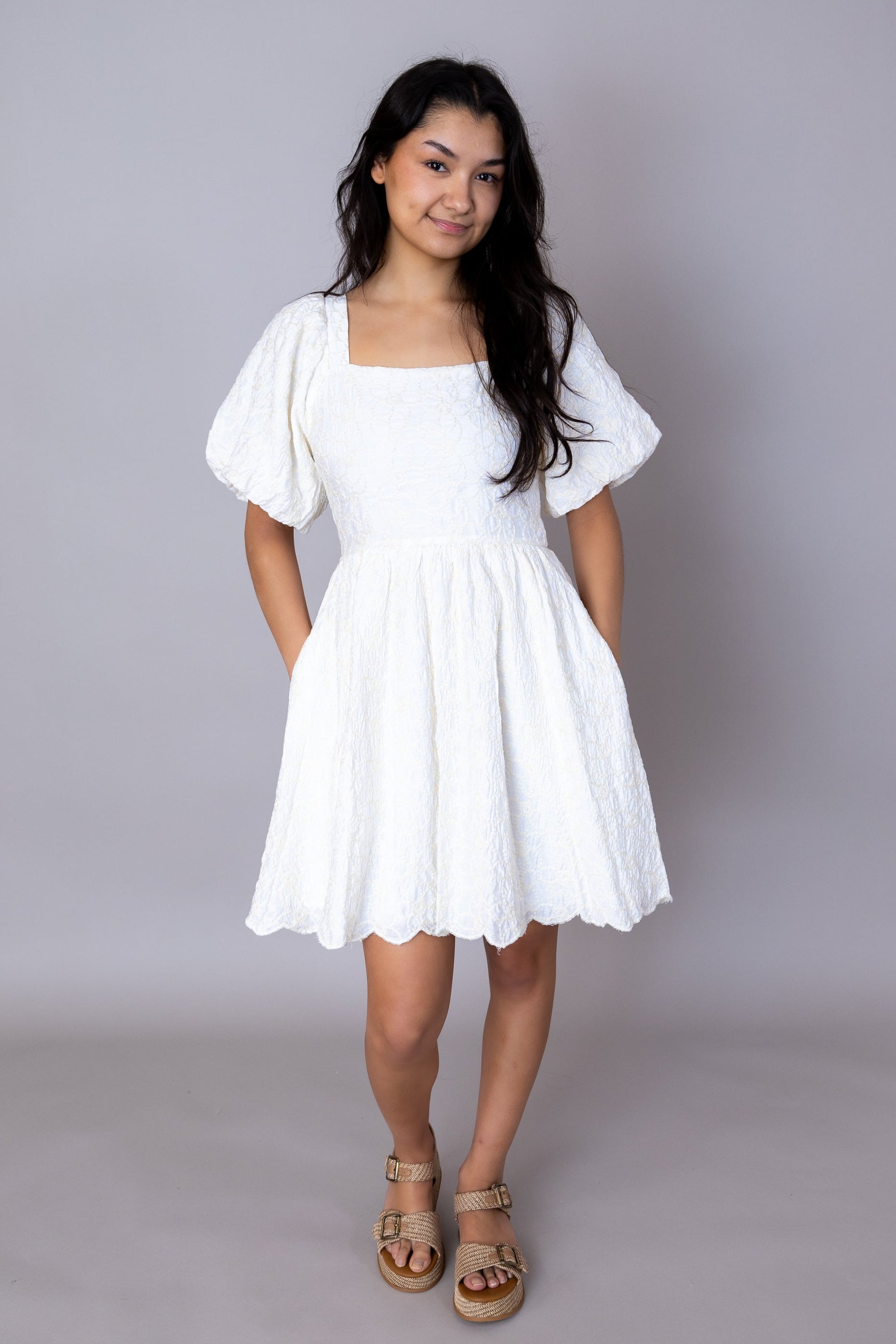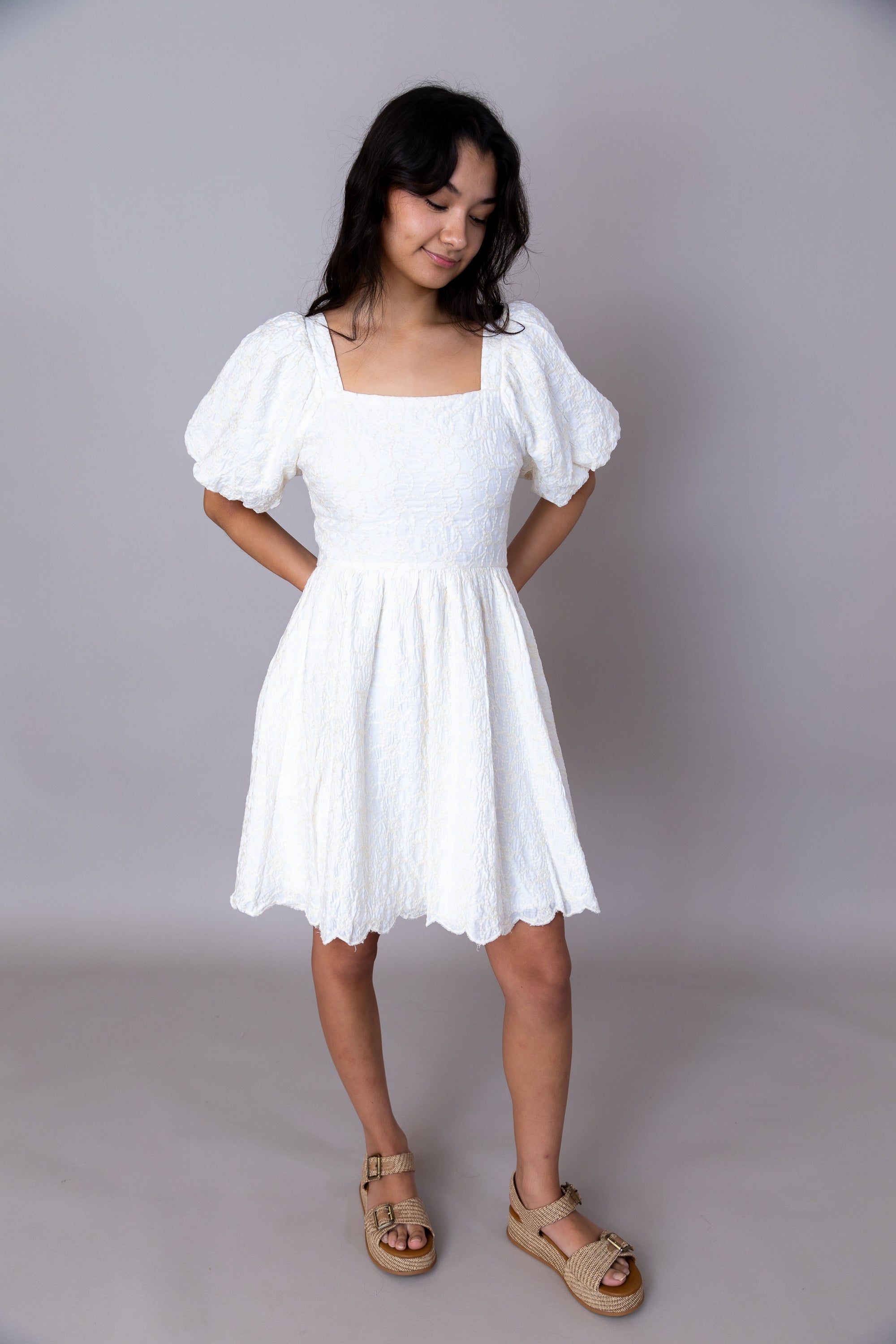 The Prim & Proper Dress delivers vintage charm with modern practicality. Featuring a graceful square neckline and voluminous puff sleeves that frame the shoulders beautifully, this dress combines romantic details with a flattering fit-and-flare silhouette. The convenient zipper closure ensures easy dressing, while the structured, non-stretch fabric provides a polished, tailored appearance that holds its shape throughout the day. Perfect for the girlies who are ready for spring weather!