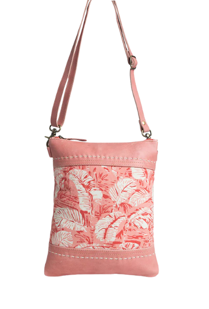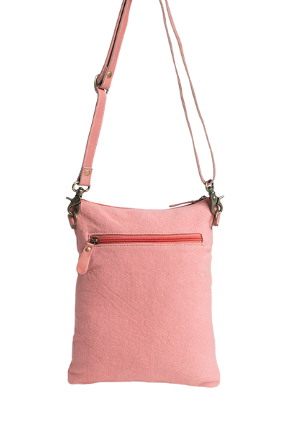 Soft hues and rustic charm come together in this Western crossbody bag, featuring a serene flower-printed cotton design in delicate pinks and reds. The sunrise pink genuine leather accents add a touch of elegance, stitched to perfection for a refined finish. Crafted from 100% cotton up-cycled canvas, it offers durability with a lightweight feel. A woven canvas back with an extra pocket, plus an inside zipper pocket and phone compartment, keep essentials within reach. The detachable, adjustable leather strap makes it a versatile Western style crossbody purse for any occasion!