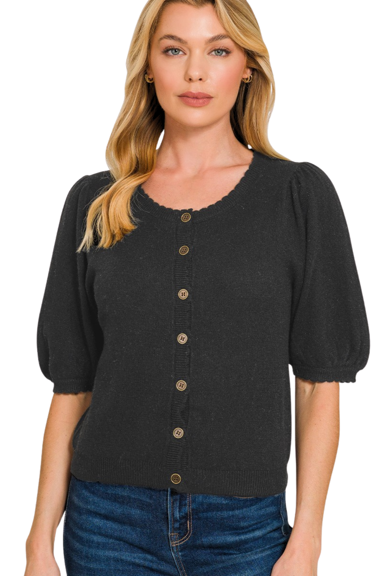 Embrace effortless charm with this delightful short-sleeve cardigan, designed to refresh your everyday wardrobe. Featuring romantic puff sleeves that add a touch of whimsy and a convenient button closure for easy layering, this piece transitions seamlessly from season to season. Perfect for pairing over your favorite tees or dresses, it's the versatile staple that brings both style and comfort to any outfit. A fresh start has never looked so adorable.